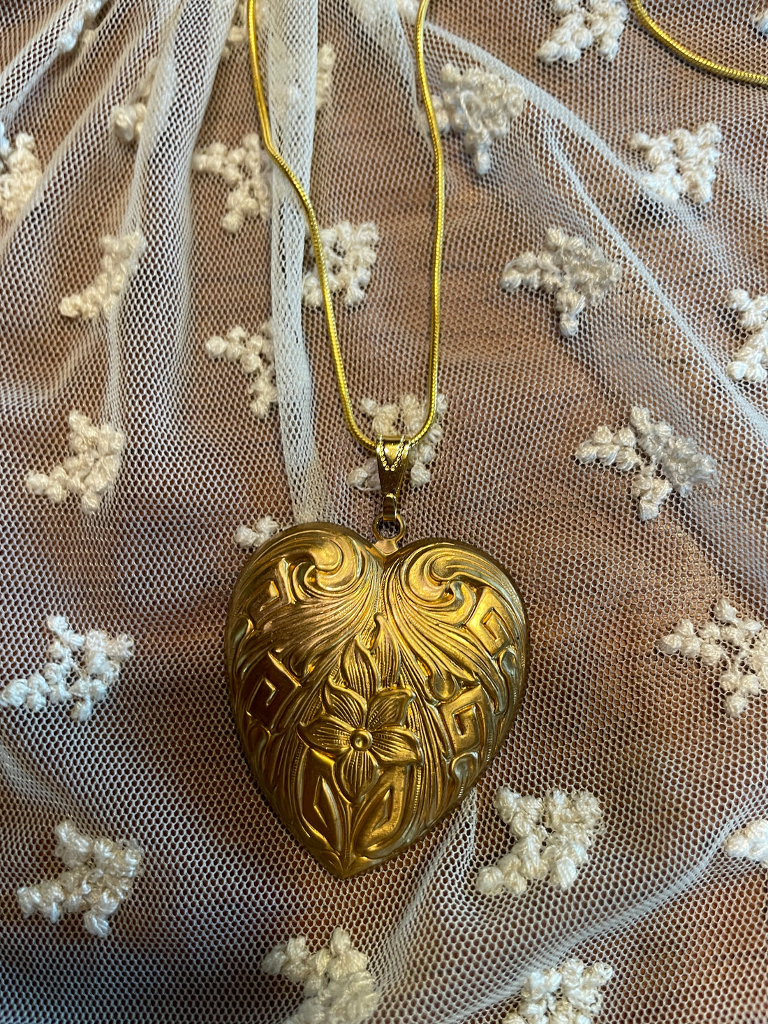 80s Vintage Gold Tone Metal Floral Heart Pendant Necklace