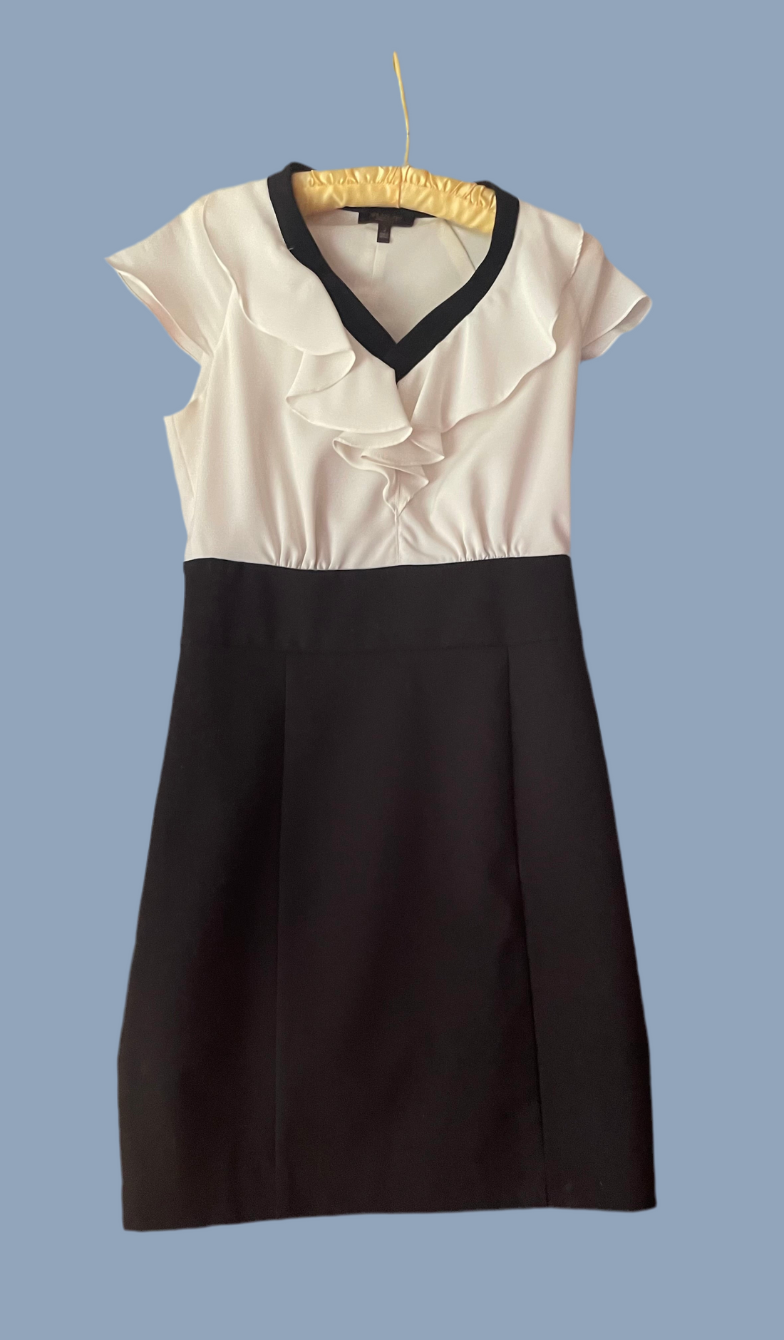 90s Black White Ruffled Poly Cap Sleeve Dress Sm
