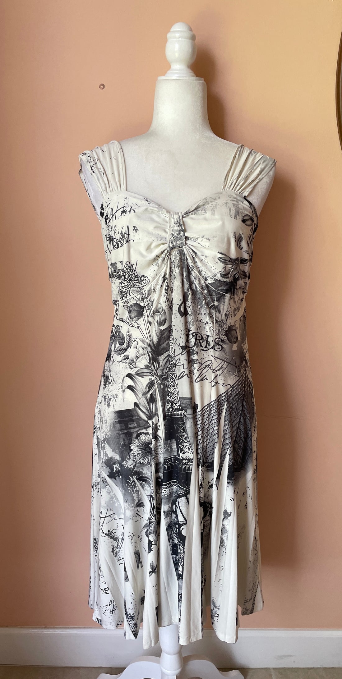 A Day in Paris 90s Vintage Poly Stretch Abstract  Eiffel Tower Floral Novelty Dress. S/M