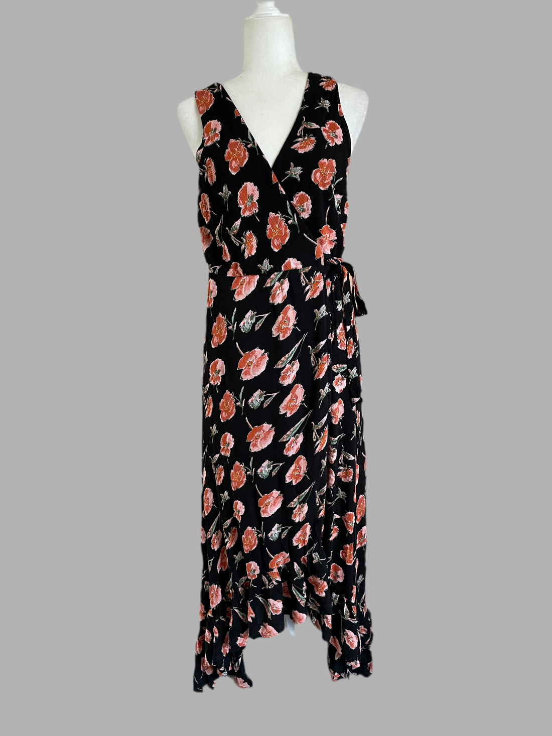 90s Vintage Floral Print Vintage Black Ruffled Wrap Sleeveless Dress M