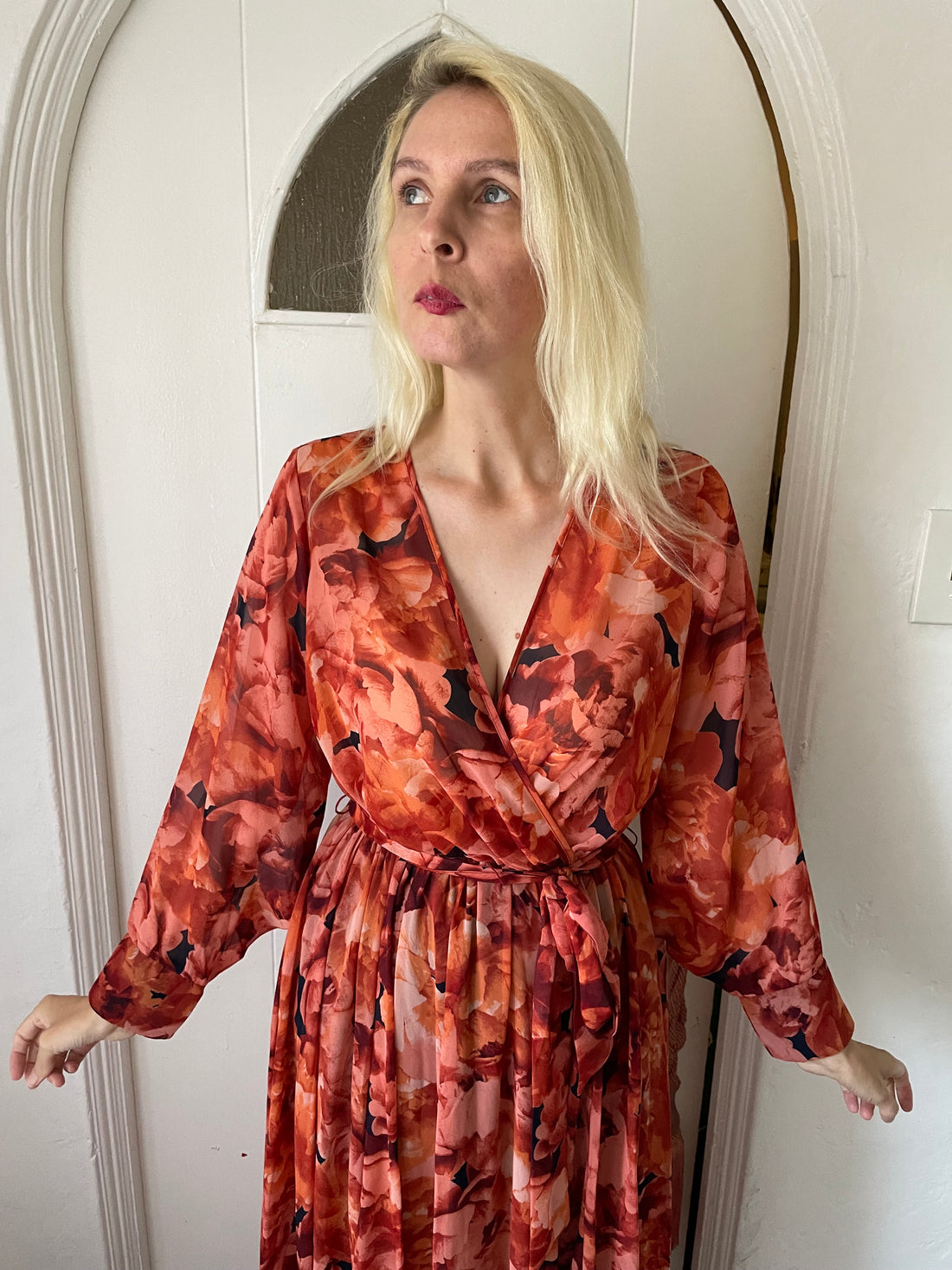 2000s Sheer Poly Lined V Neck Floral Maxi Dress M