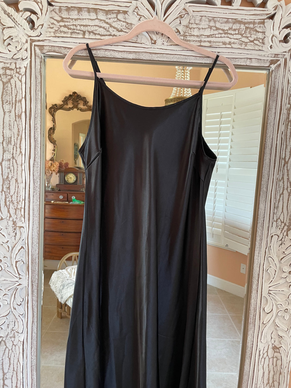2000s Black Silky Poly Lingerie Lounge Maxi Slip Dress M