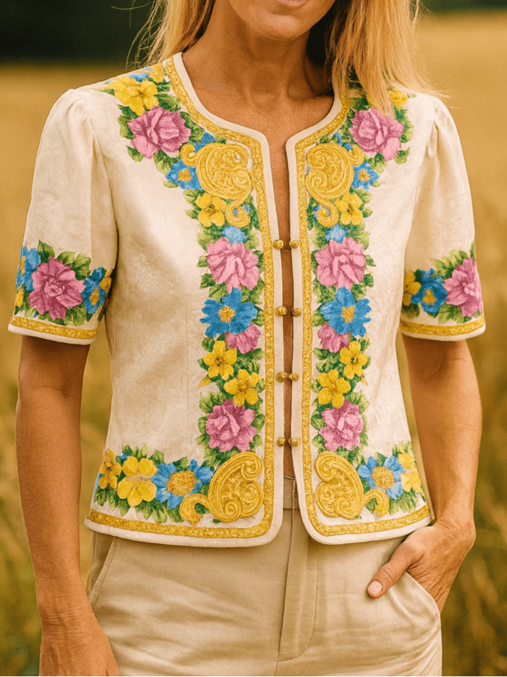 Vintage Classic White Decorative Golden Cuffed Blouse S/M