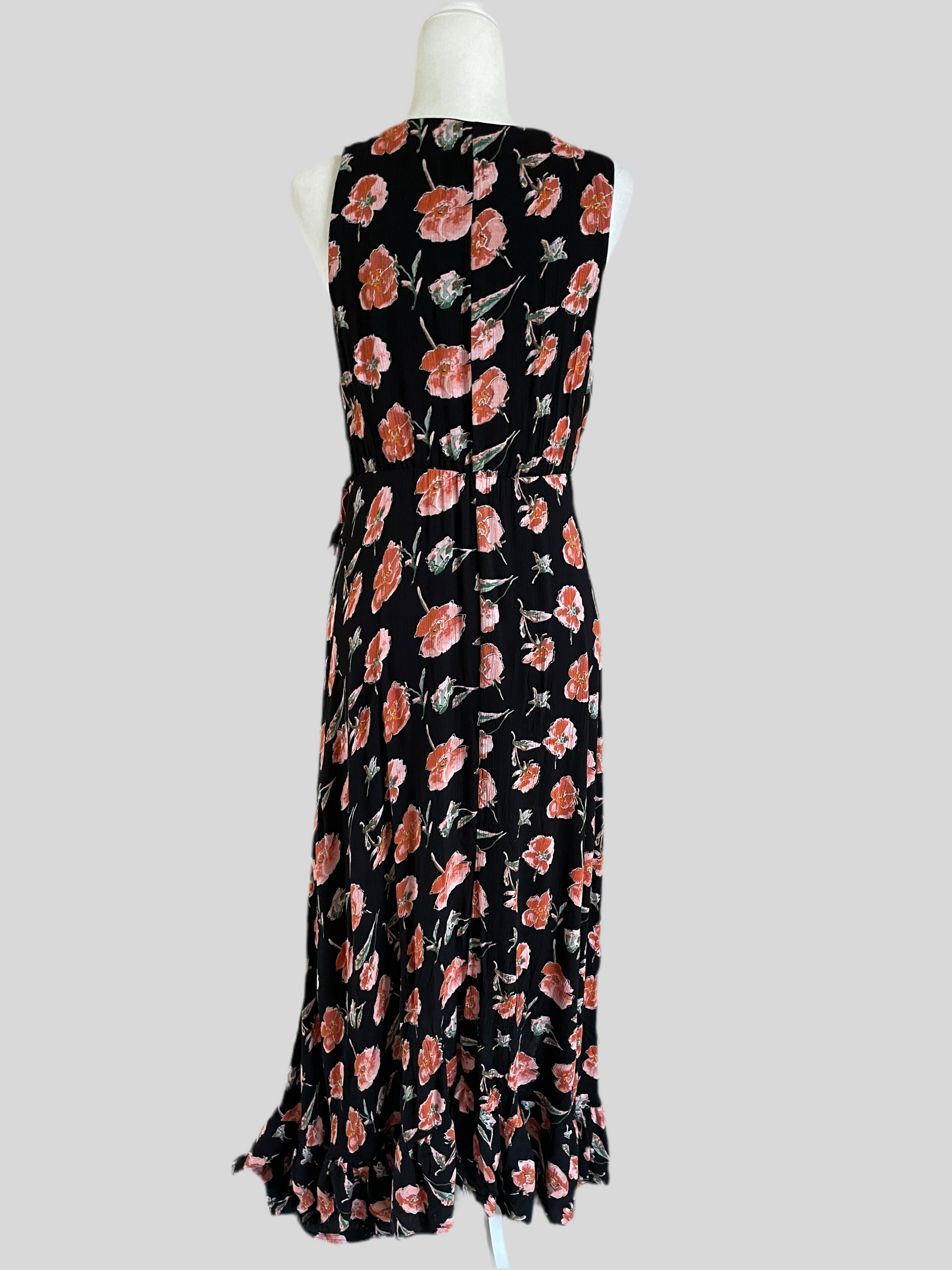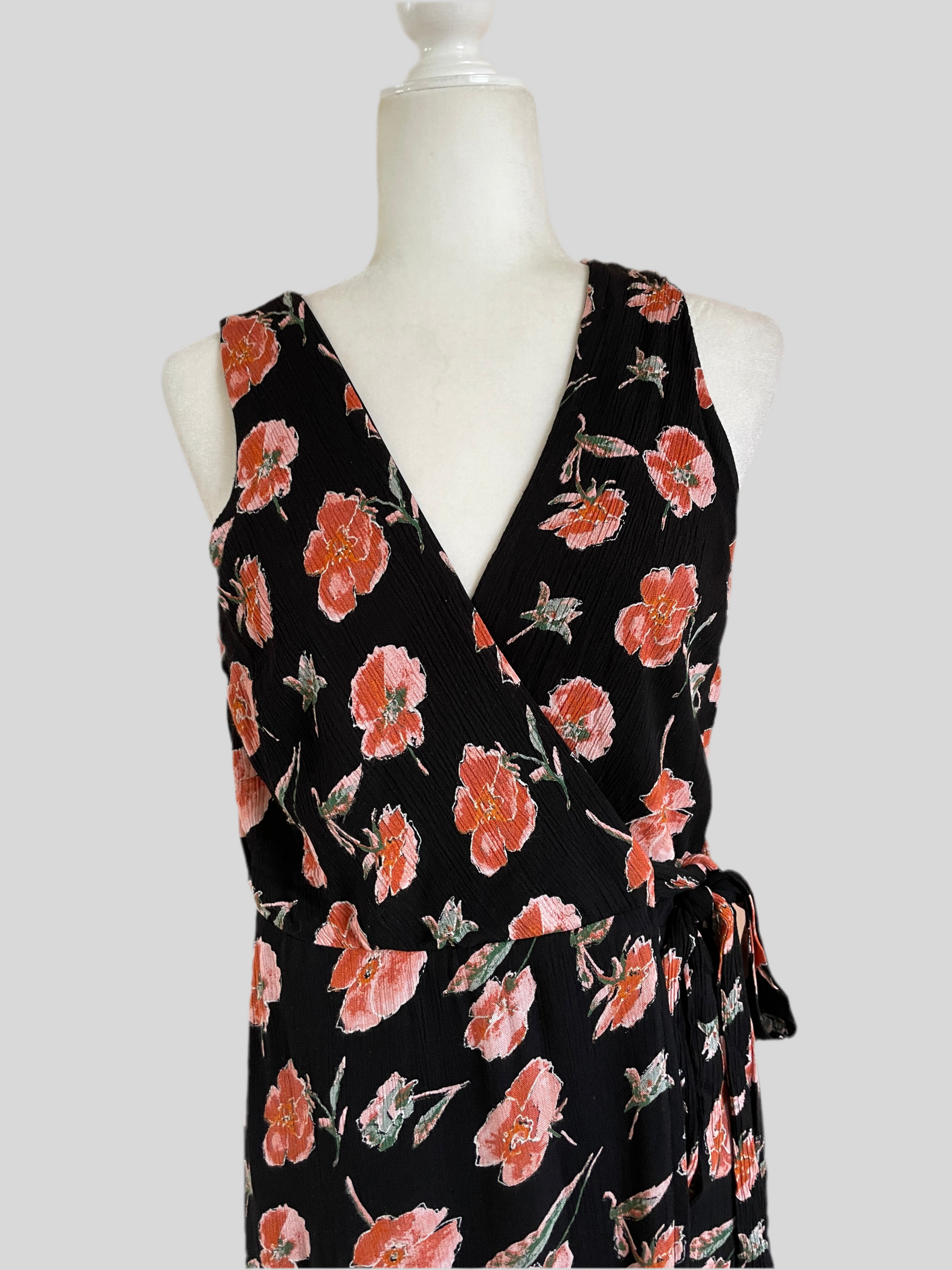 A black sleeveless wrap dress sprinkled with flowers and finished with soft ruffles for an easy, feminine silhouette.