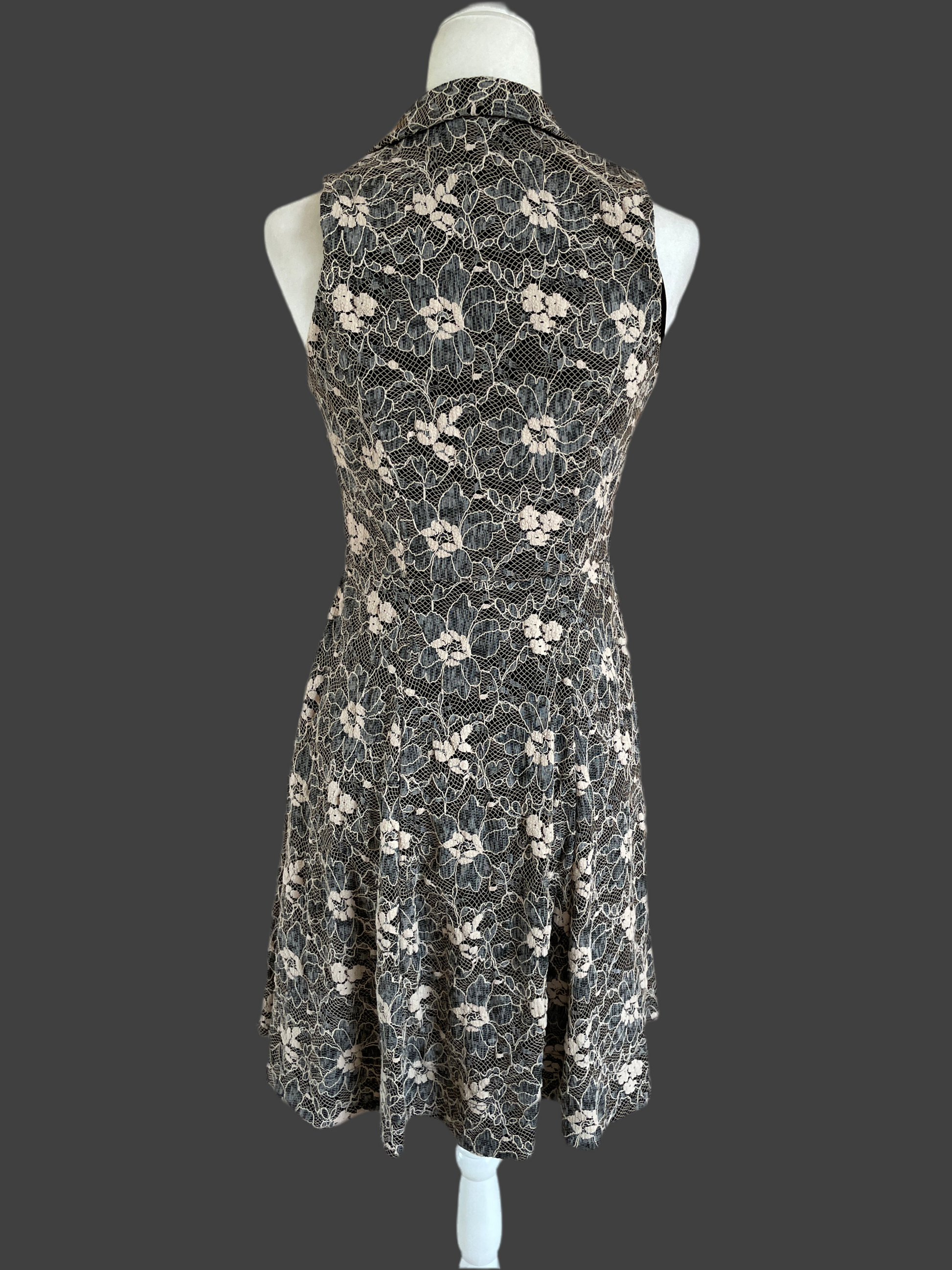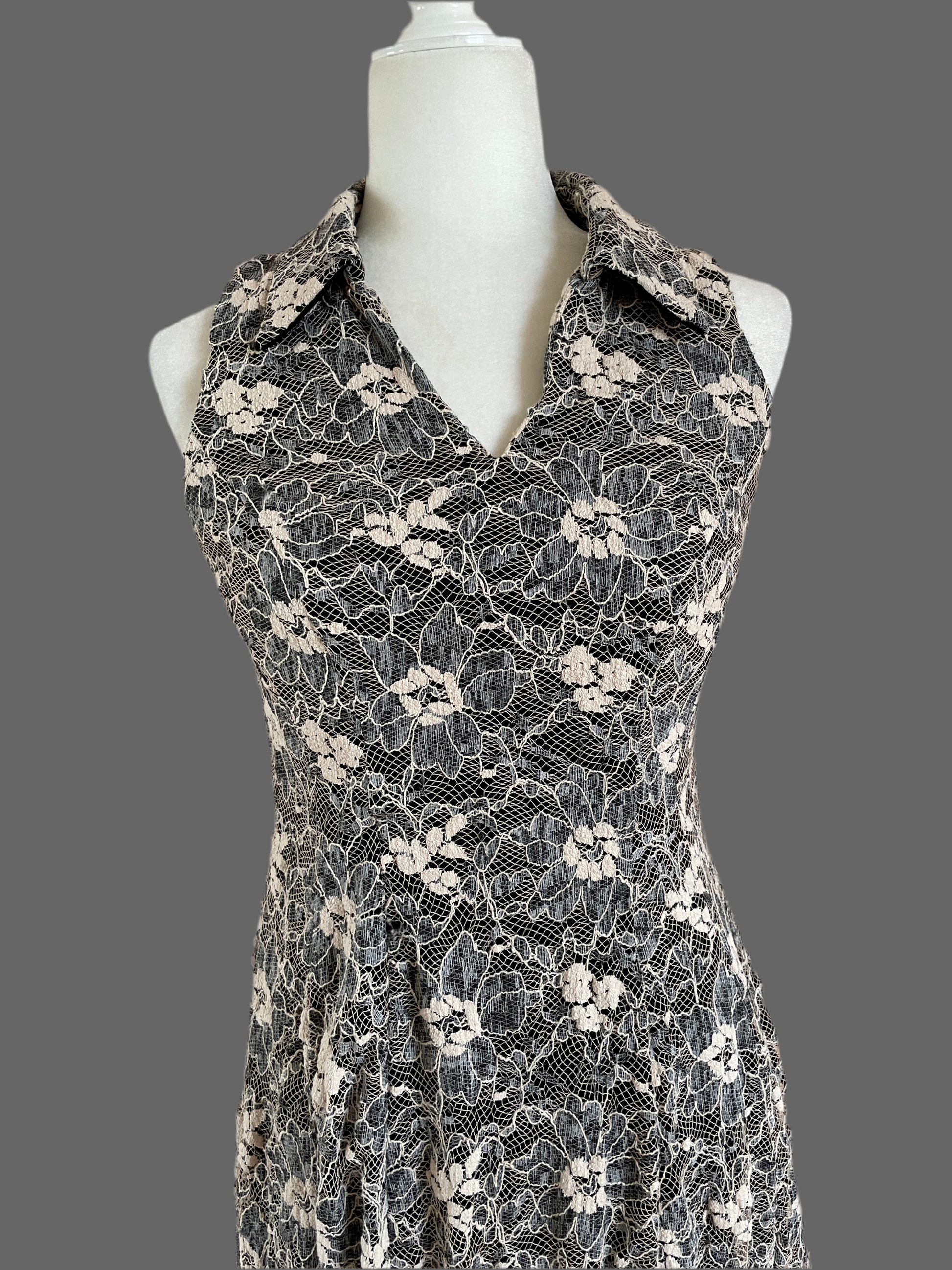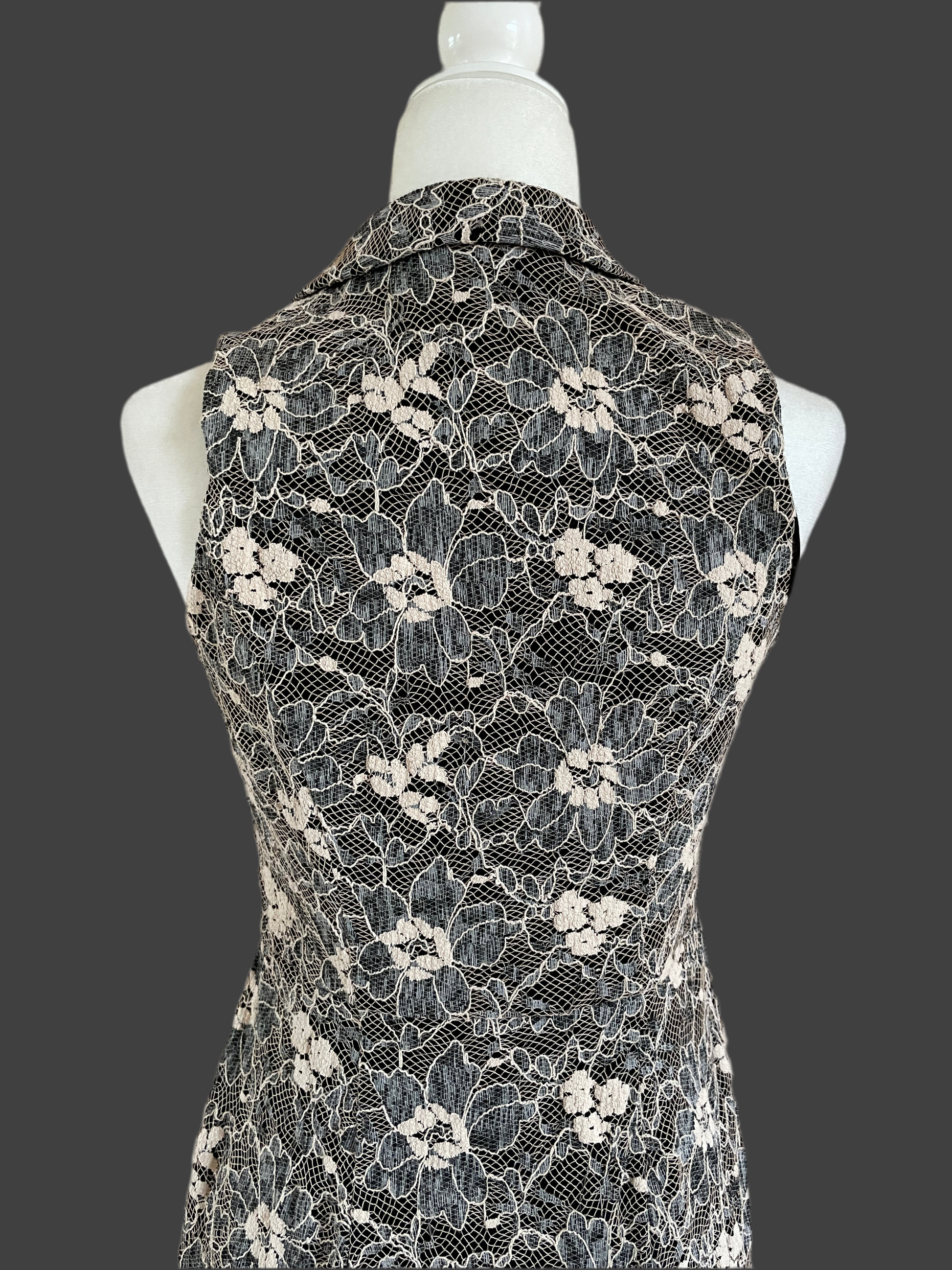 An easy sleeveless dress layered in floral lace that moves from brunch to evening with effortless poise.