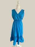 A 2000s sleeveless cotton dress in a striking ocean hue with soft ruffles that dance as you move.