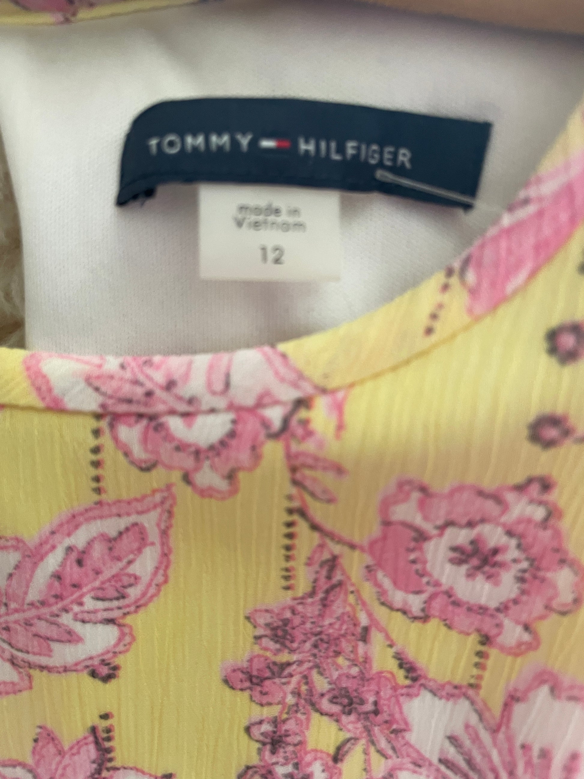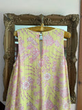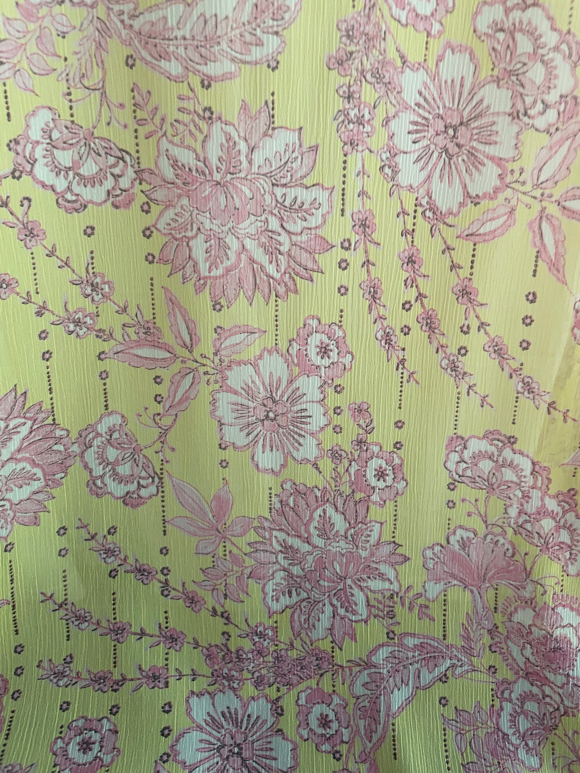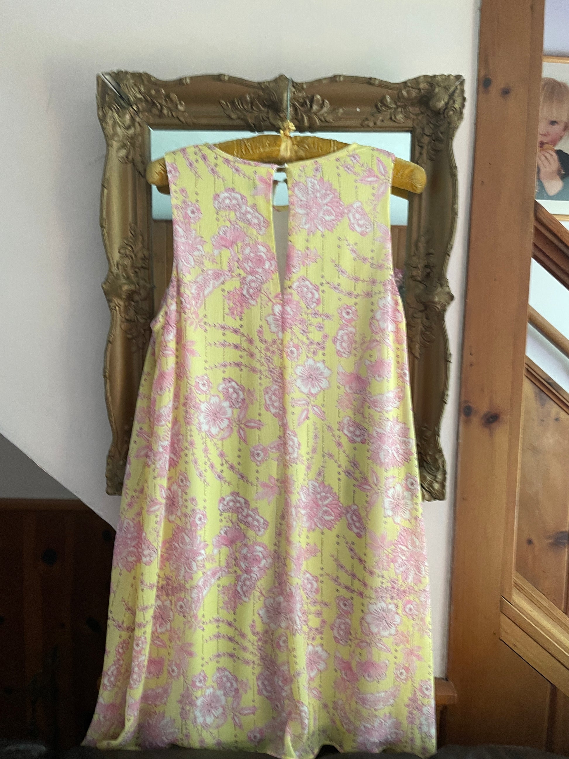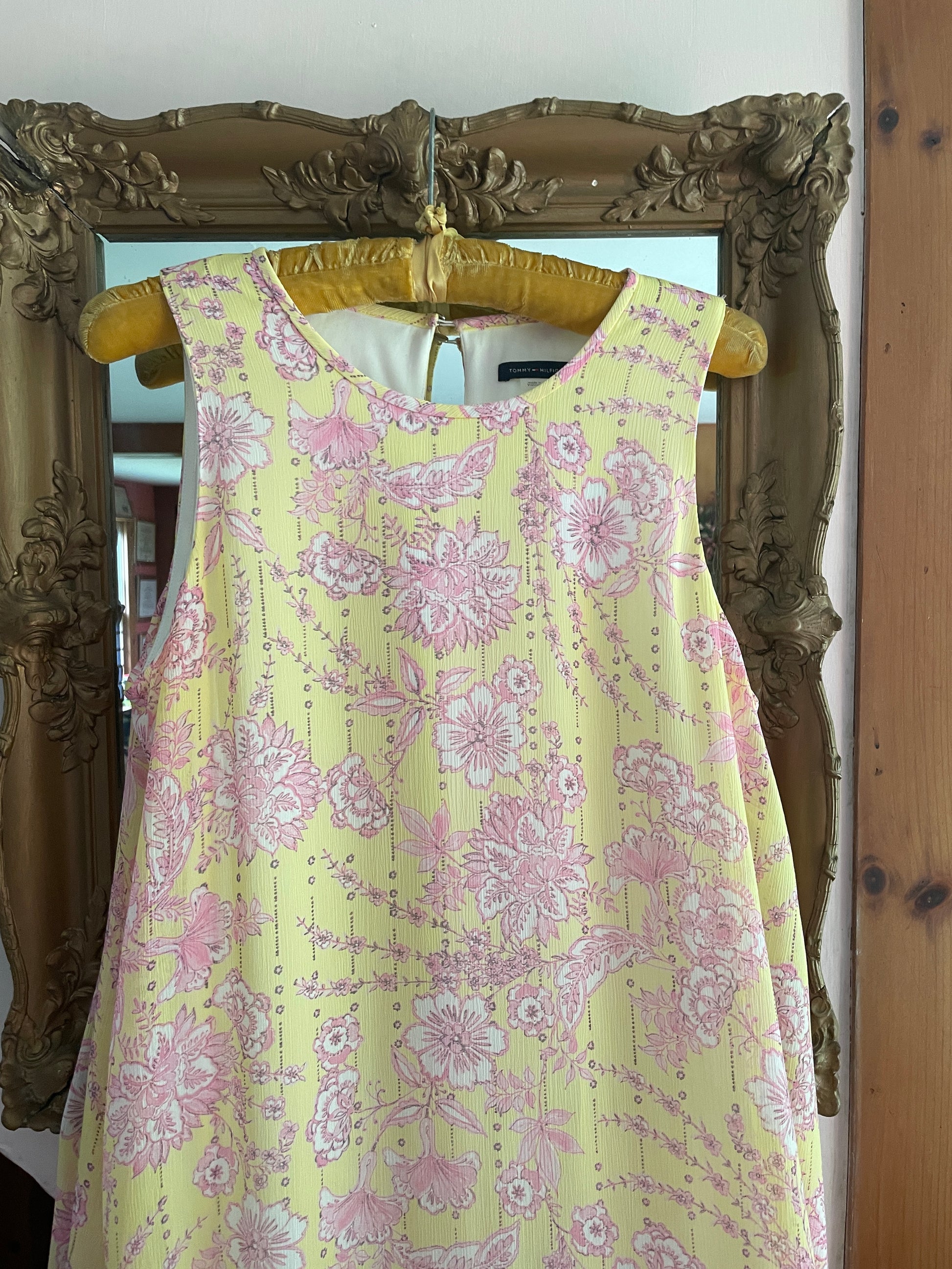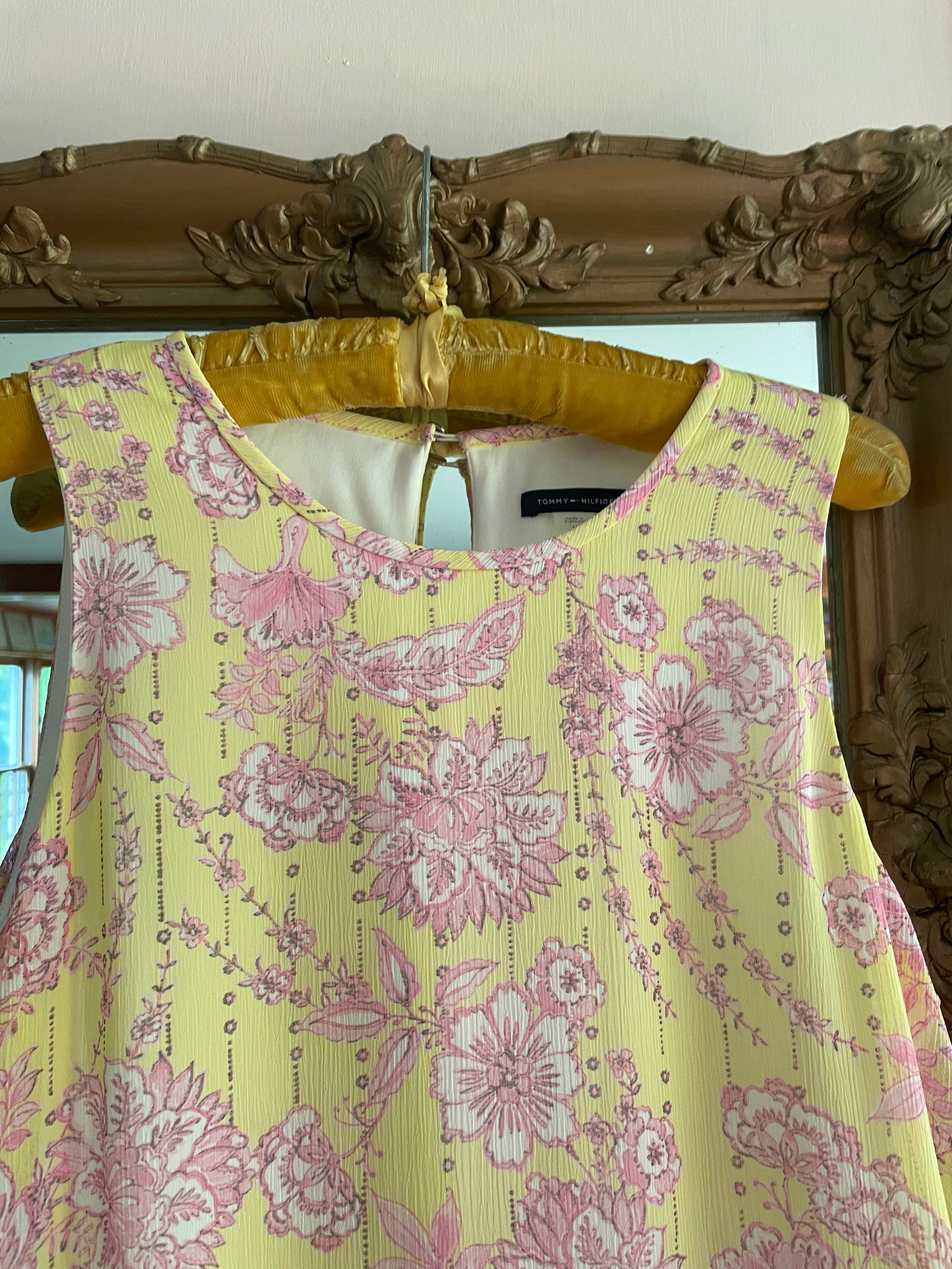 2000s Yellow Pink Floral Print Poly Sleeveless Summer Dress M