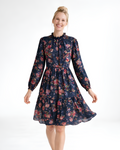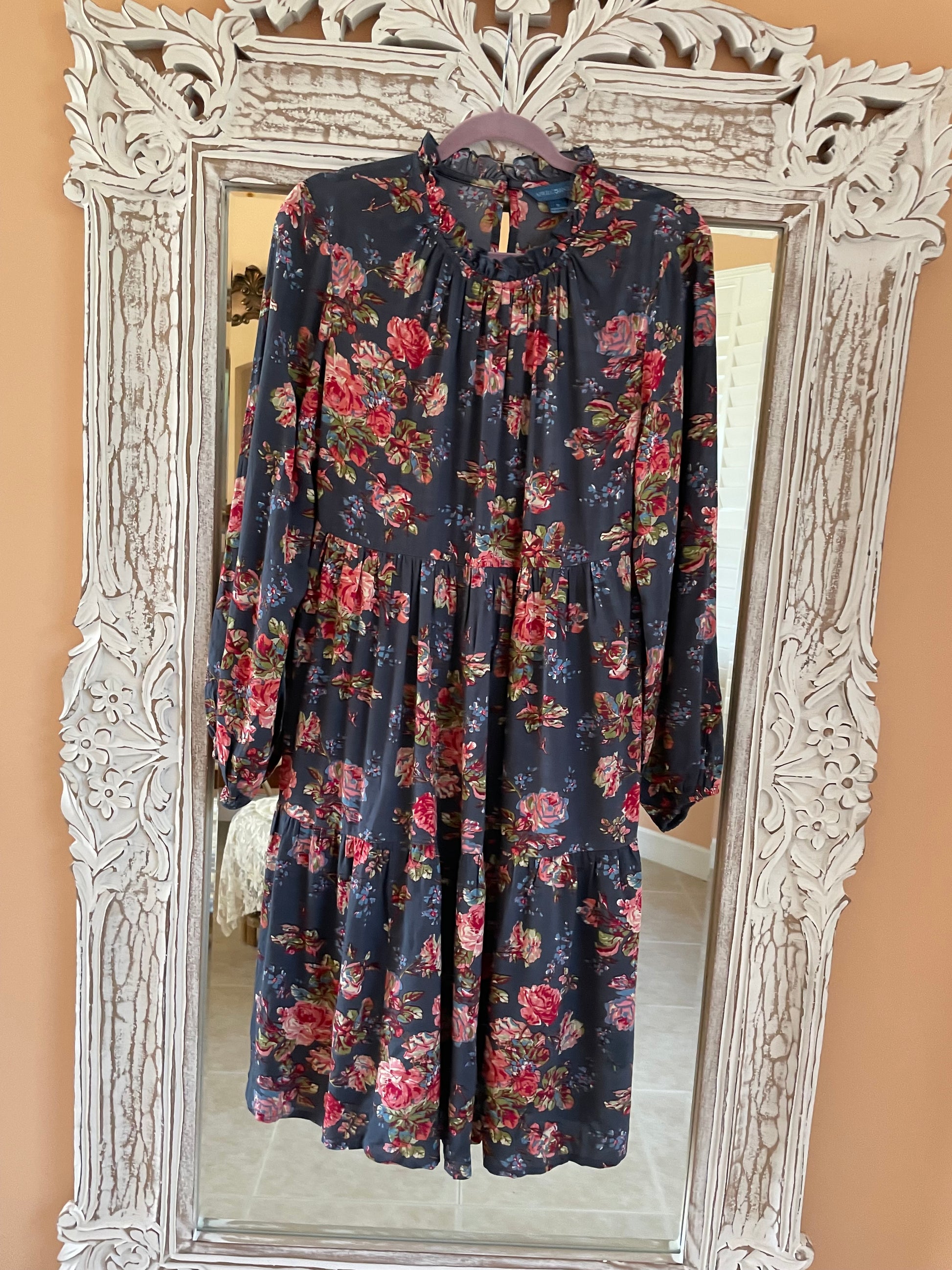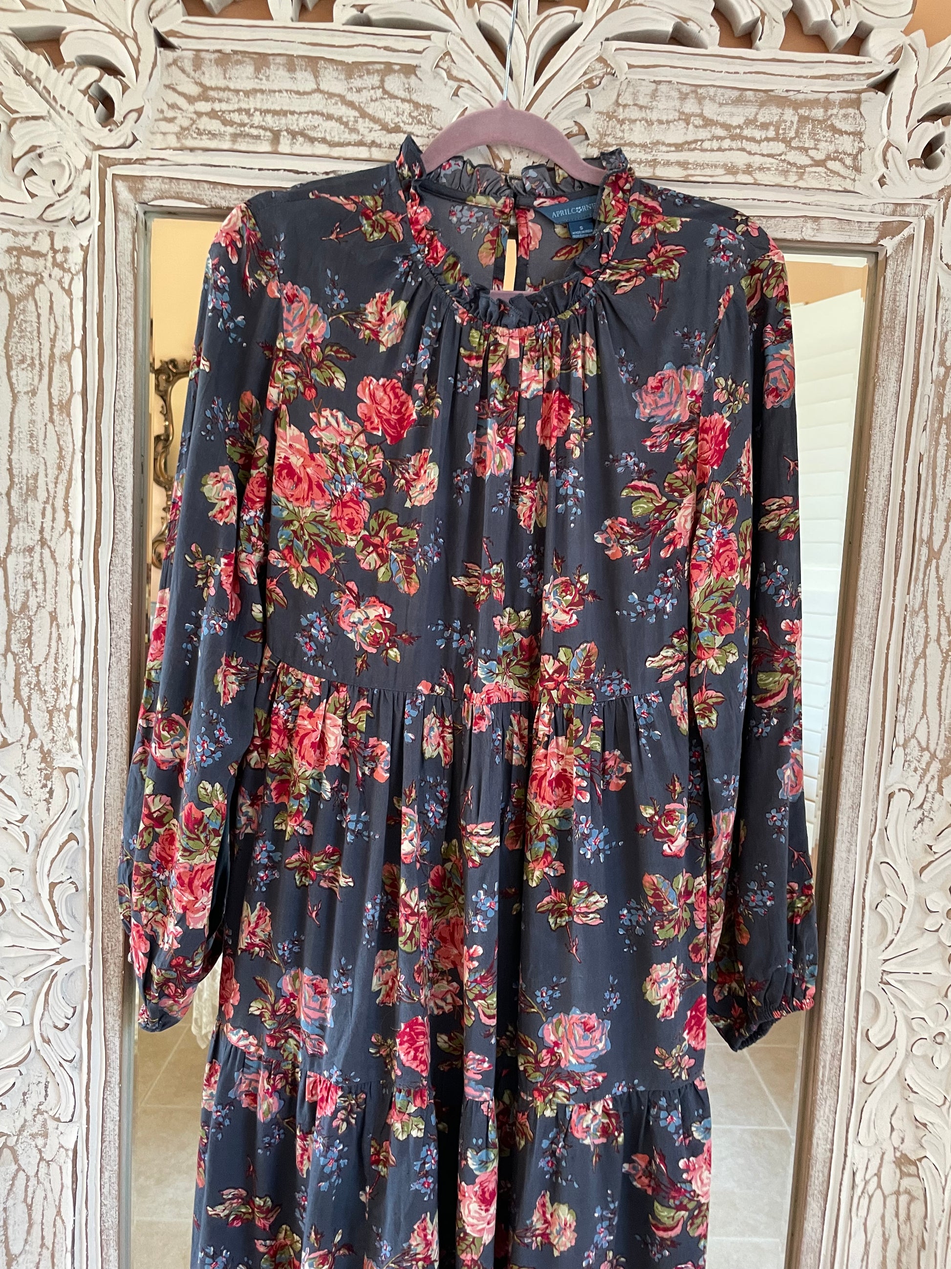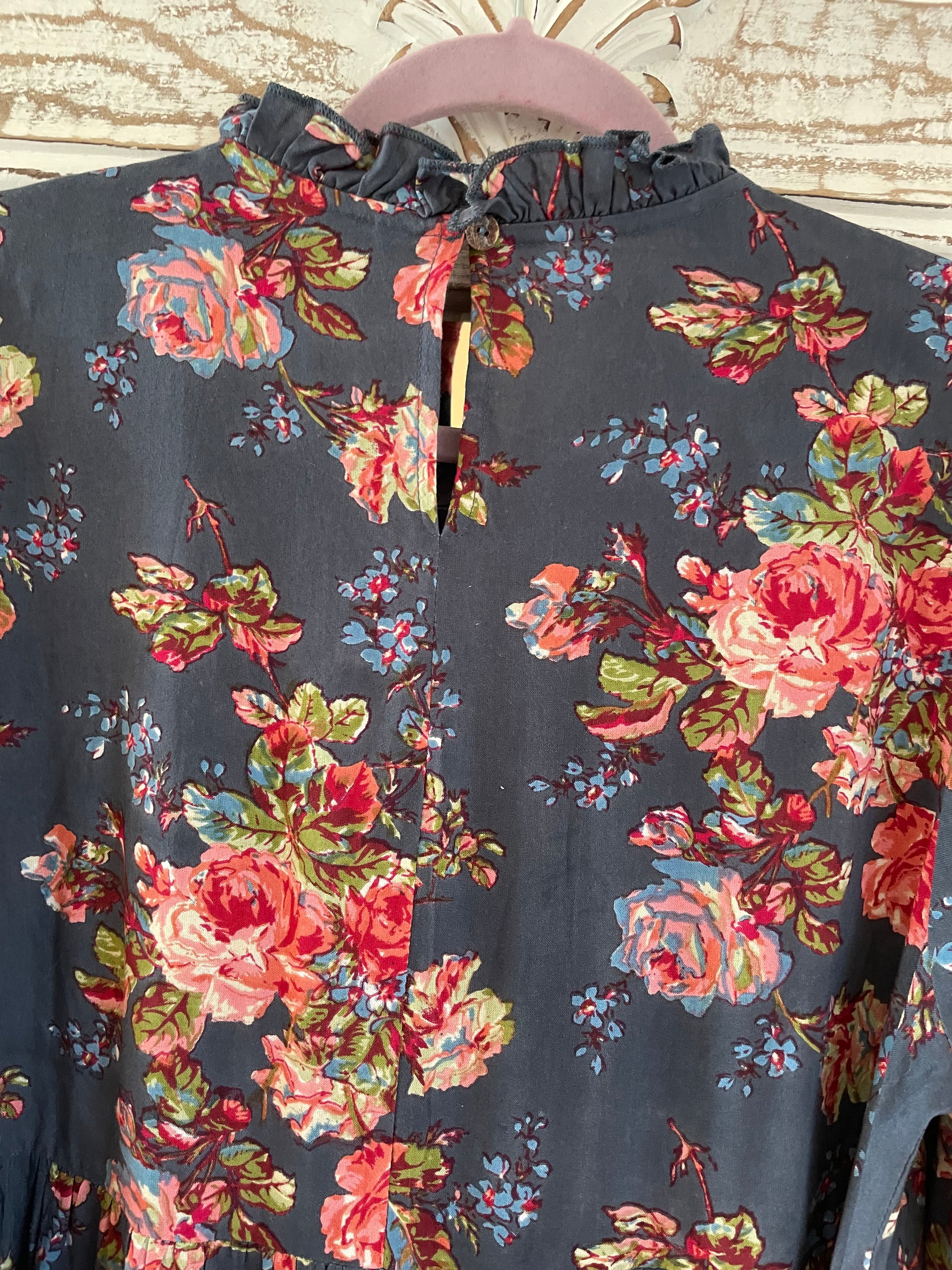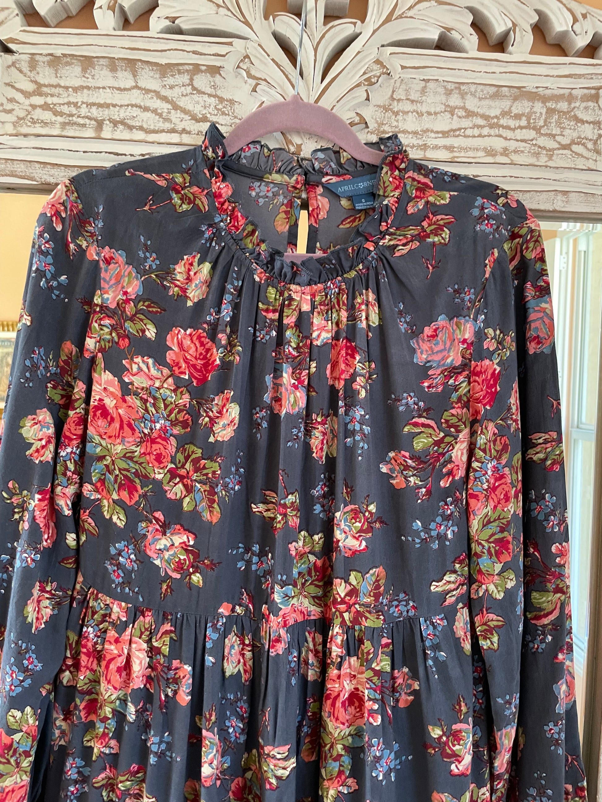 Pullover style with button loop closure & peephole on back neck. Elastic sleeve bottom. Ruffled collar. Pretty floral dresses April Cornell dresses