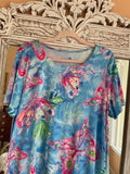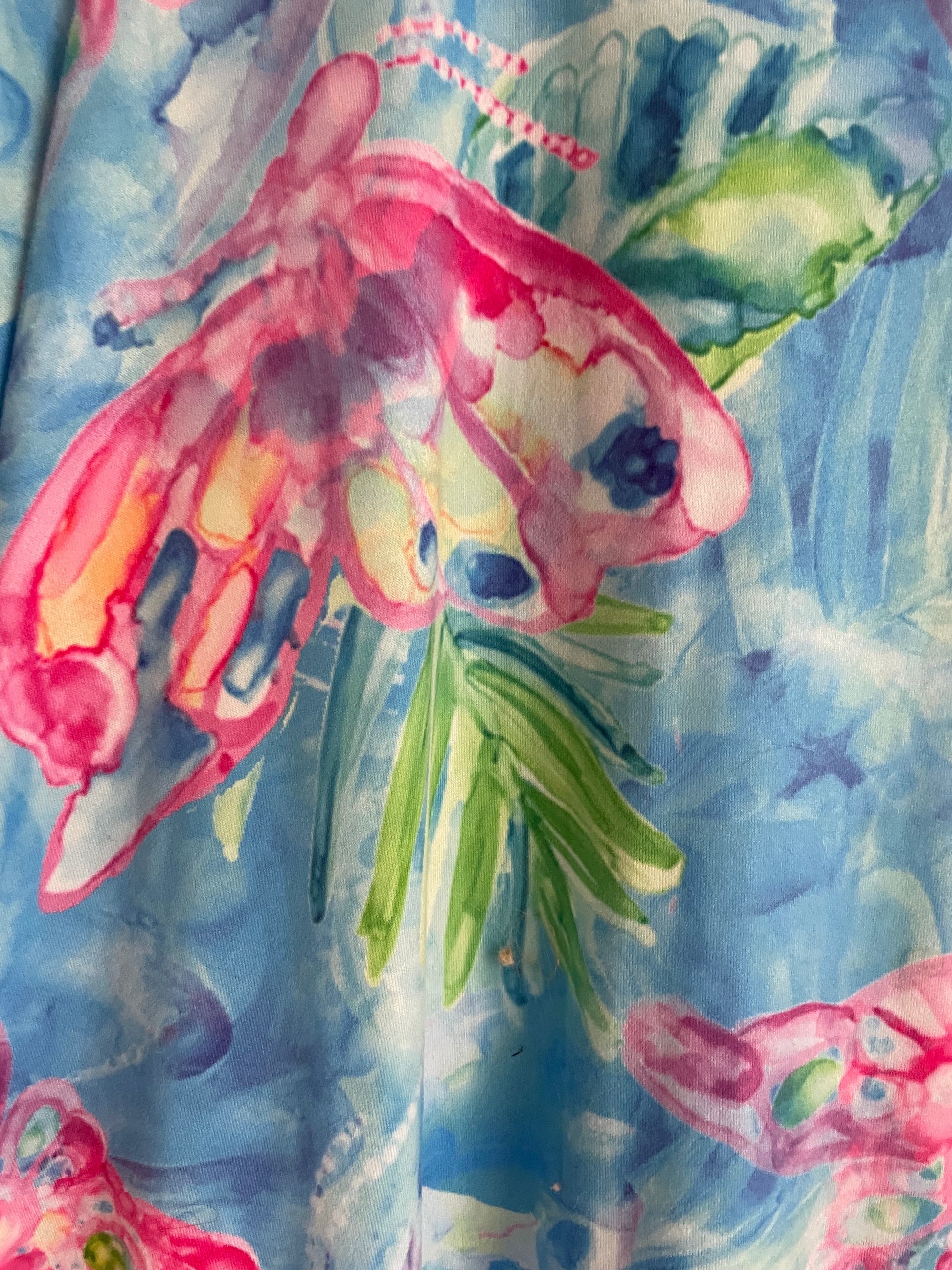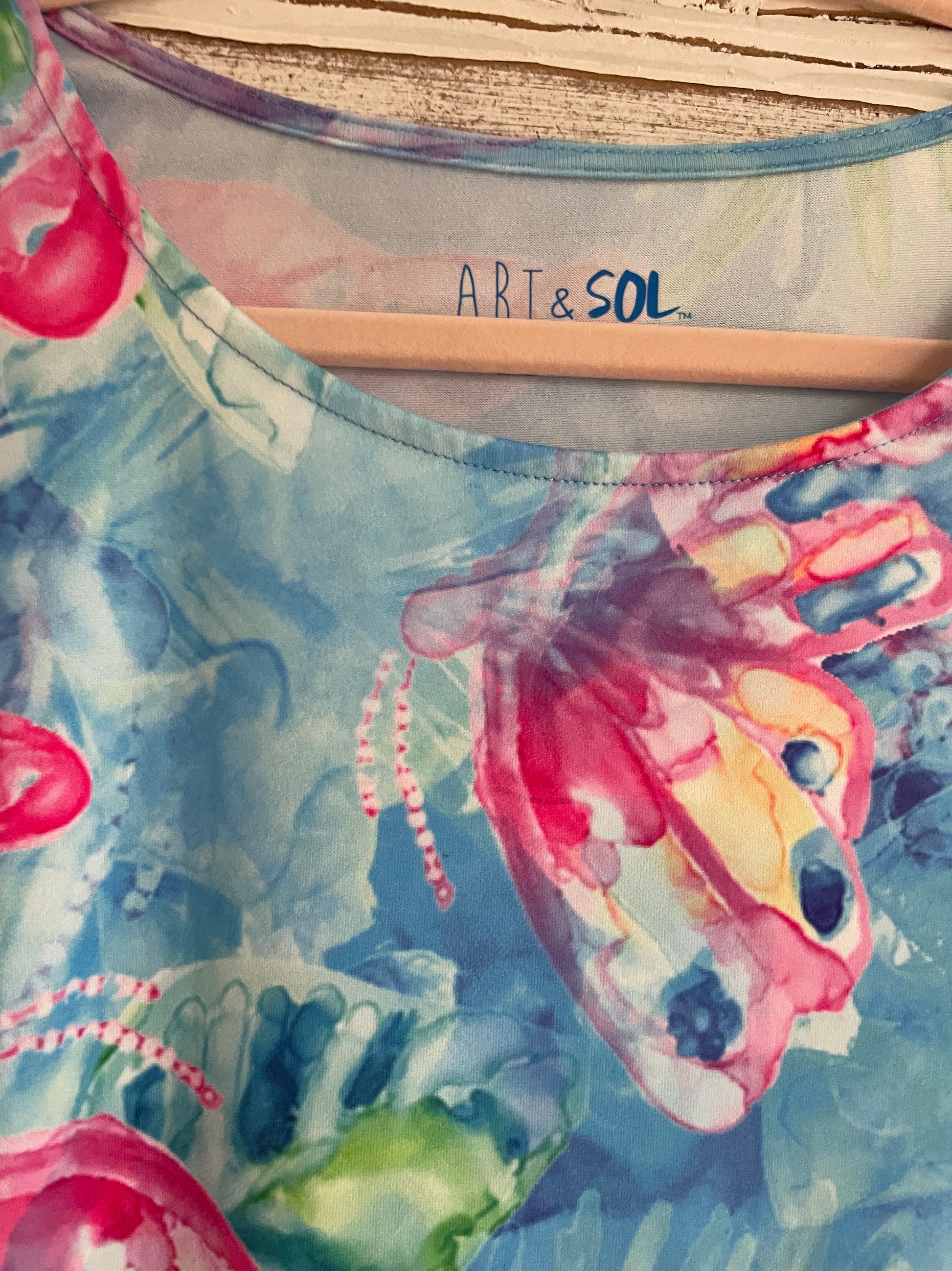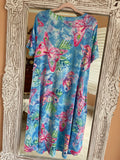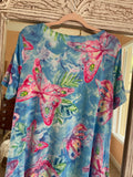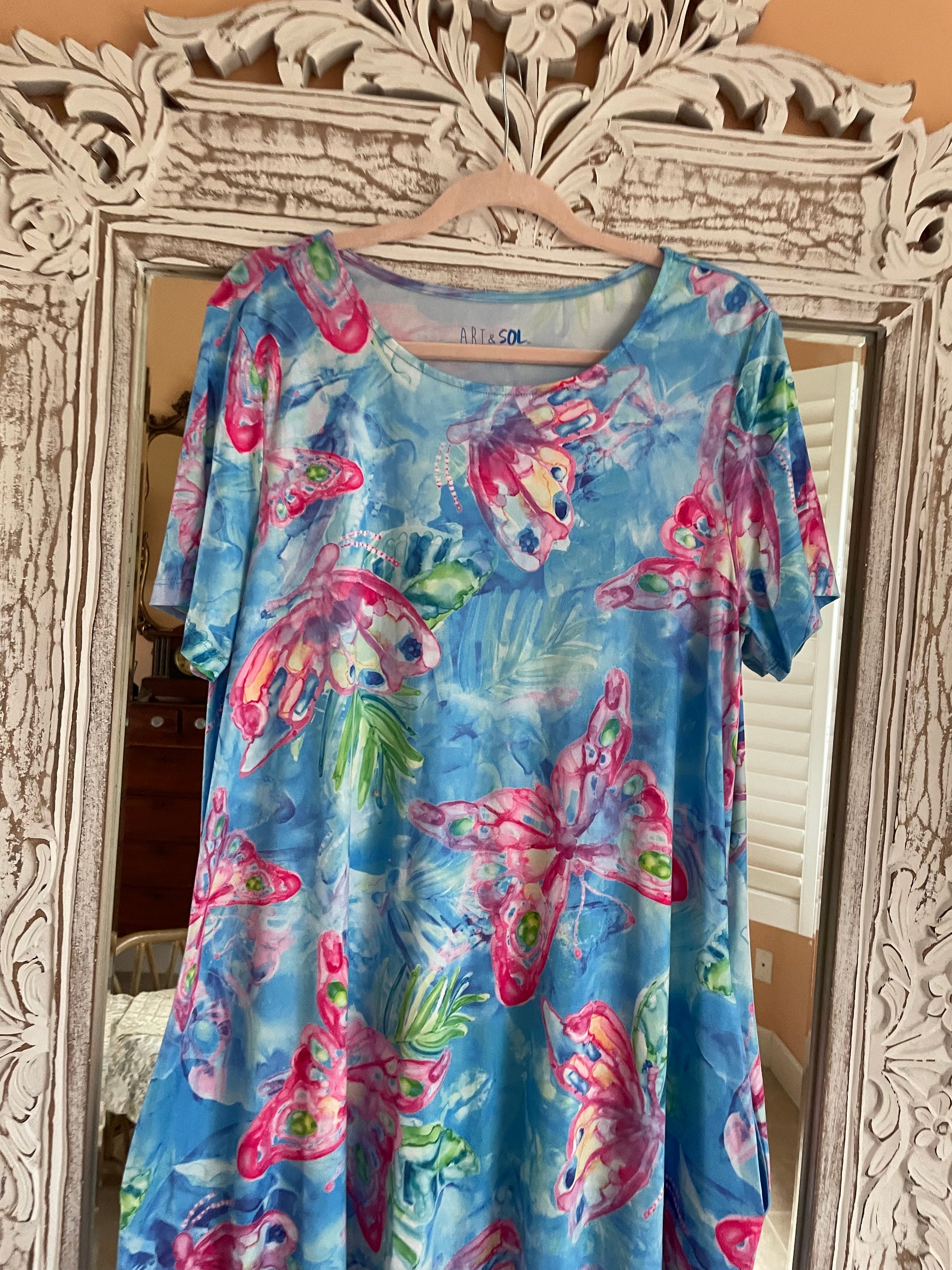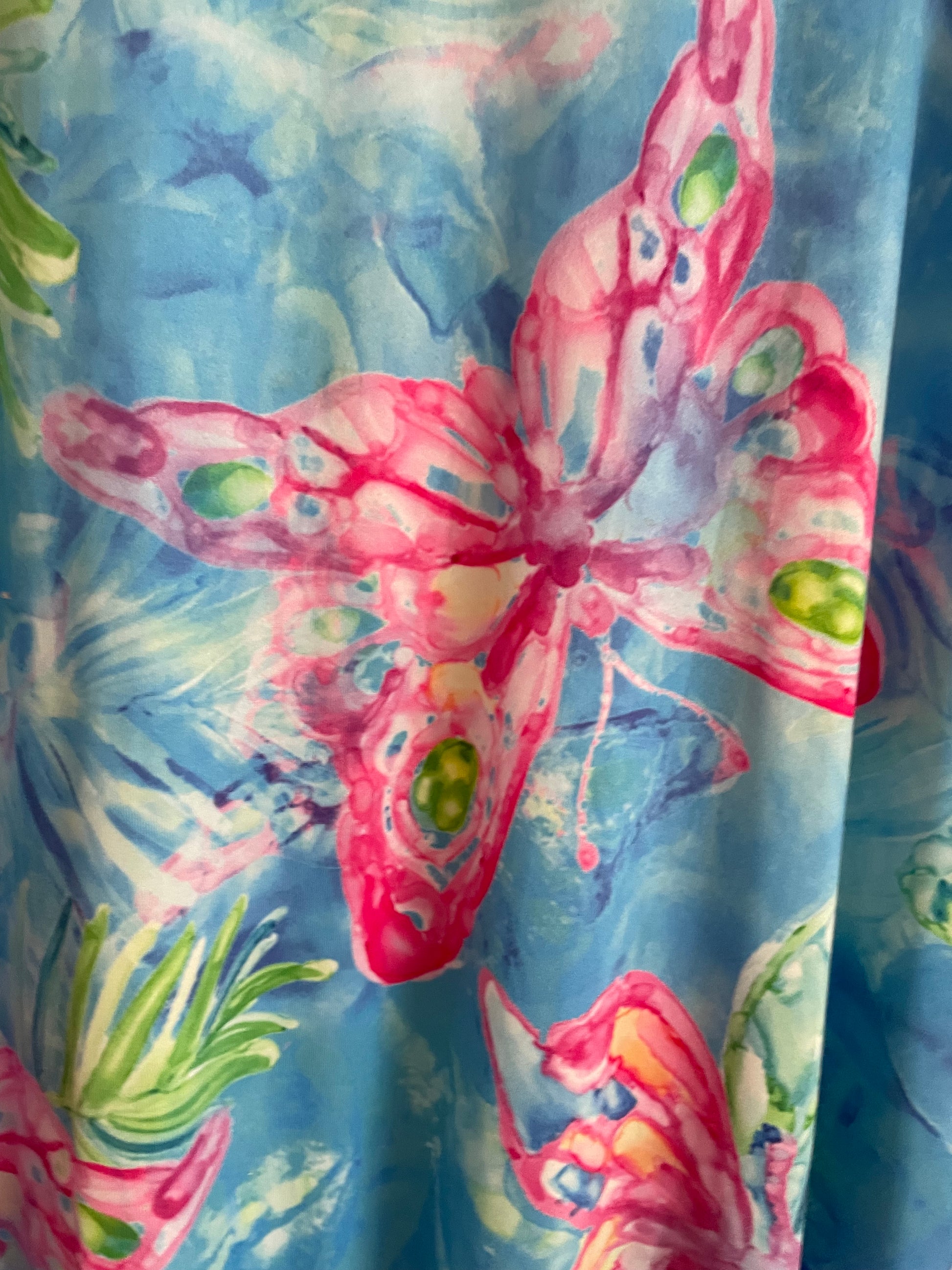 Soft poly fabric. Shades of blues & pinks. High low length longer in back. Pockets. Fantastic butterfly print. Resort Beach casual.