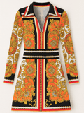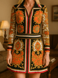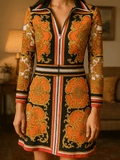 2000s Colorful Striking Print Poly Collar V Neck Pullover Short Dress S/M