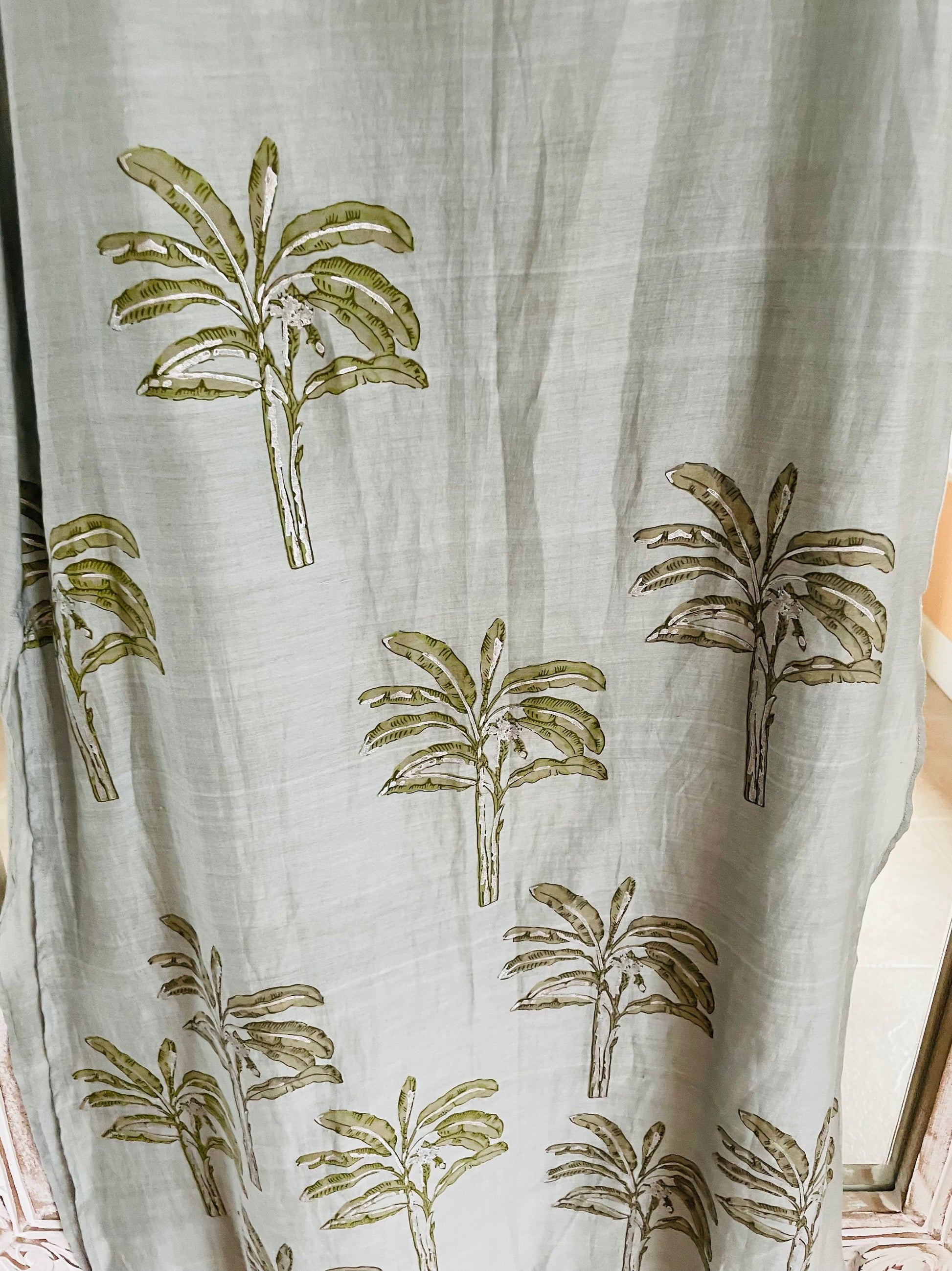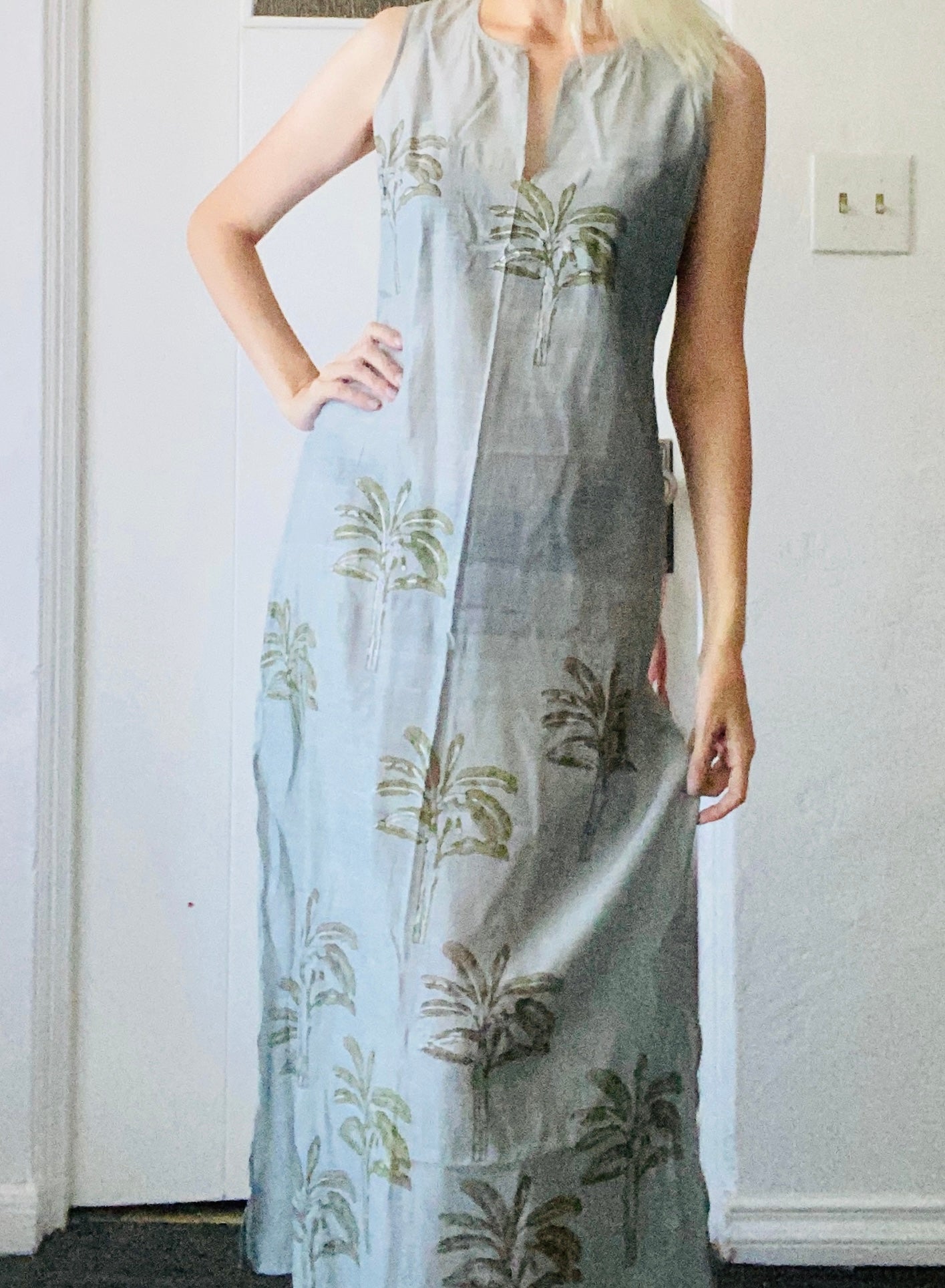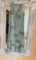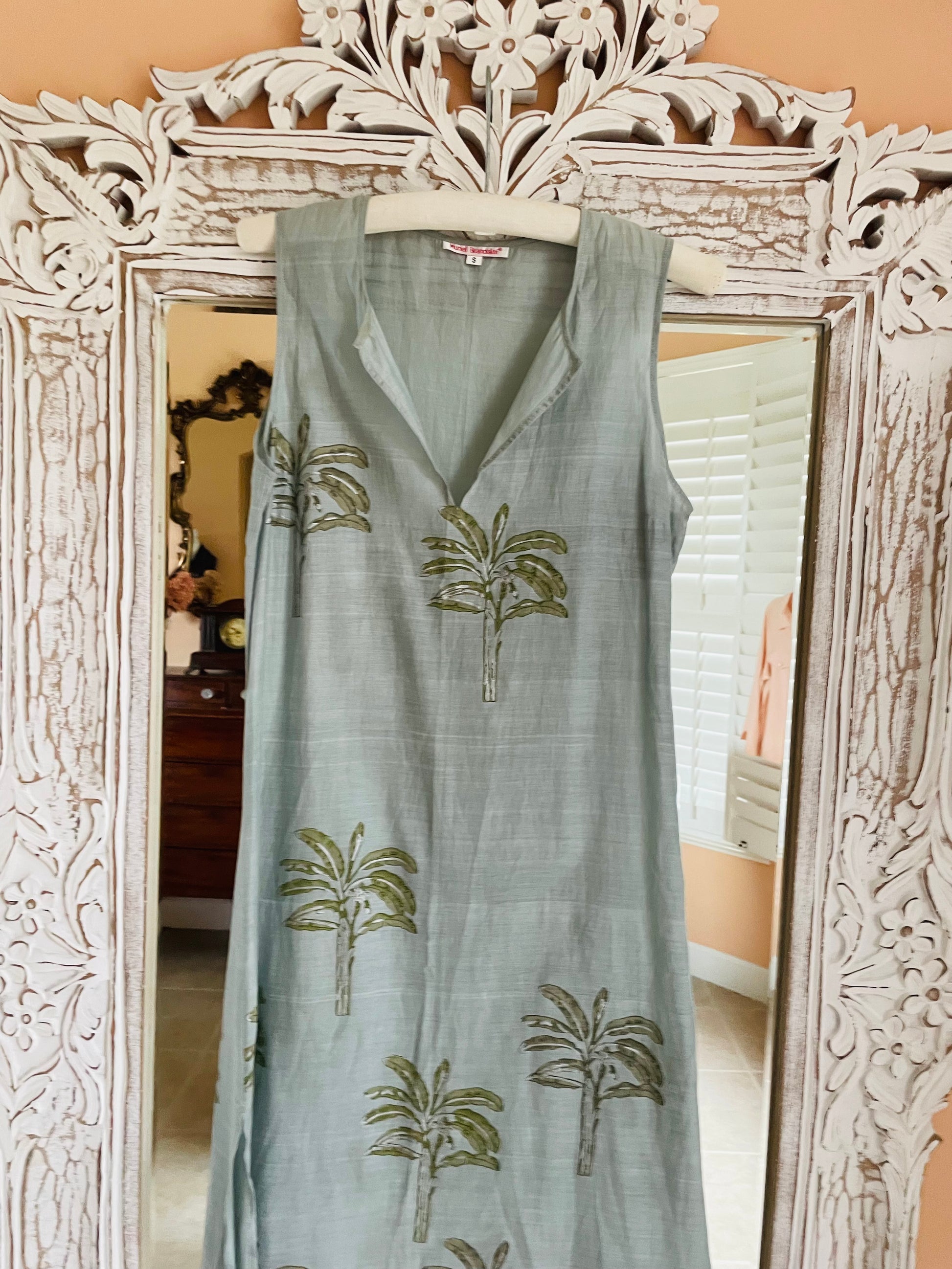 Features Silk Cotton quality fabric Sleeveless Blue color with green palm tree print Florida Style 22” bottom side slits Casual Resort-wear Sleek look Some sheerness to fabric