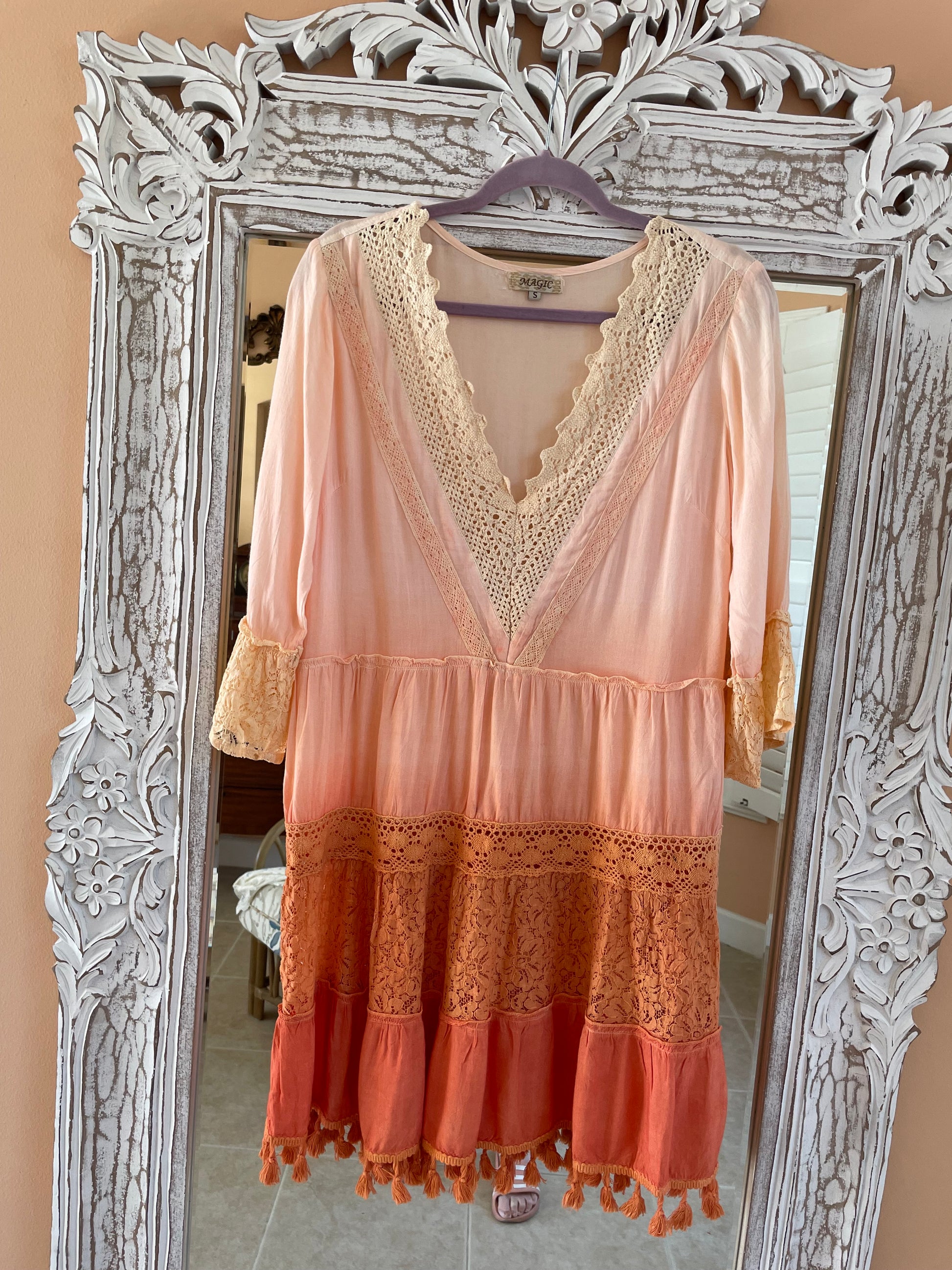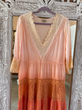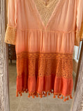 2000s Lacy Pinks & Oranges Rayon Fringed Tiered Dress Lg
