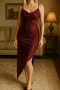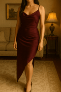This burgundy bodycon dress combines ruched texture, soft stretch, and a high slit that celebrates confidence and timeless sensuality.