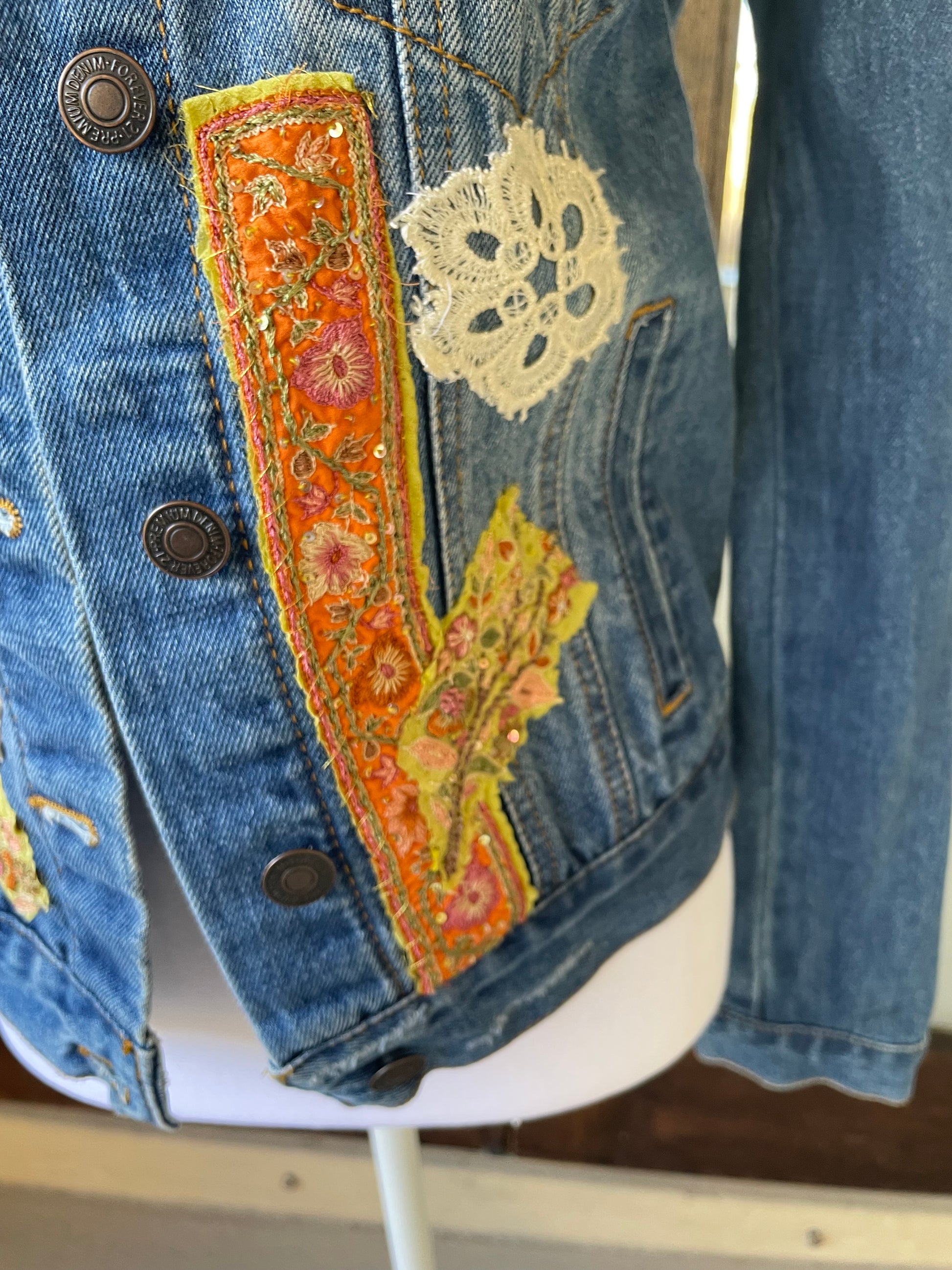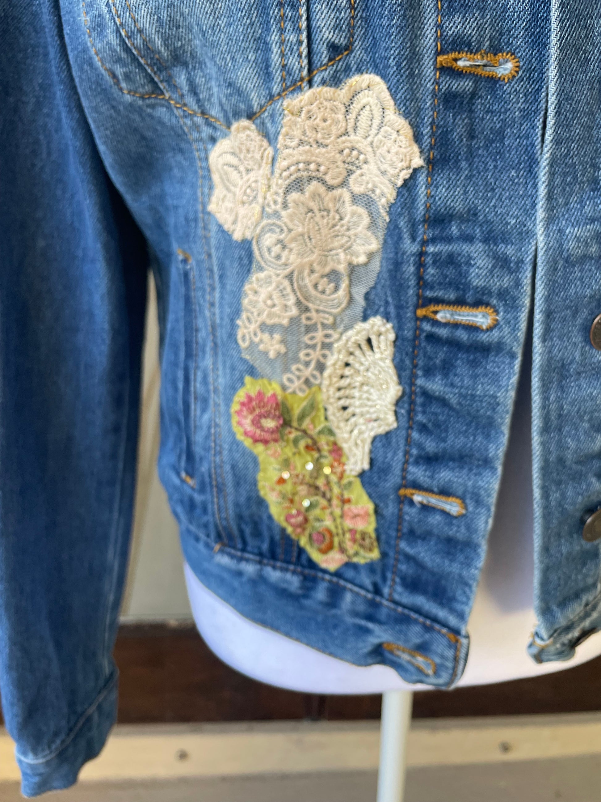 2000s Repurposed Vintage Lace Fabric Appliqué Cropped Denim Jacket X/S