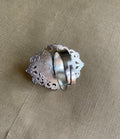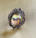 This silver tone cherub ring captures the delicate artistry of the 2000s. Its intricate design adds a whisper of romance and light to your look.