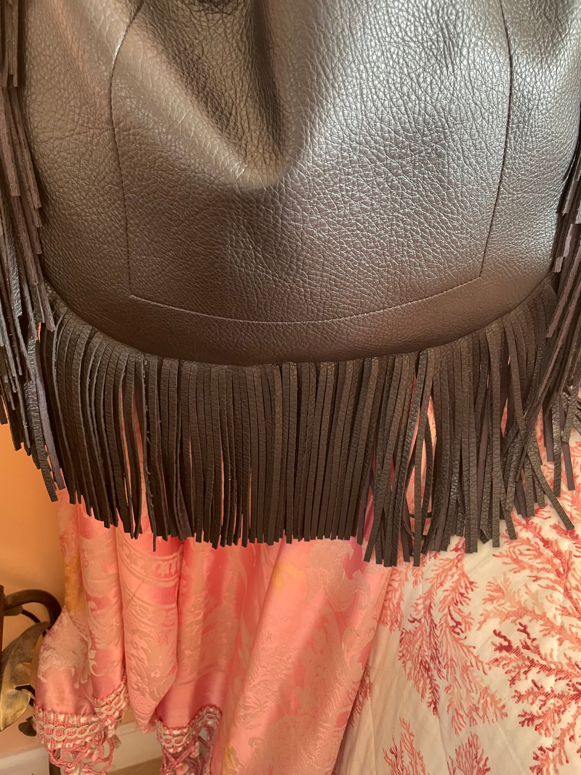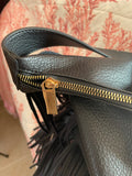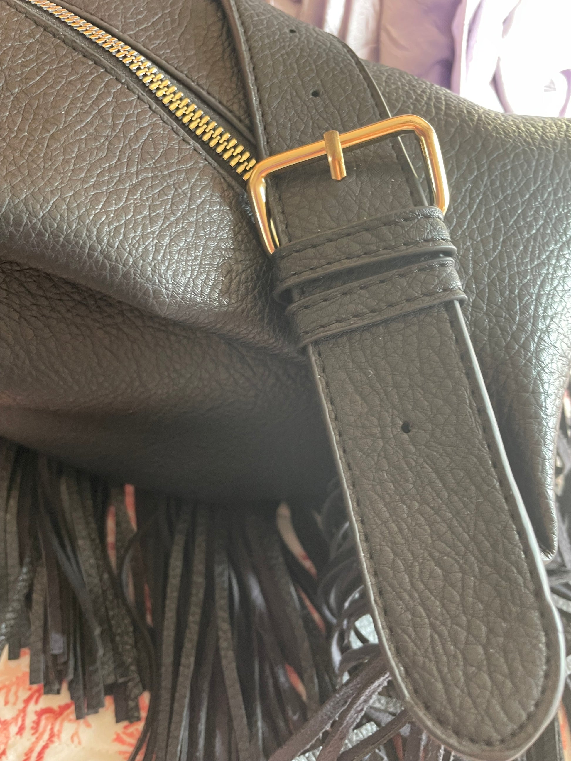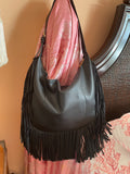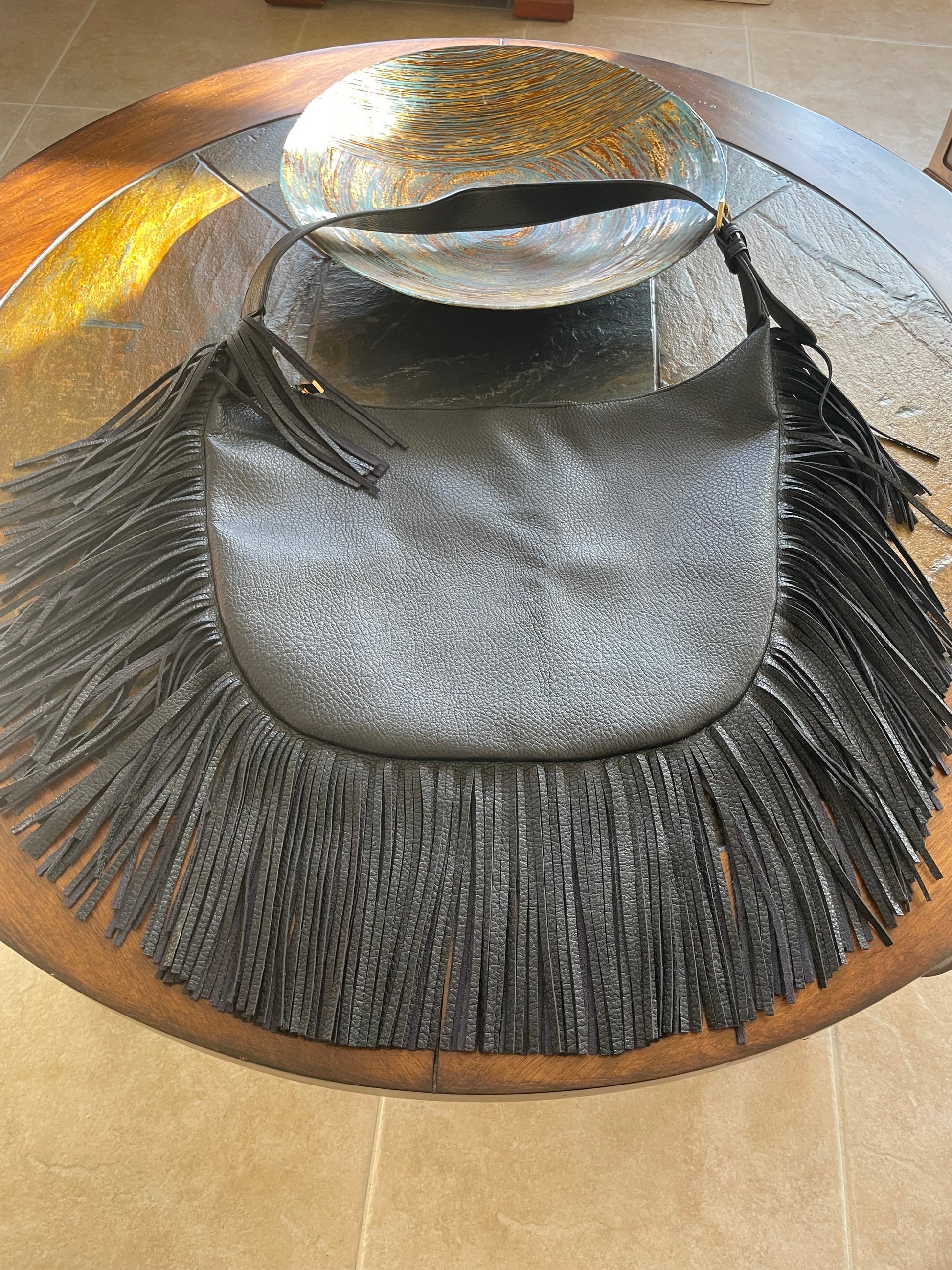 2000s Sleek Black Faux Leather Fringed Boho Satchel Bag.
