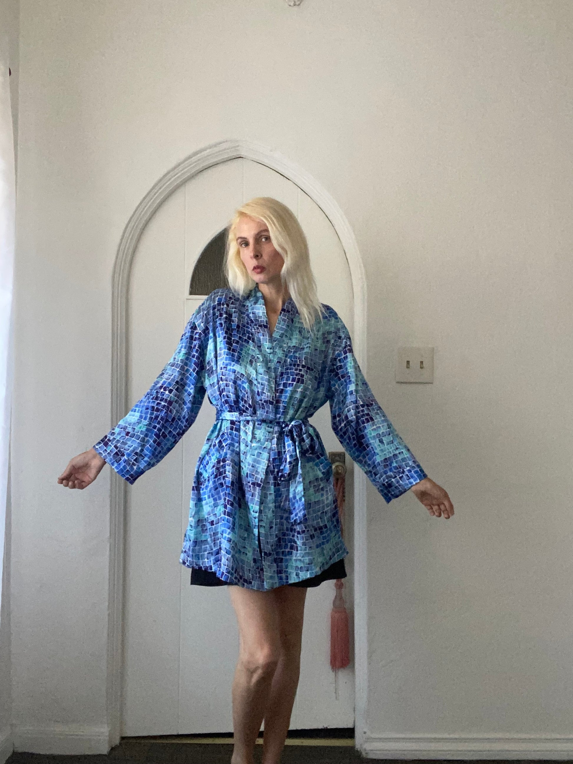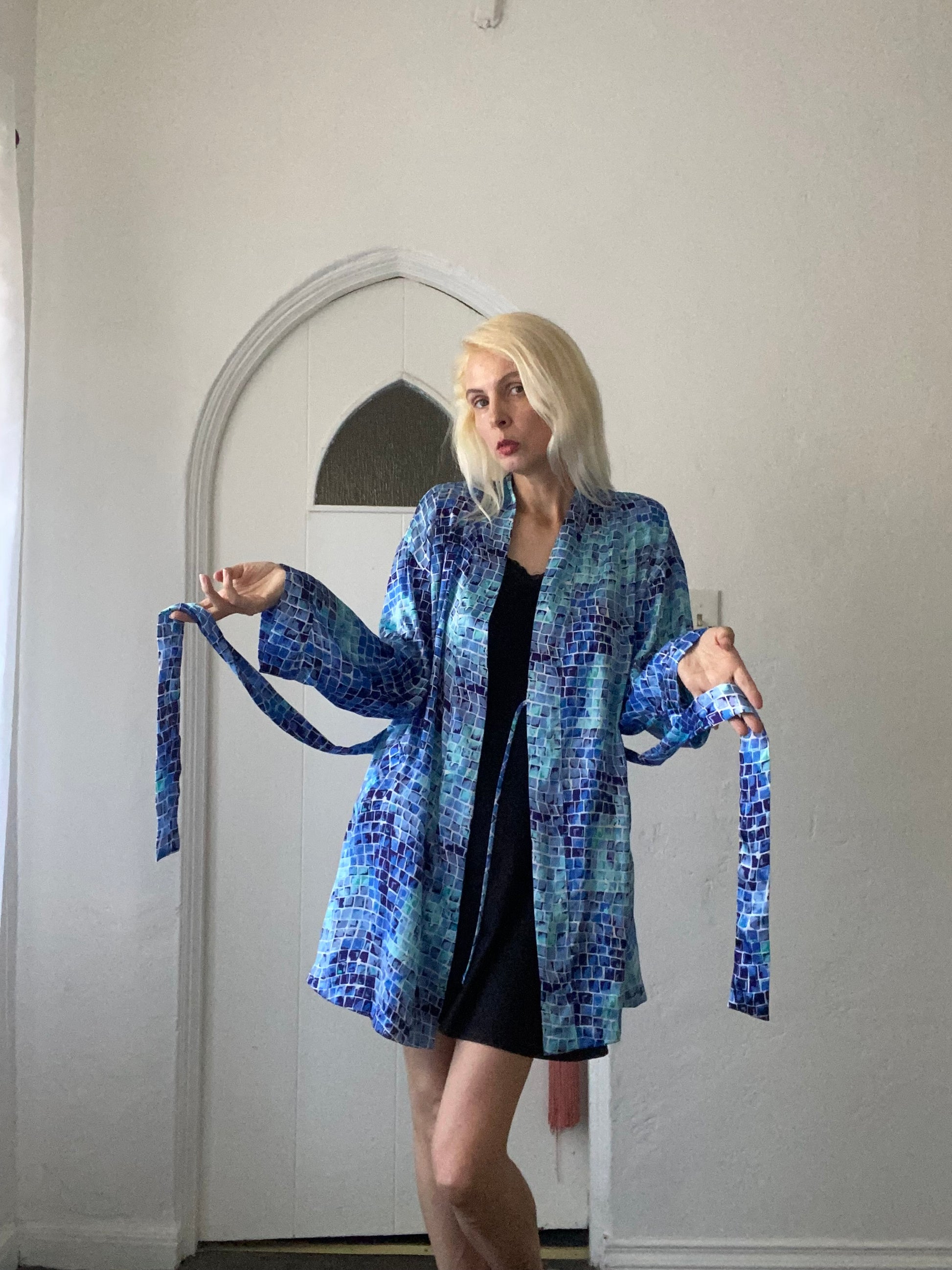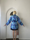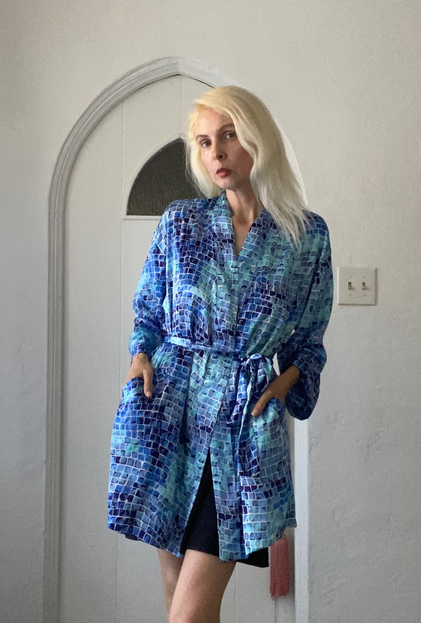 2000s Victoria’s Secret Blue Poly Abstract Square Print Belted Lounge Lingerie Robe L