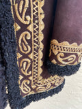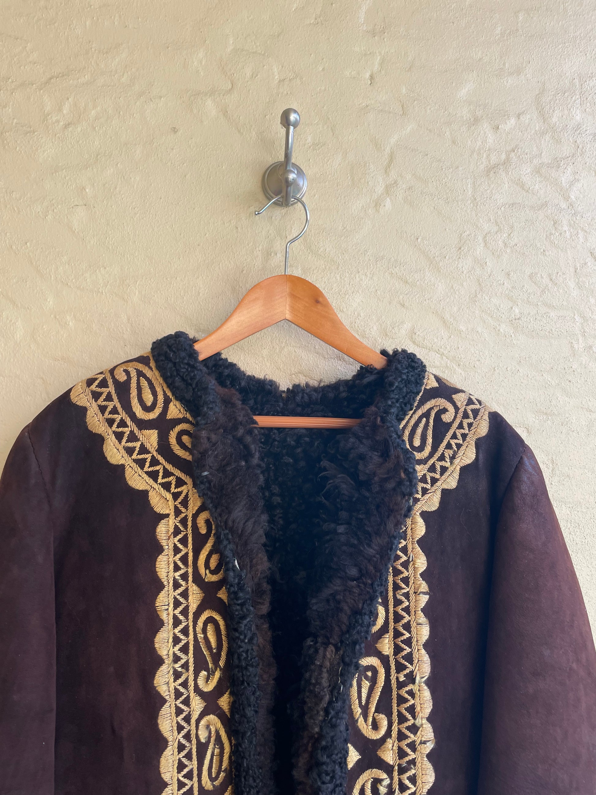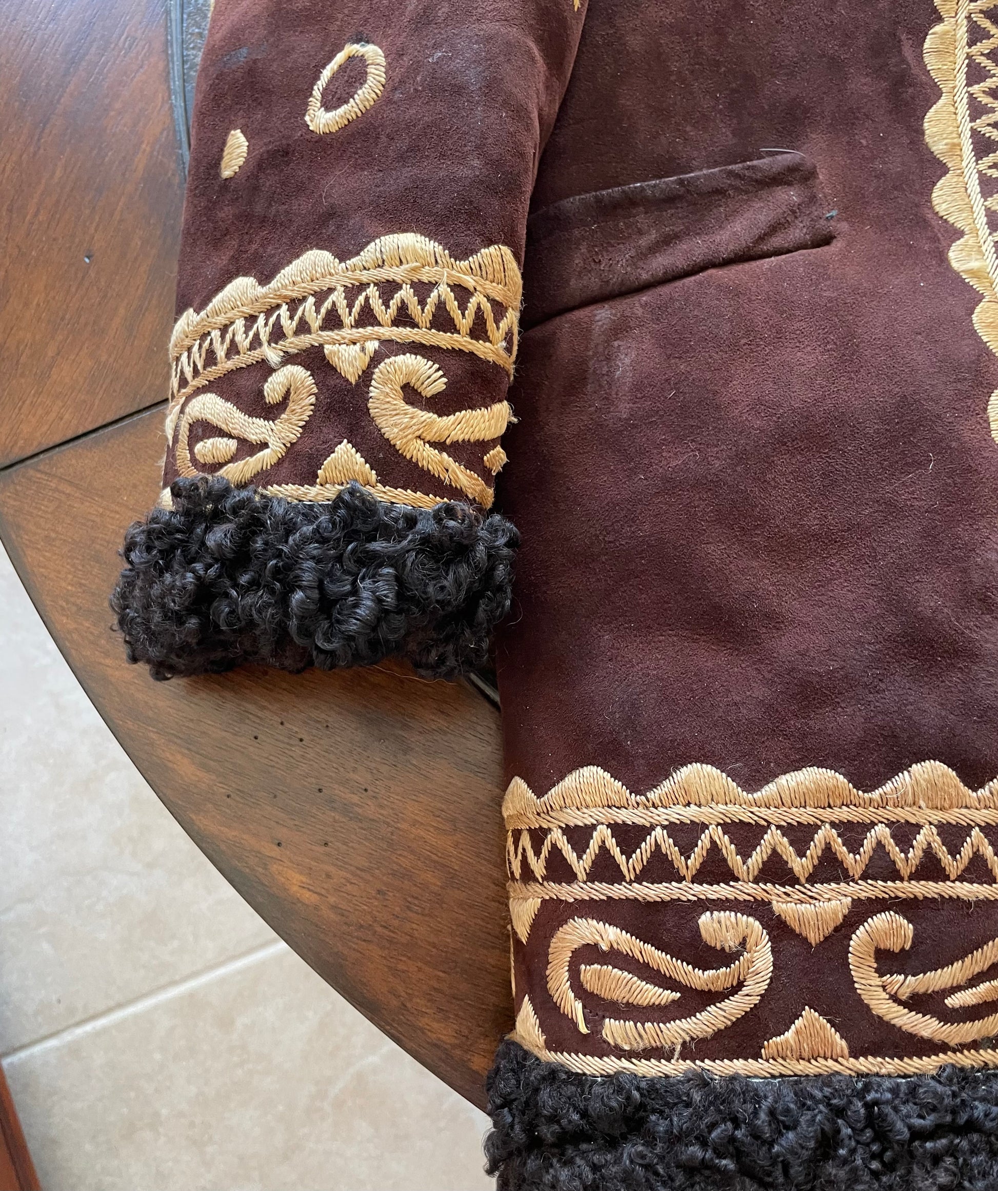 70s Vintage Genuine Brown Swede Leather Sheep Wool Coat. Lg