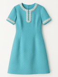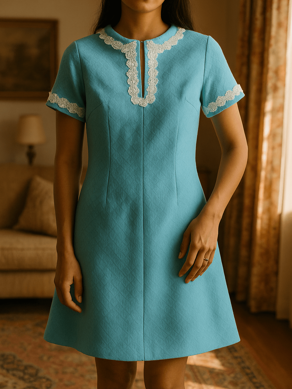 This handmade 70s pencil dress in baby blue blends structure and romance. Lace detailing traces its clean silhouette, making subtle elegance feel effortless.
