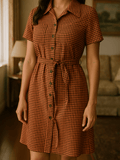 Warm orange-brown checks and a fitted tie belt give this 70s day dress its easy confidence. The collared neckline and soft fabric make it ready for every moment you want to feel put-together without trying.