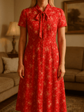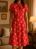 70s Vintage Handmade Red White Floral Print Neck Tie Dress S