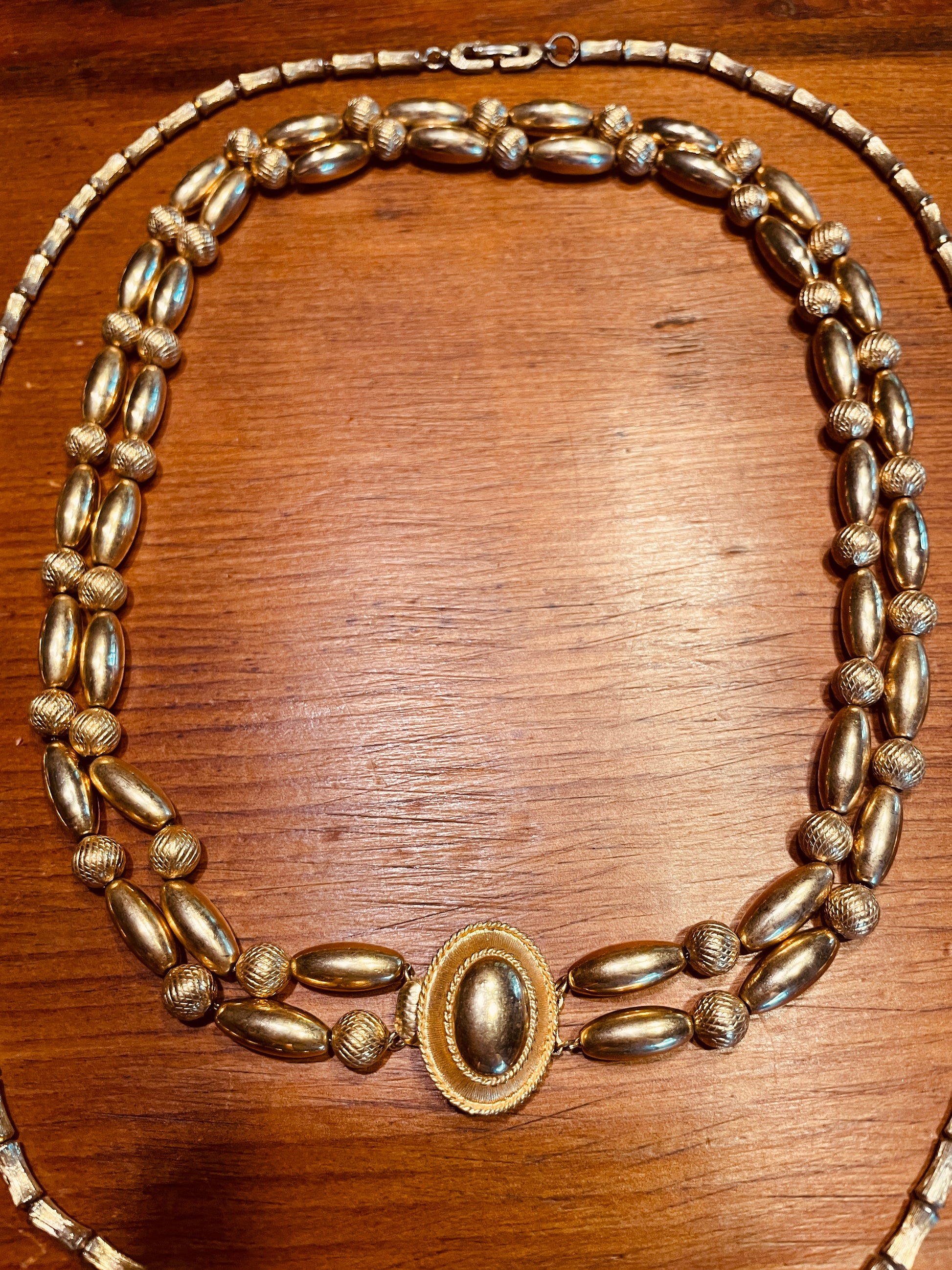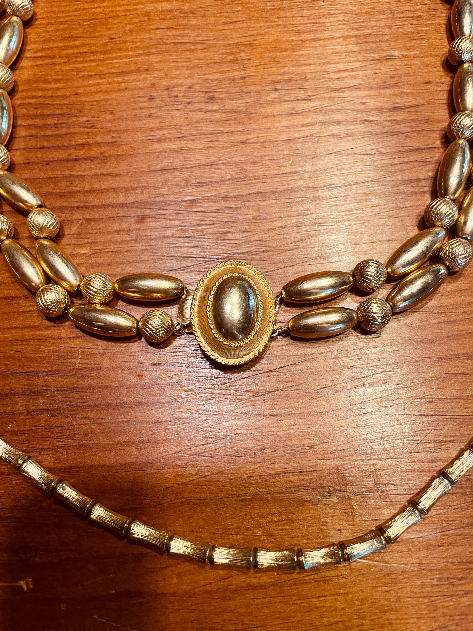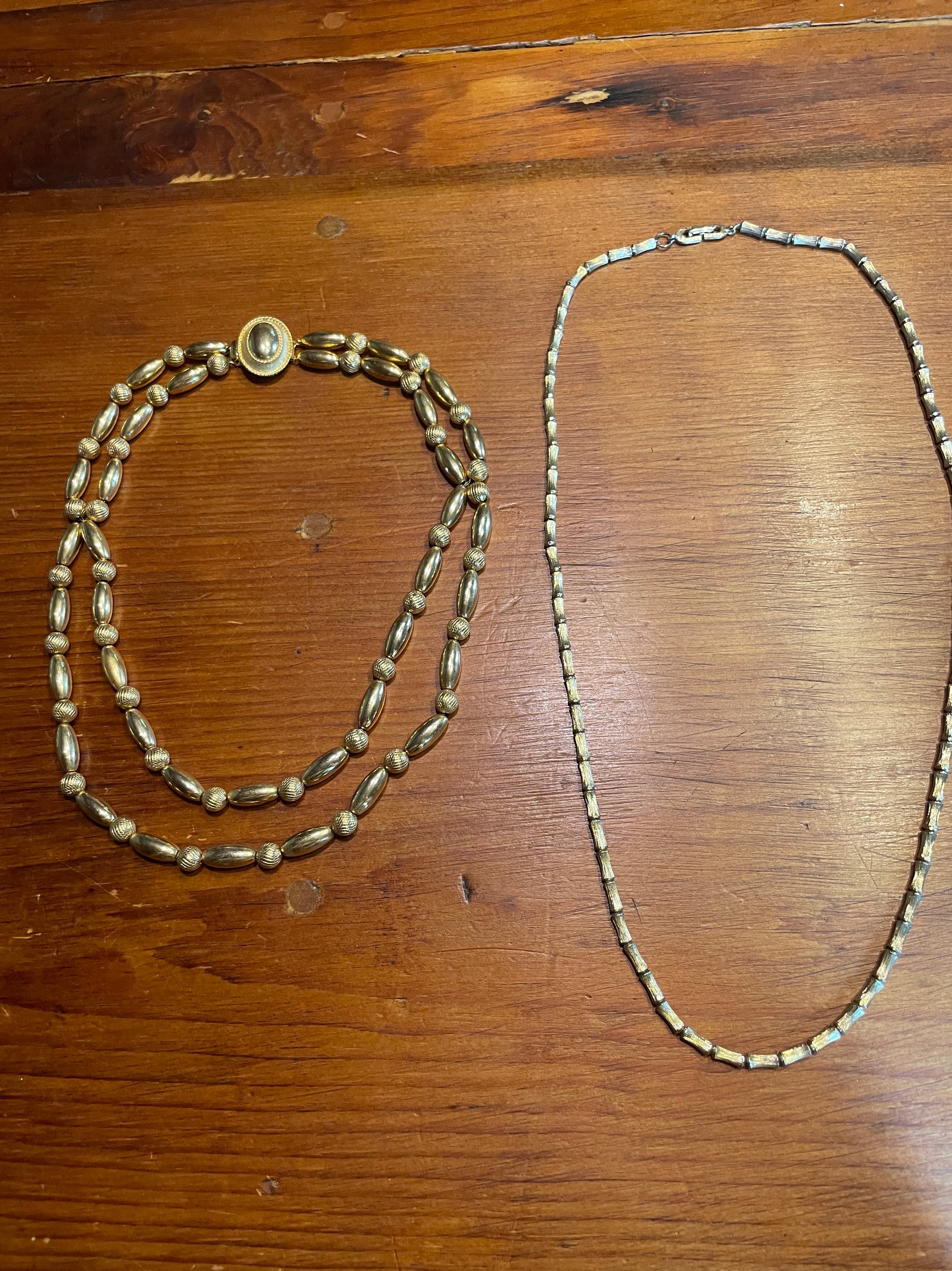 80s 2 Gold Tone Necklaces Vintage Beaded Double Strand & Tassel Chain