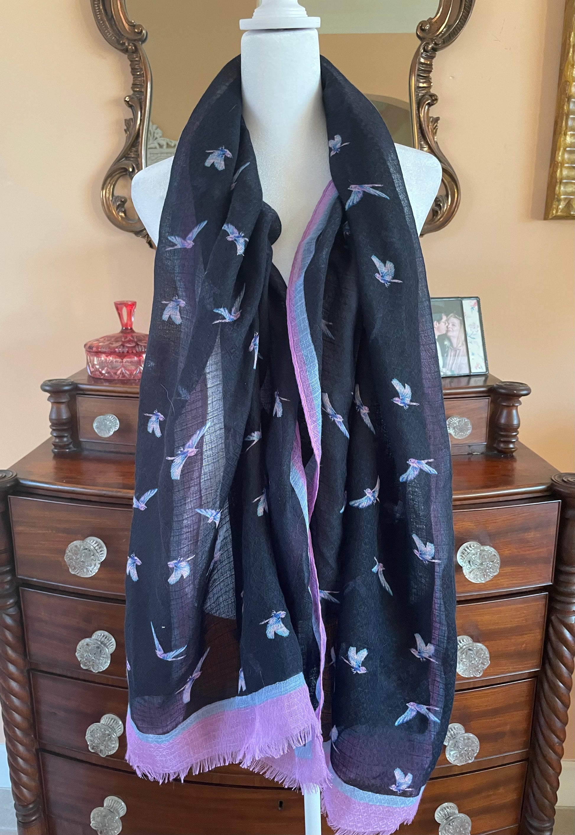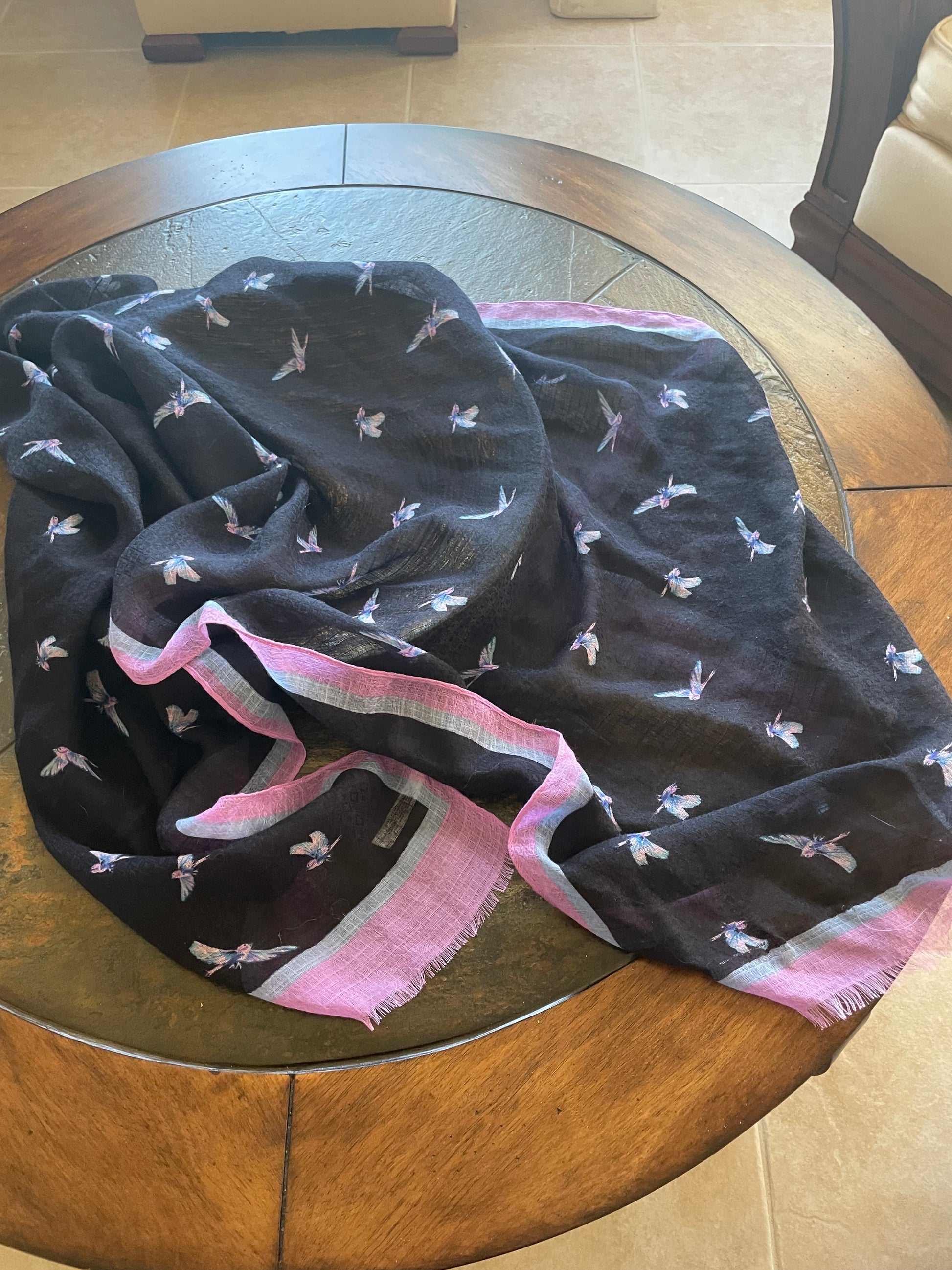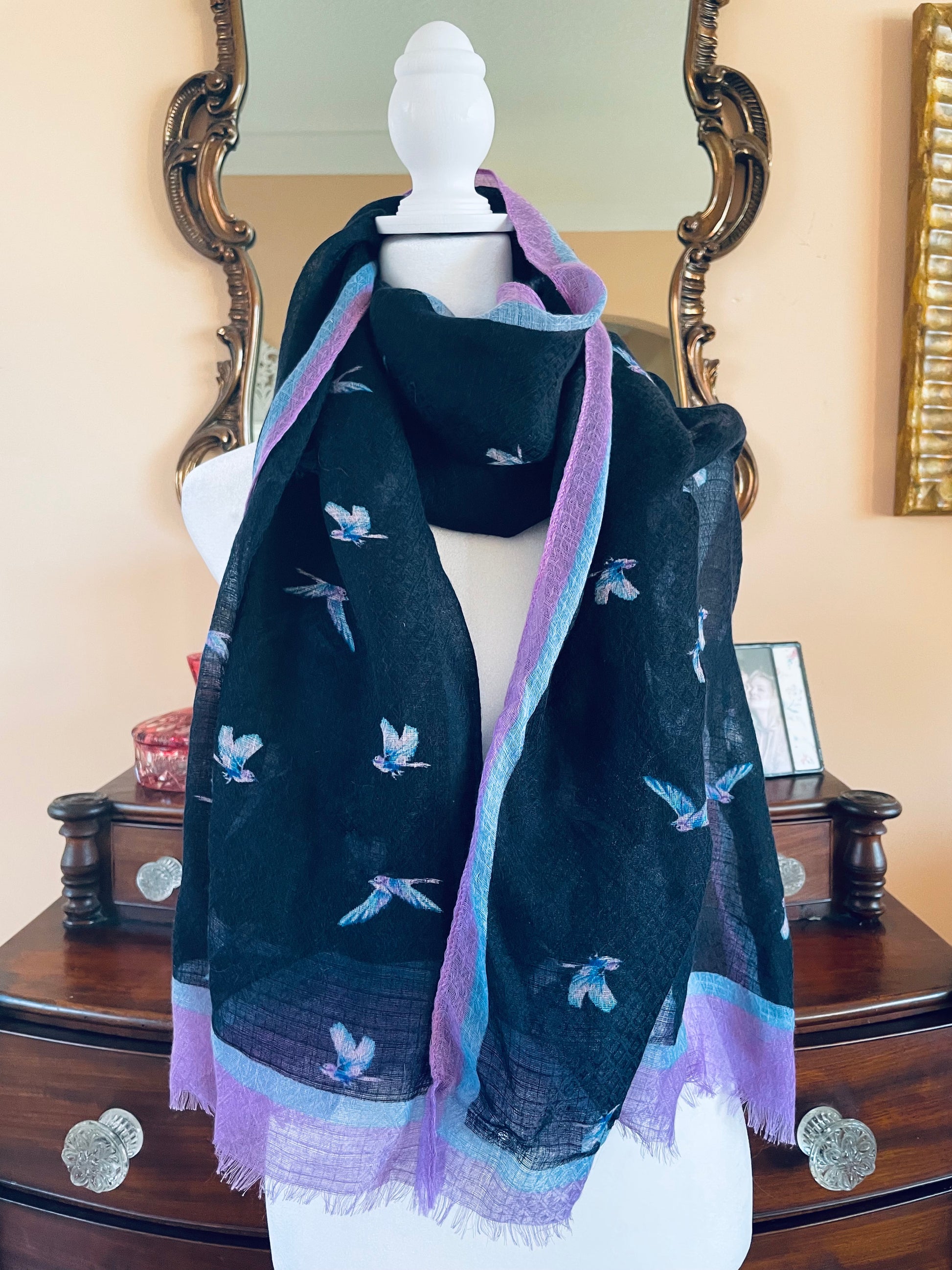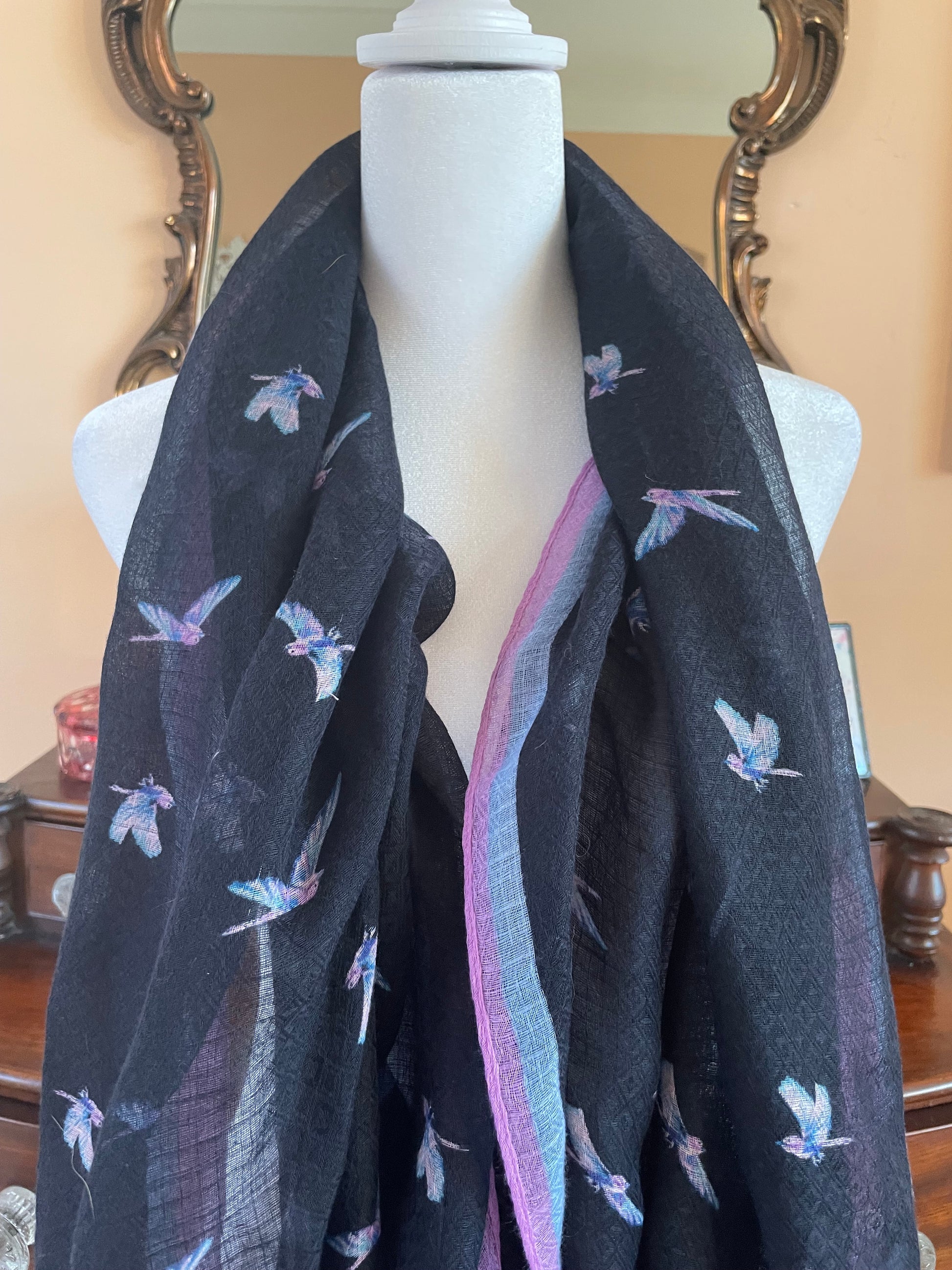 Semi sheer poly fabric. Raw edges. Easy to wrap around. Size 25” x 75”. Unique scarf.
