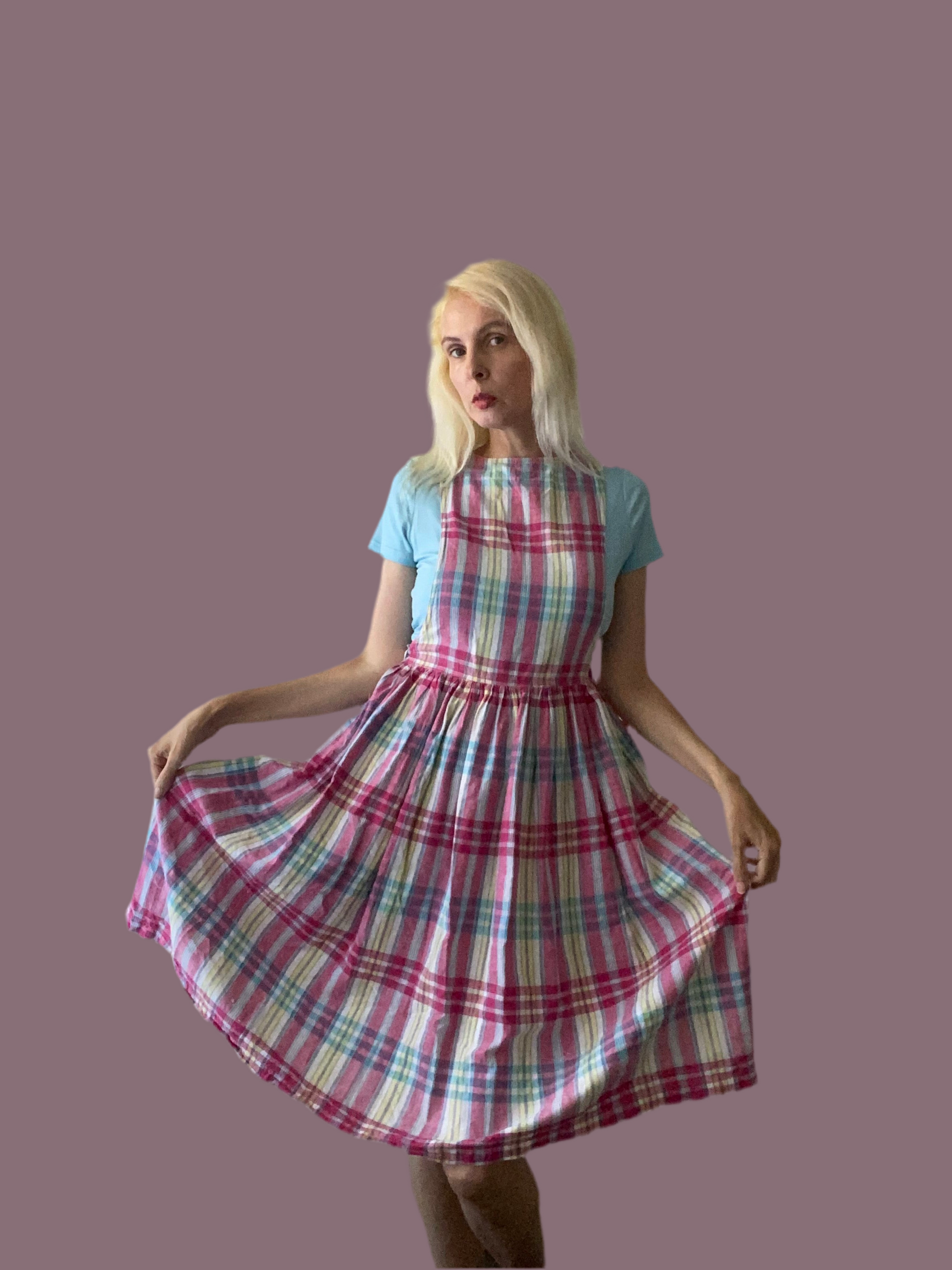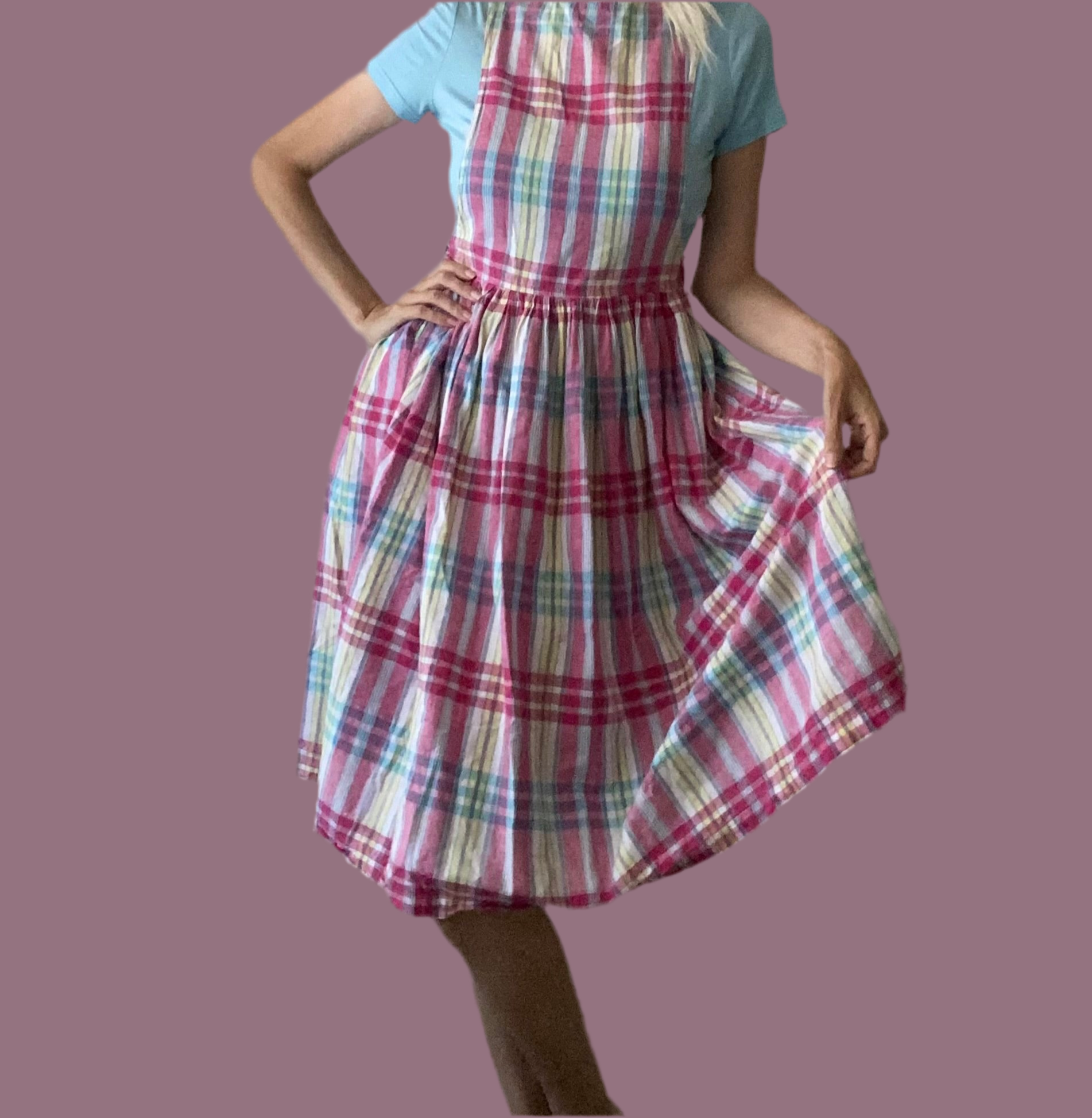 80s Vintage Plaid Pockets Button Strap Pinafore Dress S