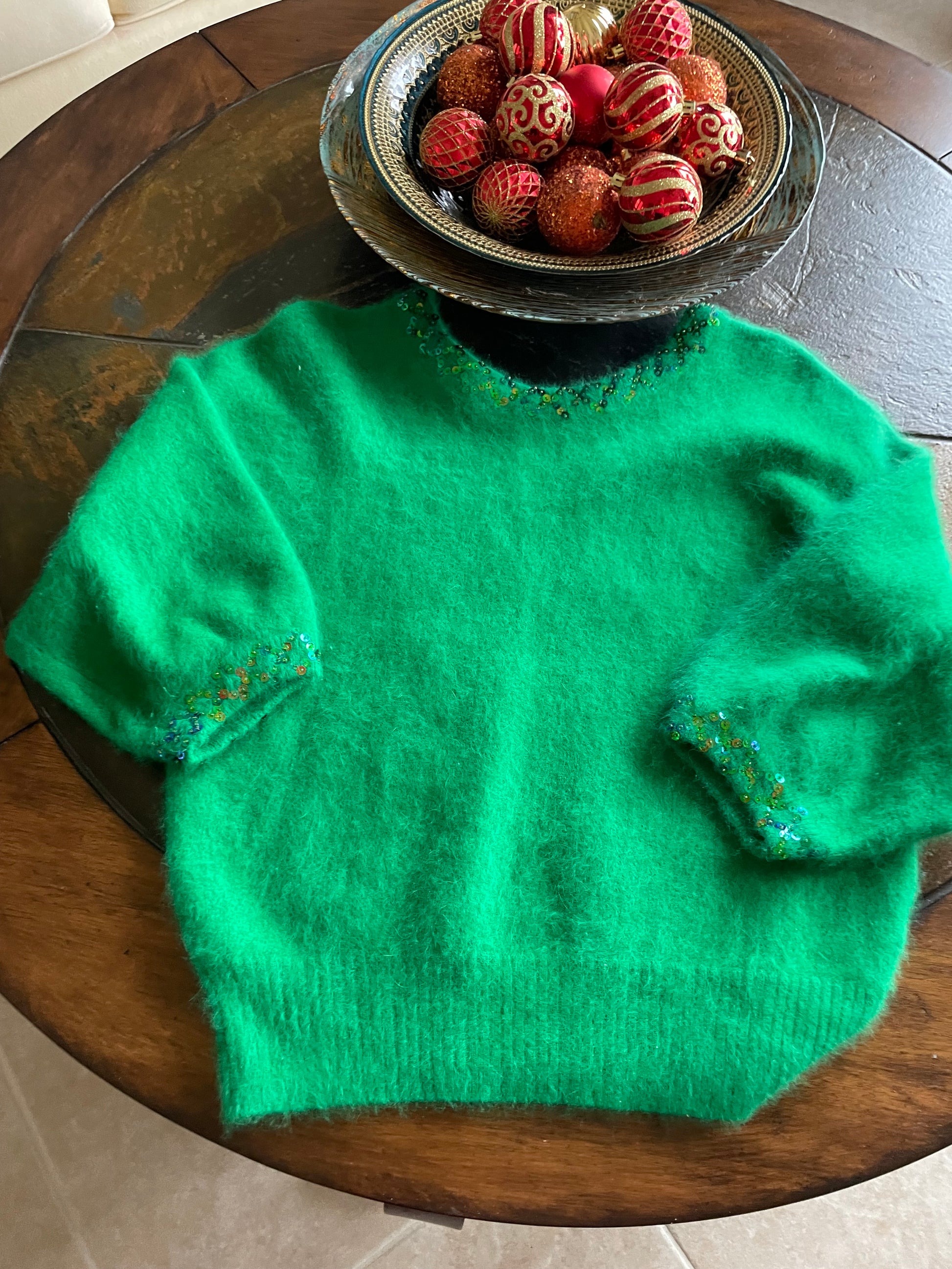 Very rare sweater Beautiful angora super soft knit fabric Sequined detail on neck & sleeve bottom Wonderful for Christmas or anytime