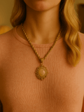 Soft pink hues meet golden warmth in this 80s treasure, where rose quartz rests at the heart of a luminous gold plated chain, radiating serenity and romance.