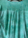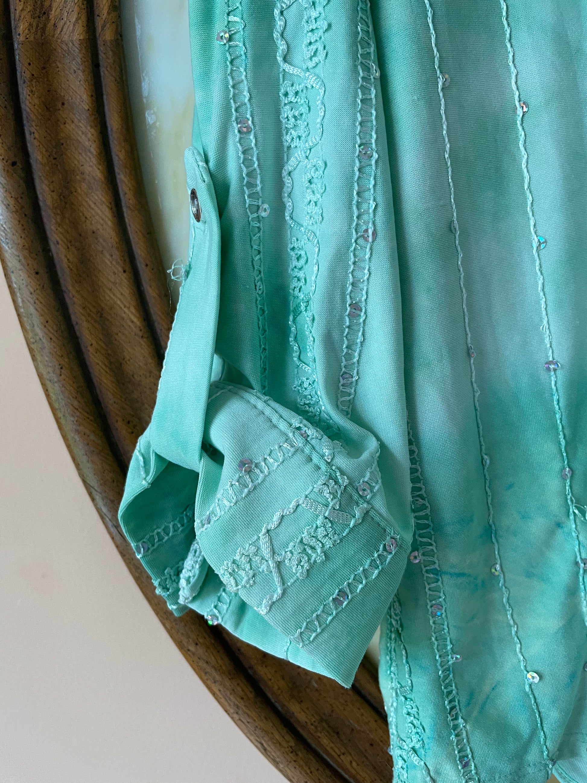 Features pretty shade of green Poly spandex fabric tiny sparkly sequins Roll back sleeve or not Embroidery Pullover Bottom crop Tie