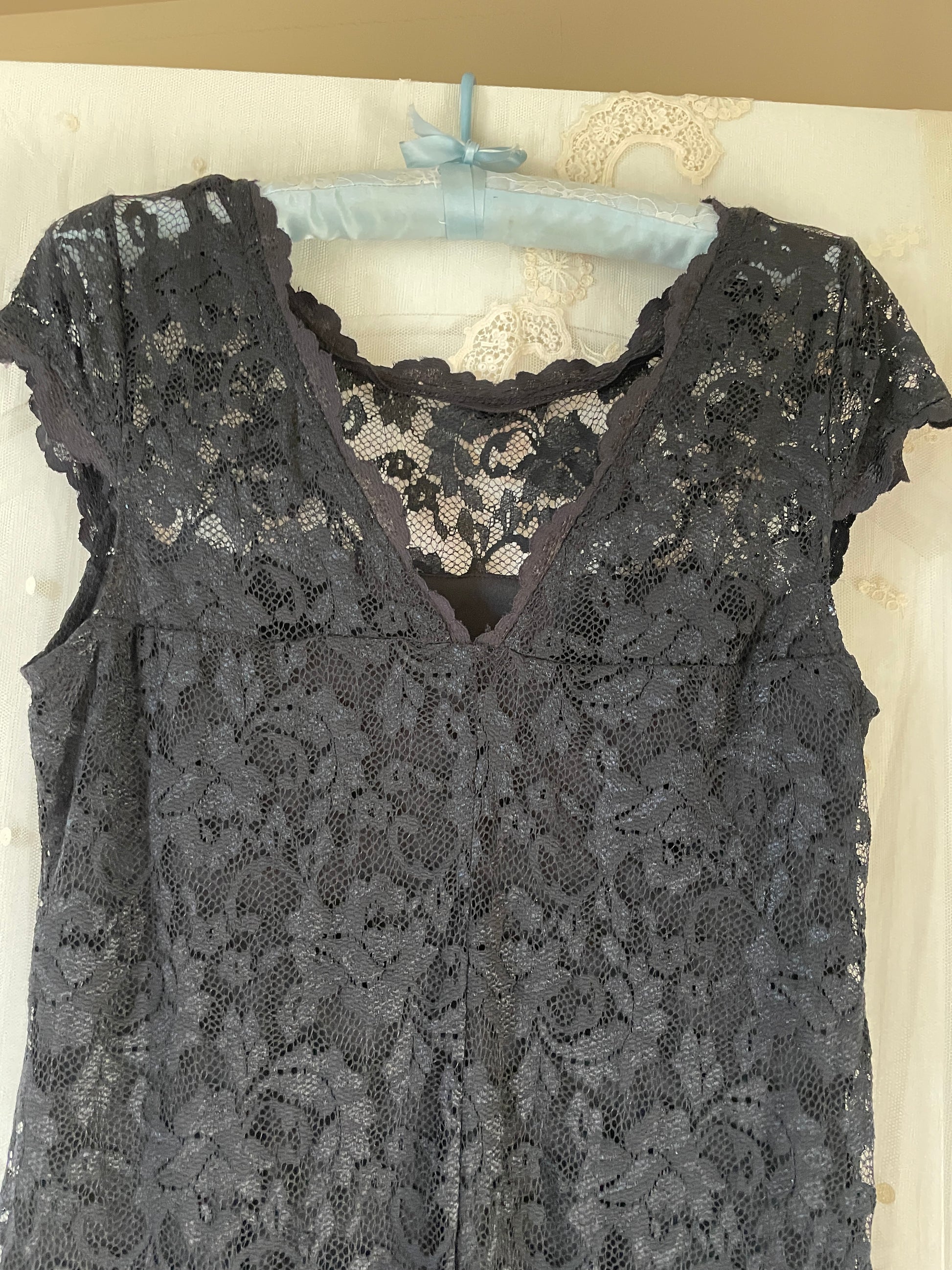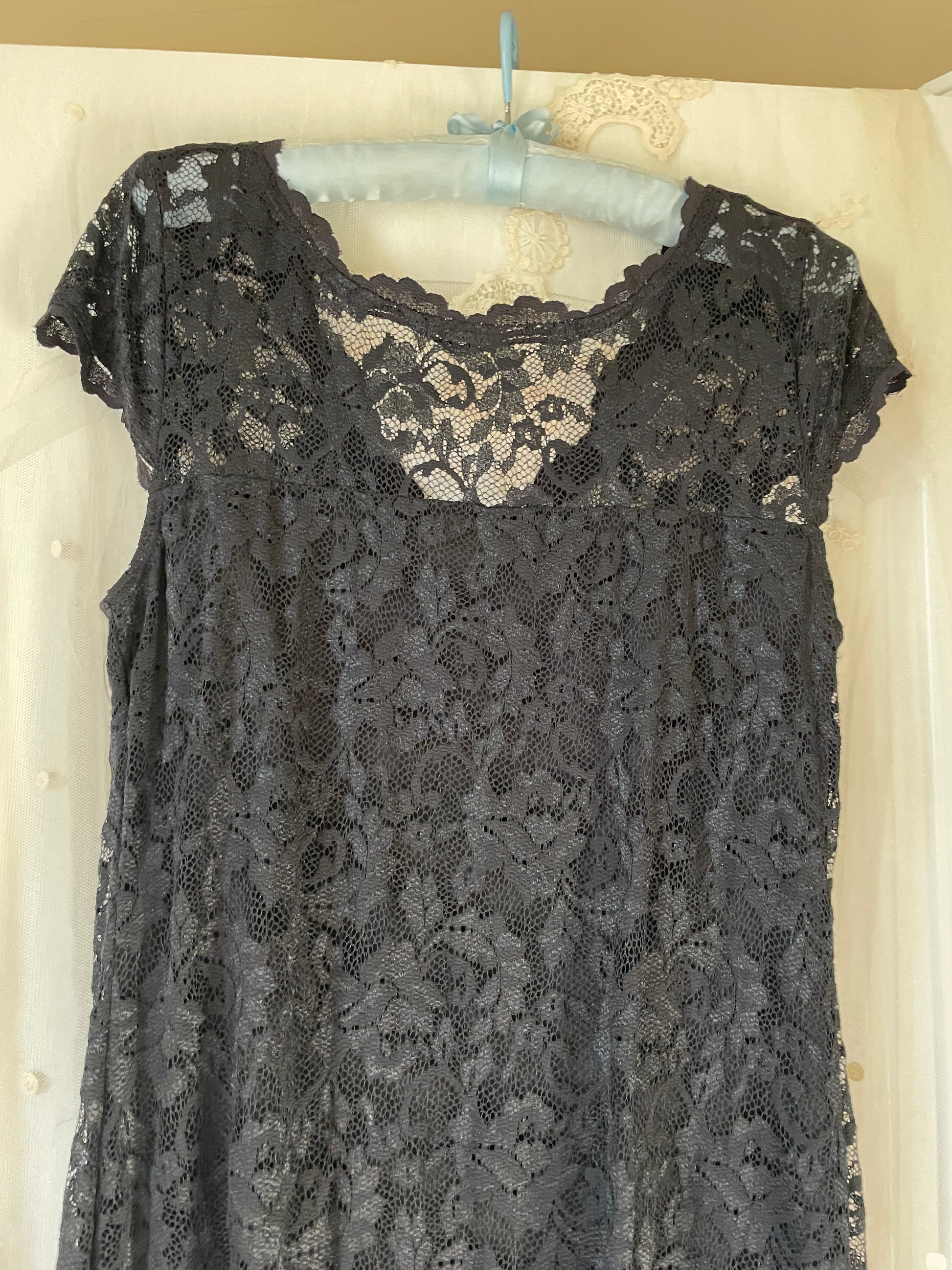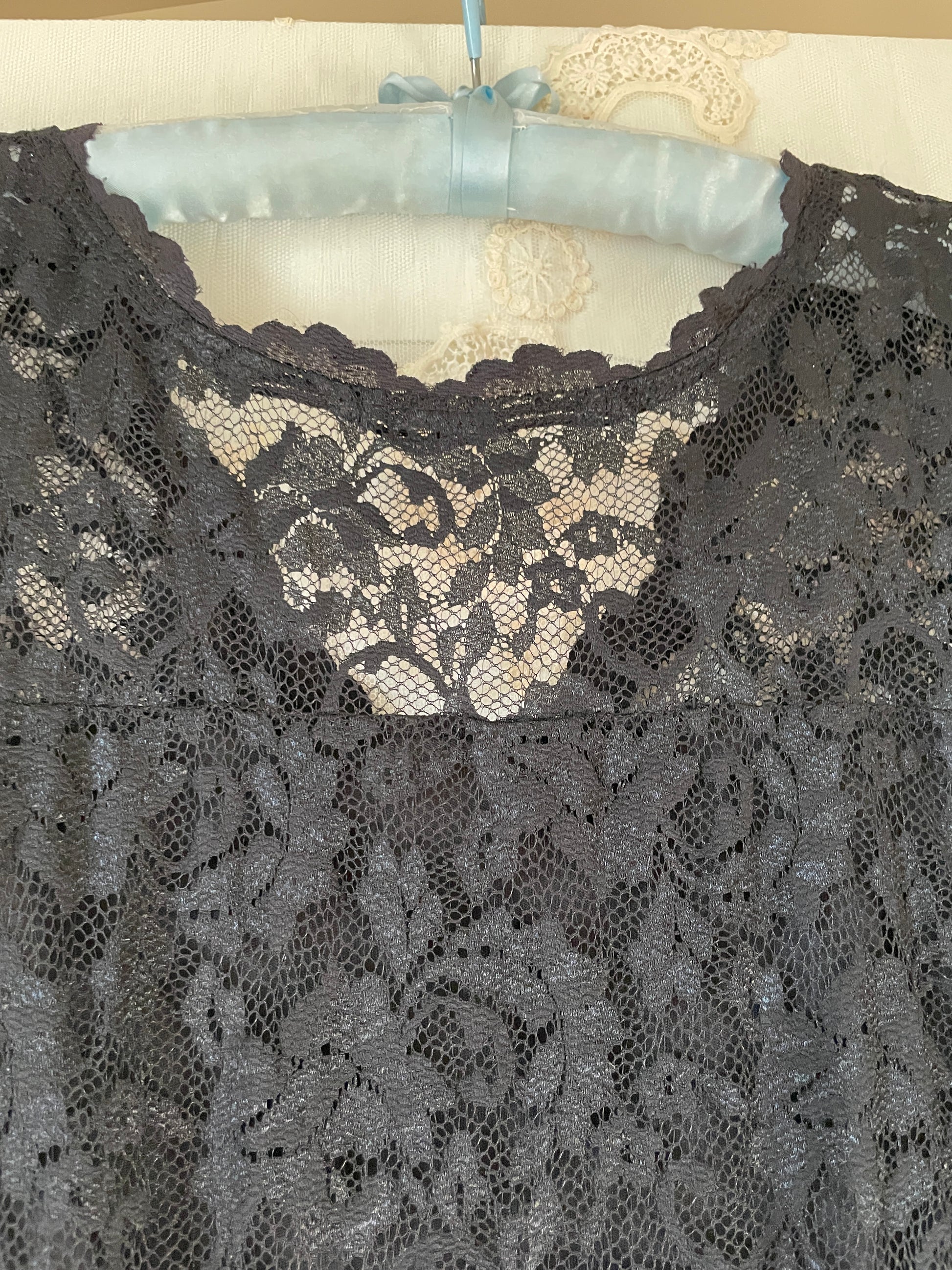 Soft black lace overlays a lined silhouette in this 90s cocktail dress and blends mystery and grace for your most timeless nights.