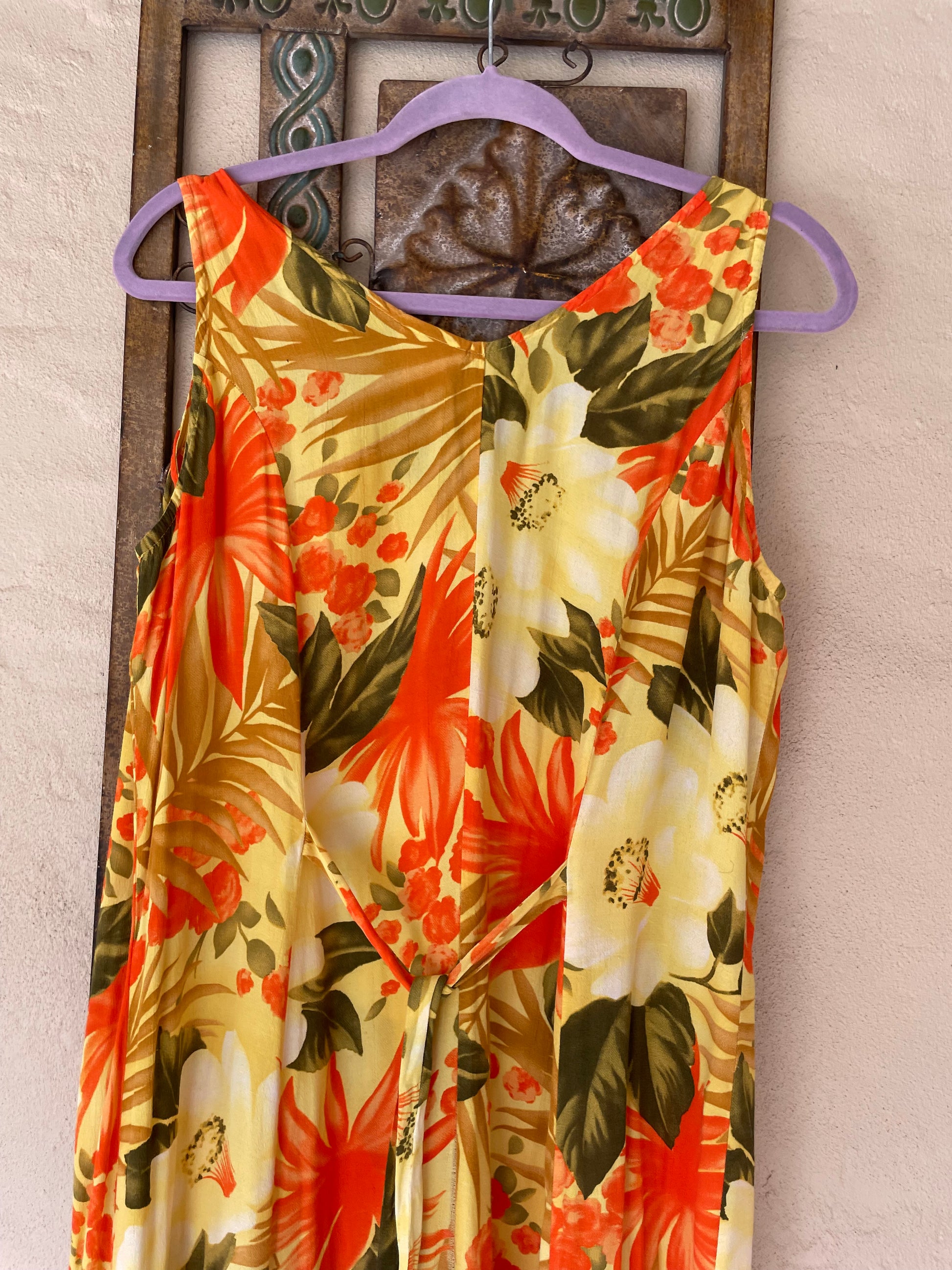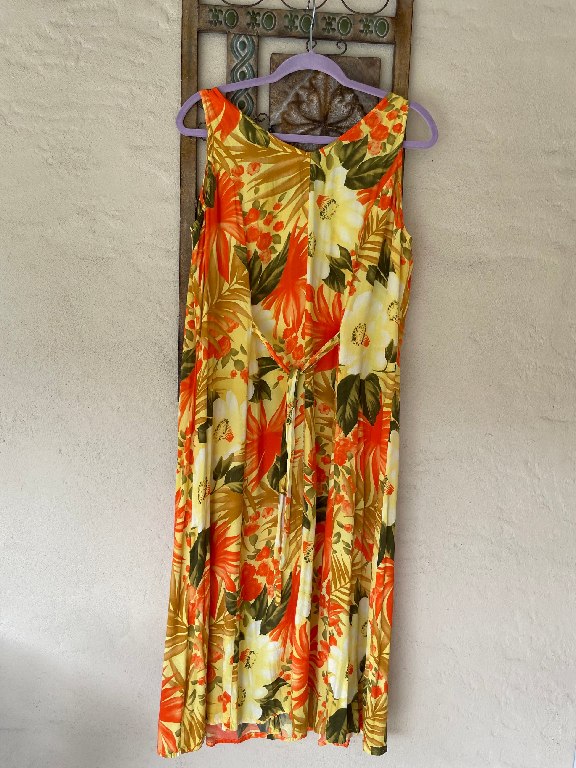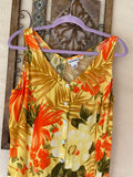 90s Vintage Florida Casual Floral Rayon Back Tie Midi Dress Lg