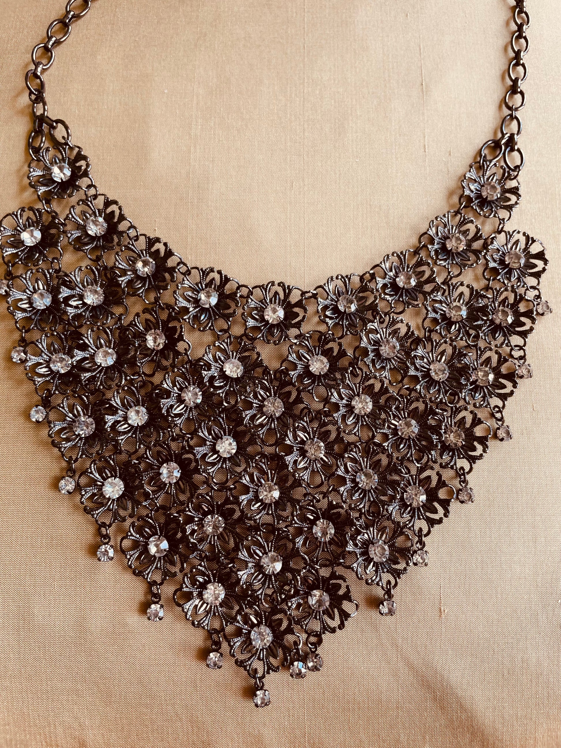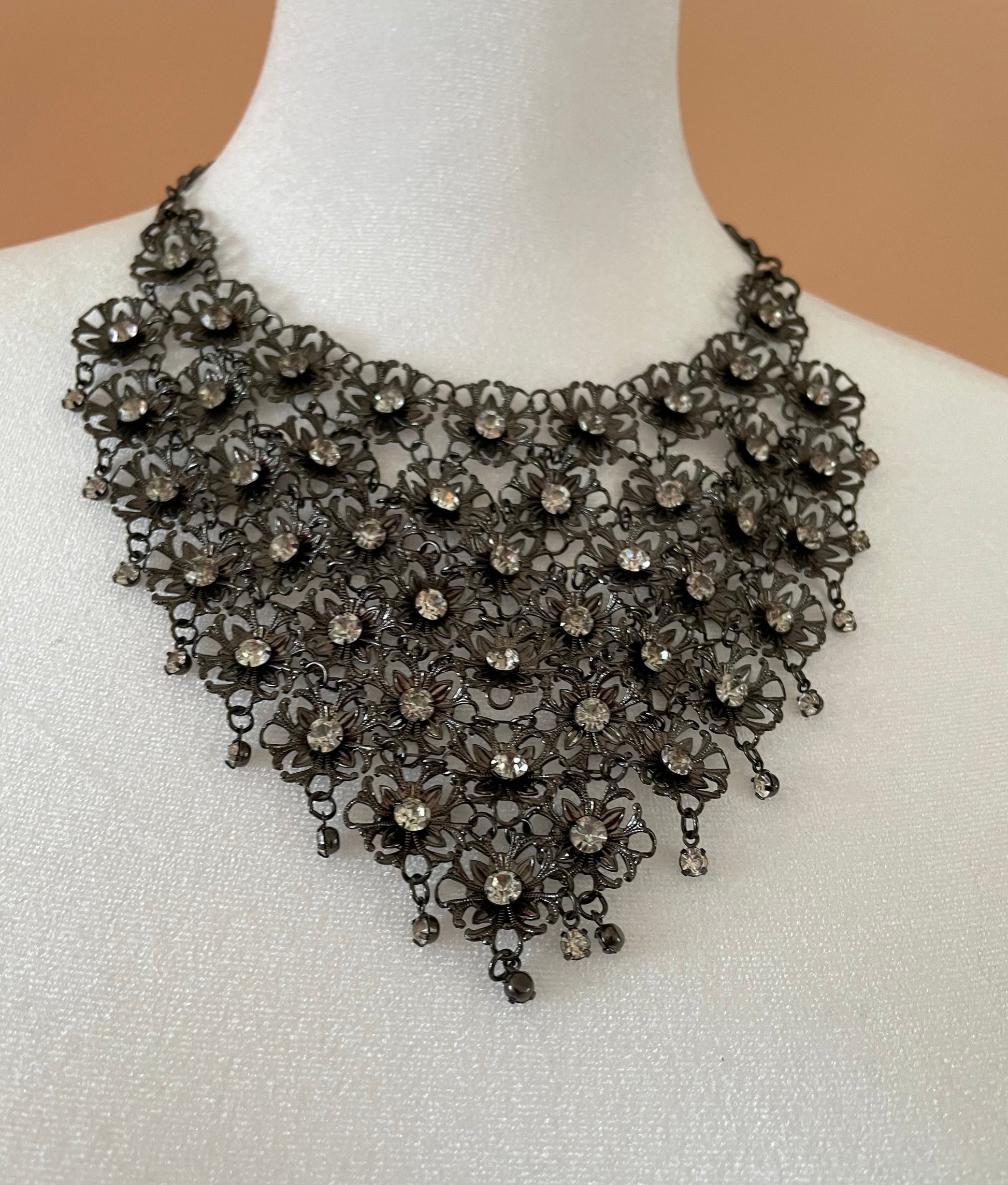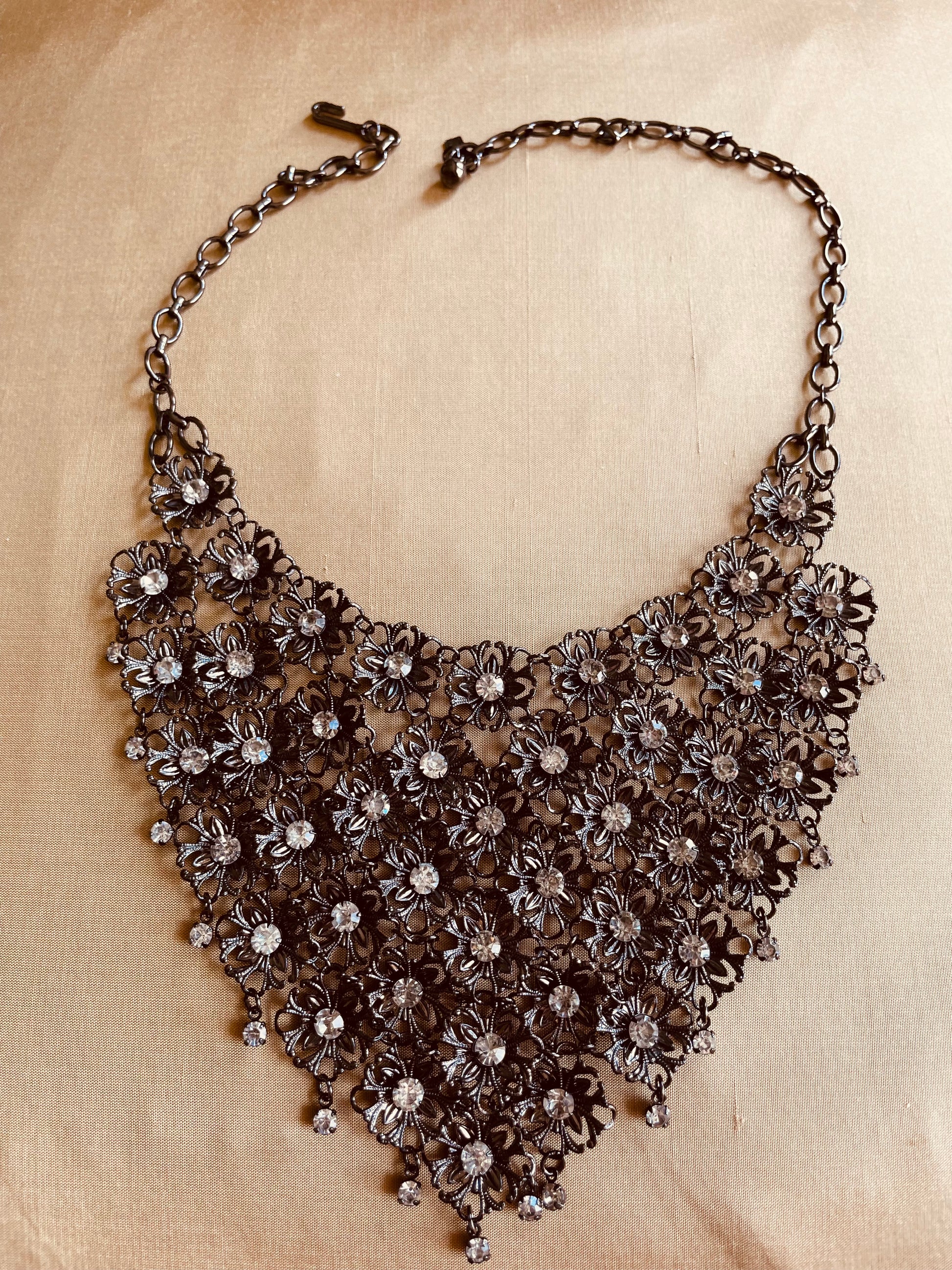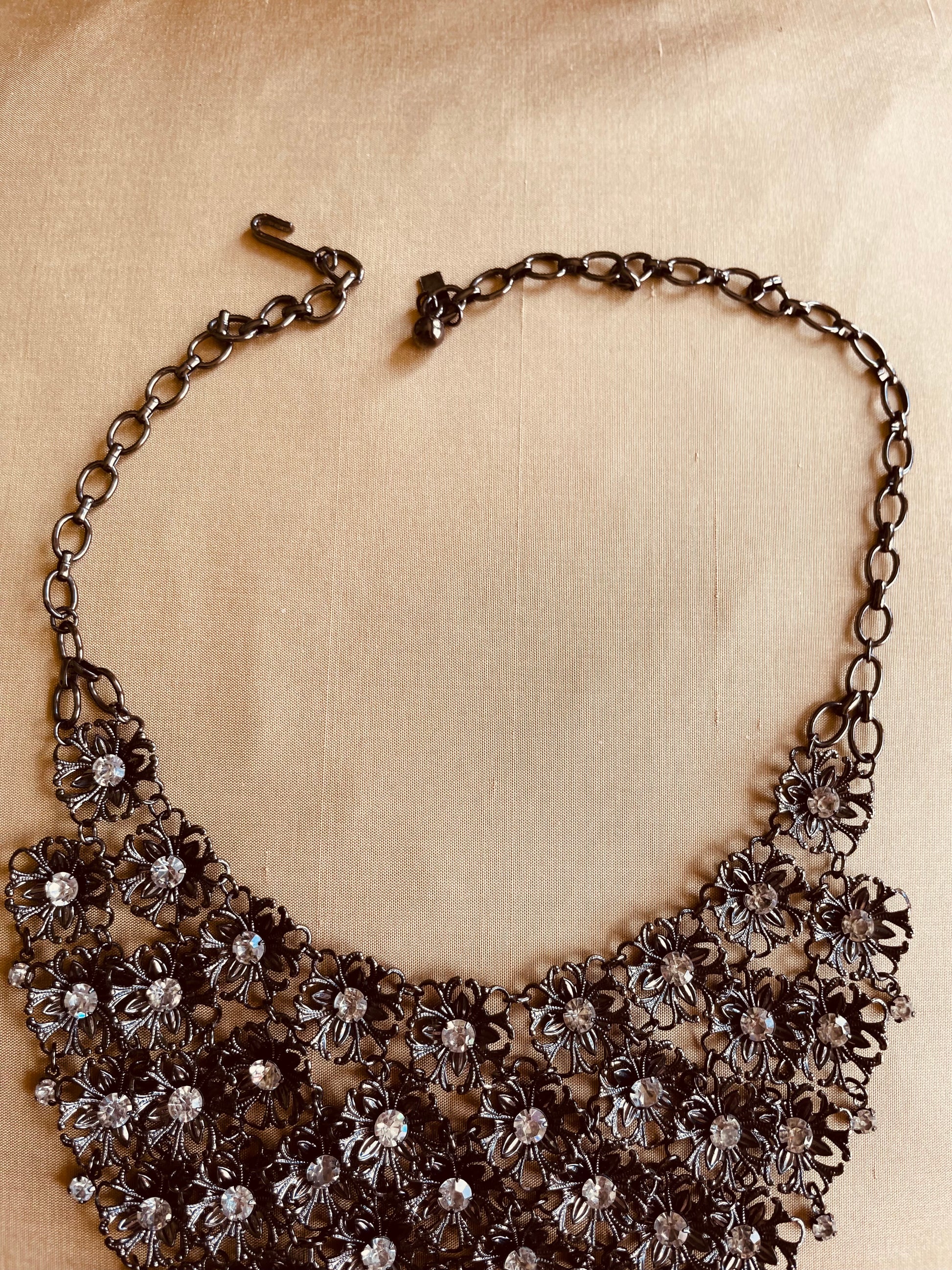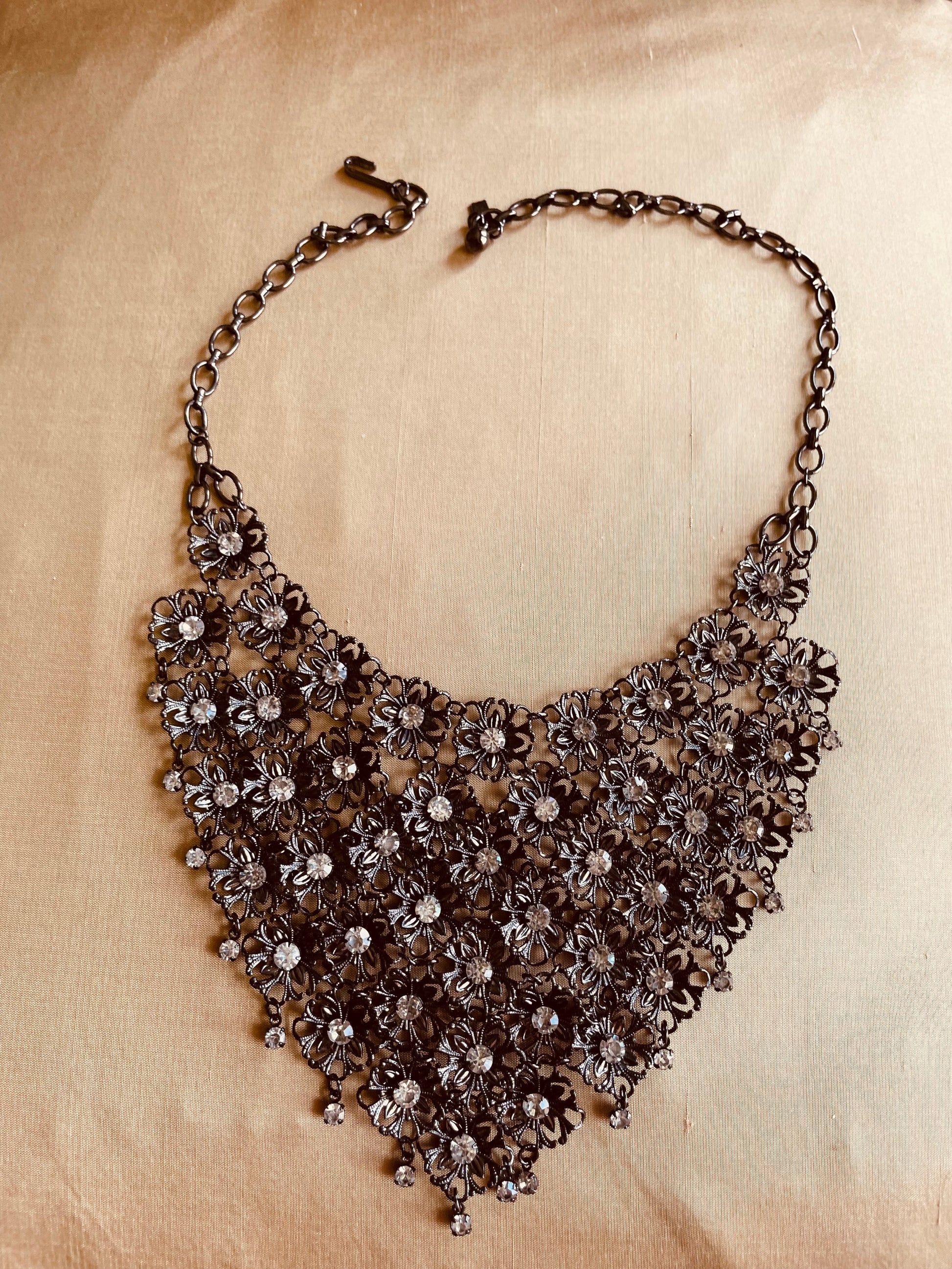 70s Vintage Lacy Flower Rhinestone Chainmail Necklace