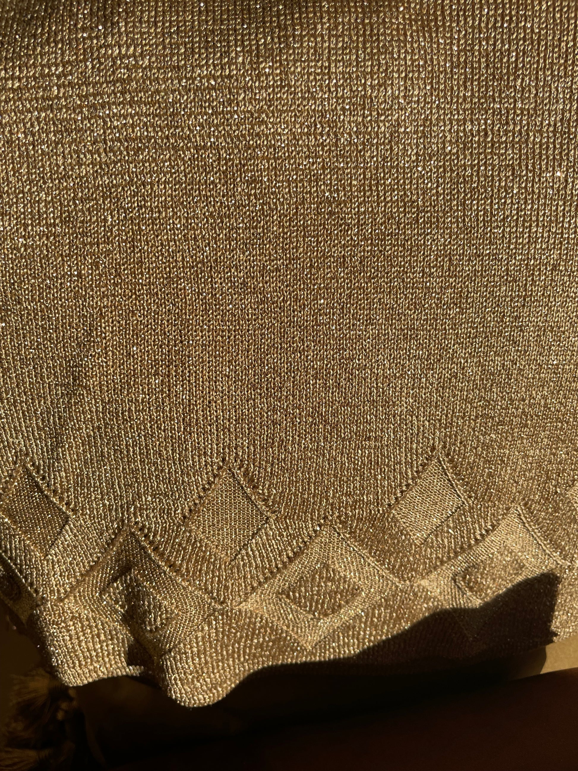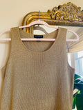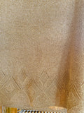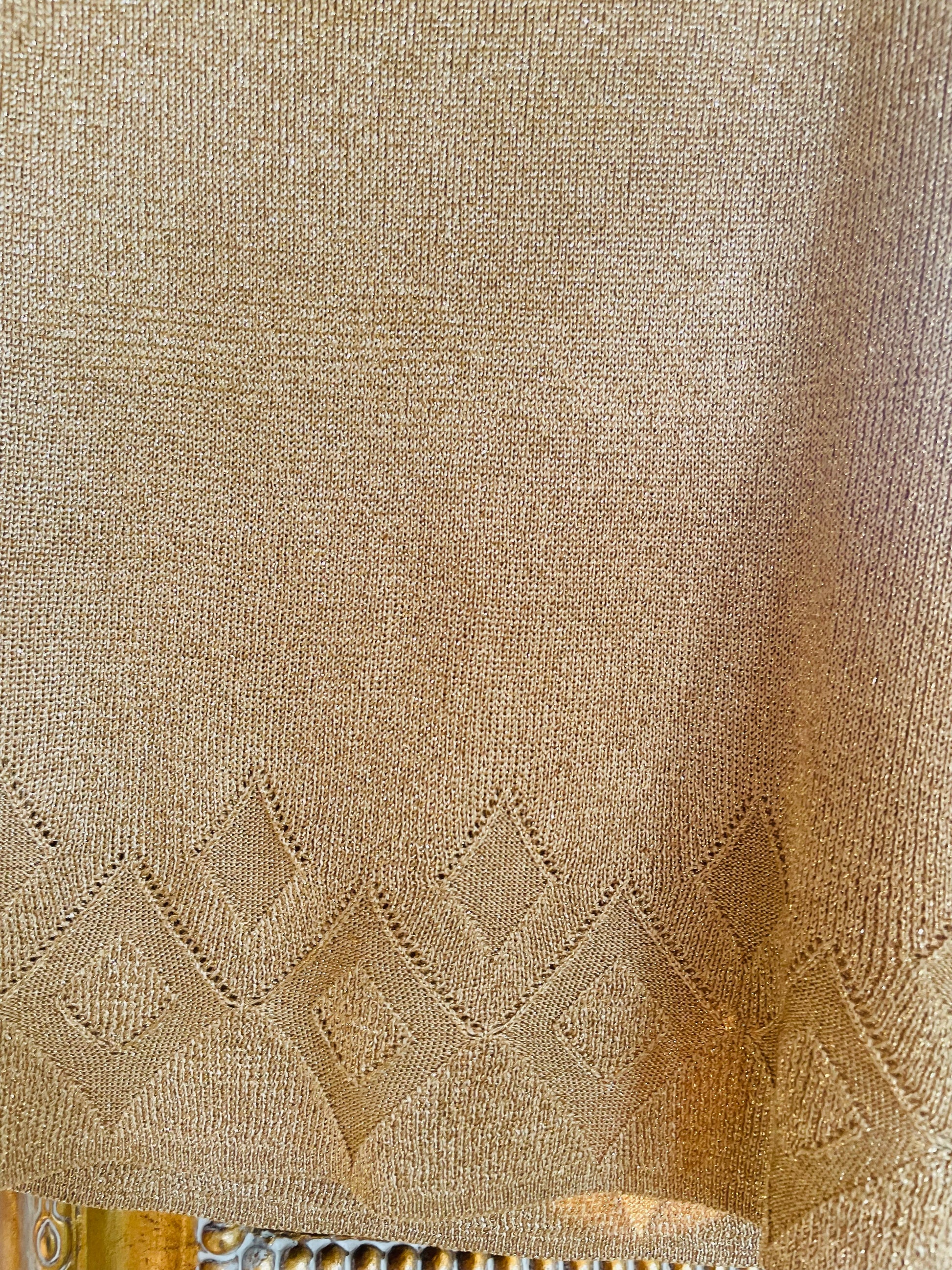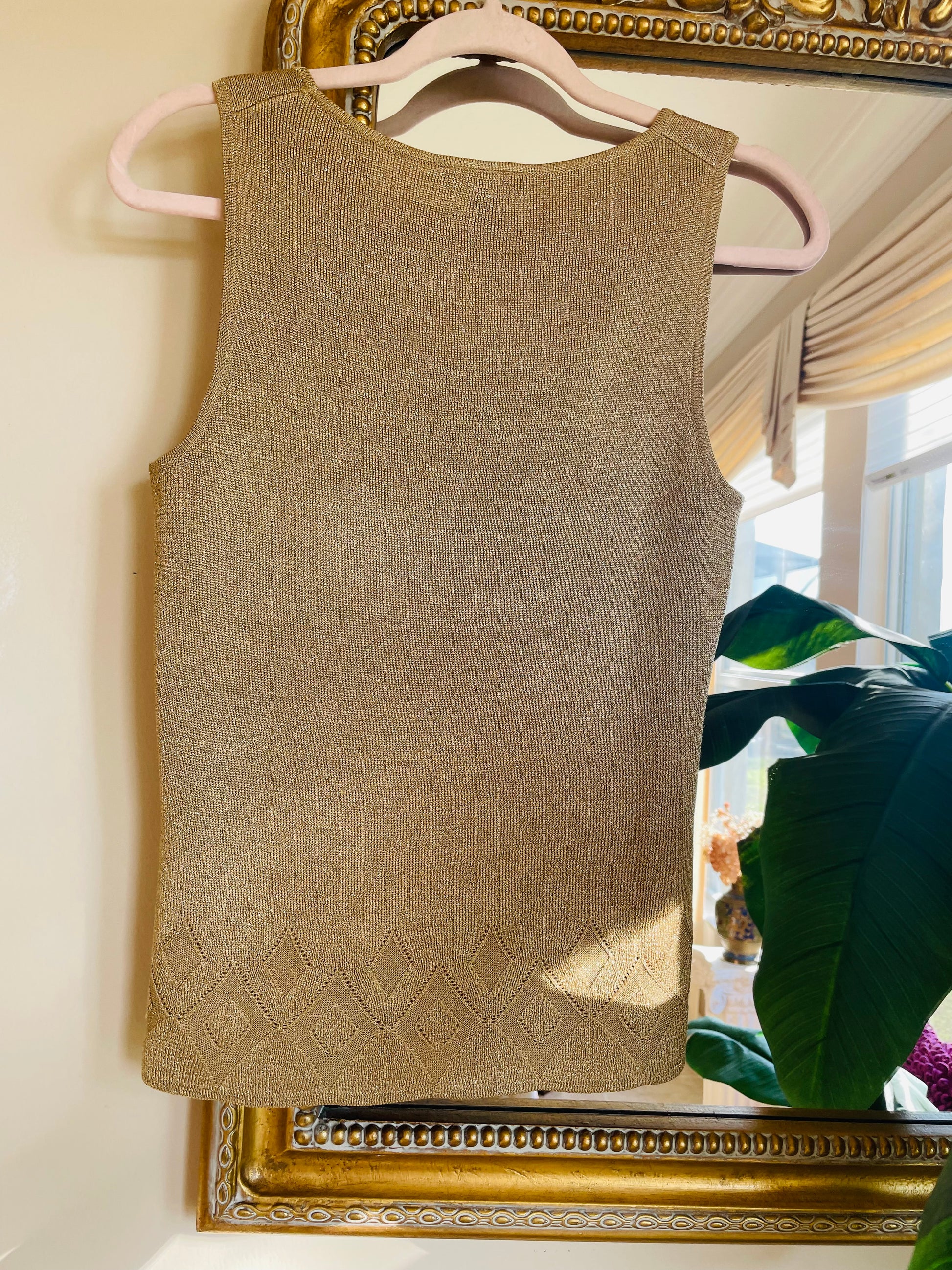 Sleeveless Golden Acetate Nylon Metallic Pullover Sweater Top. Design on bottom front. Easy comfy stretch to fabric. Glam evening style.