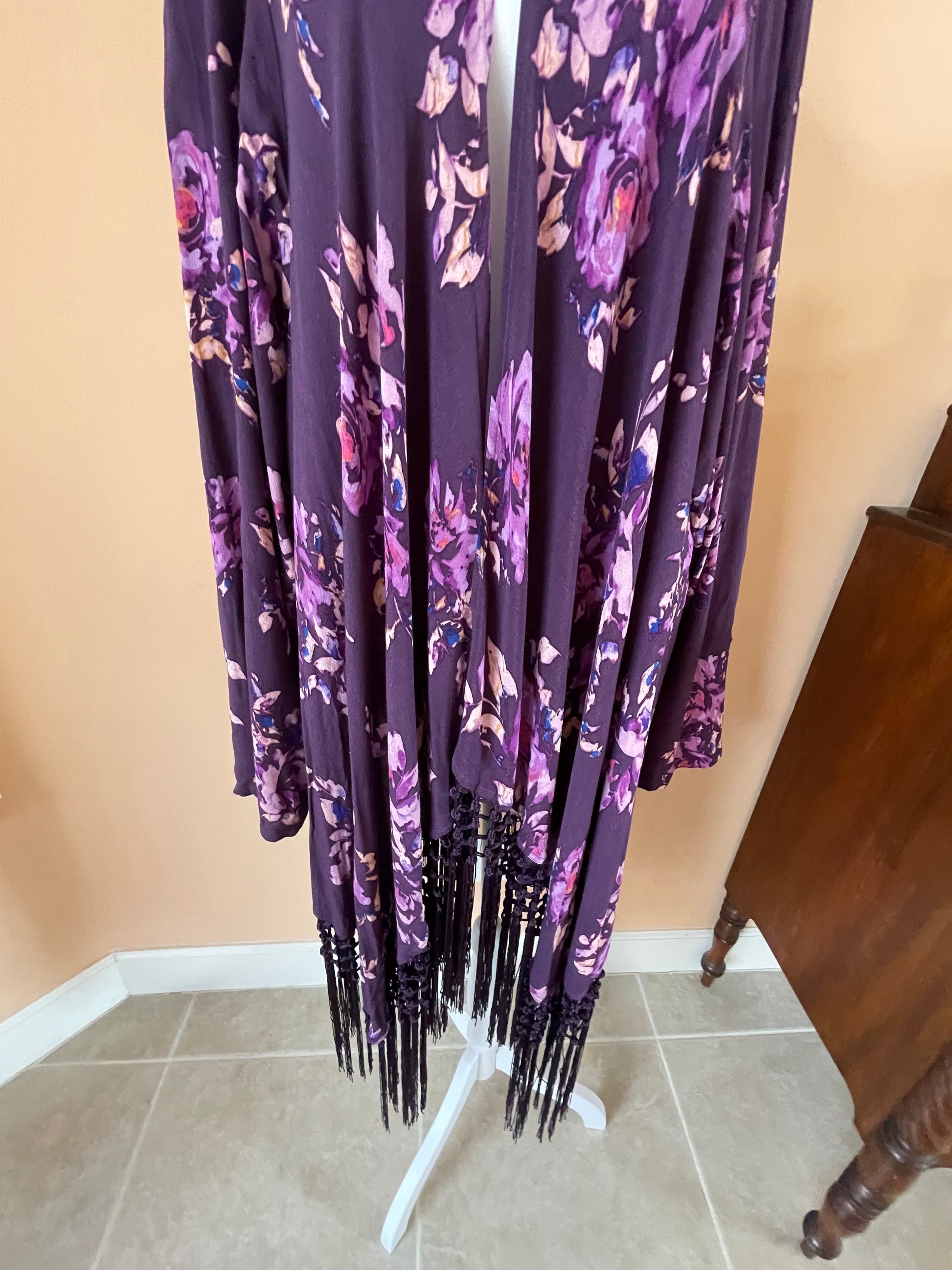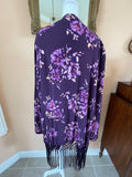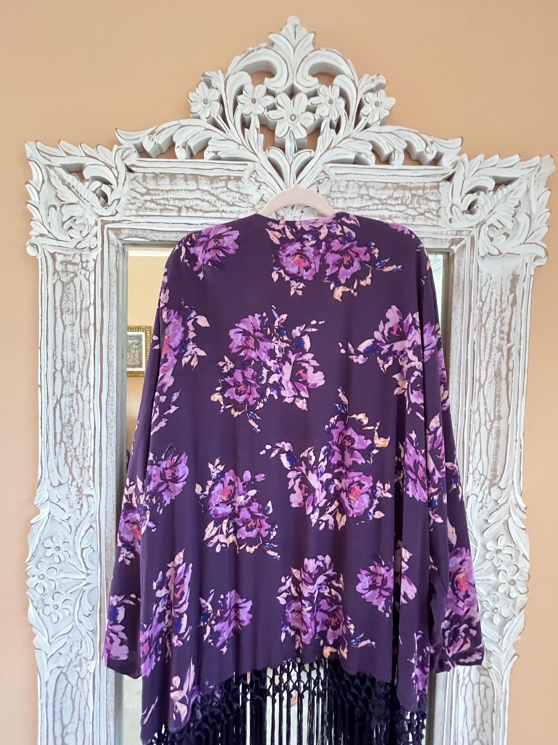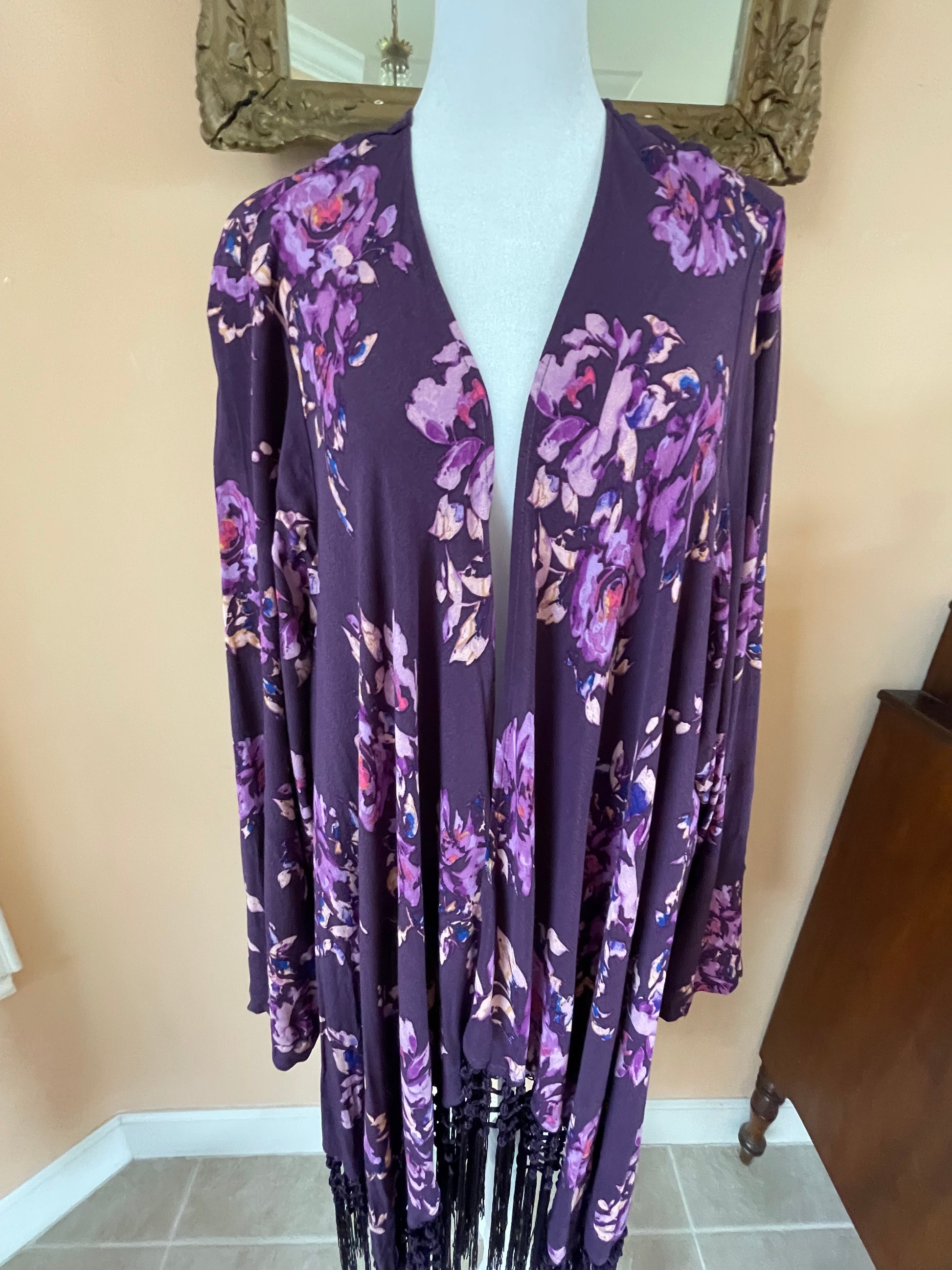 Fun bohemian style duster fairy jacket. Purple Floral print rayon fabric. Fabulous fringe. Long sleeve that can be rolled back with button closure. Open front Excellent condition Brand Torrid Plus size free size Tagged 3X