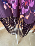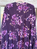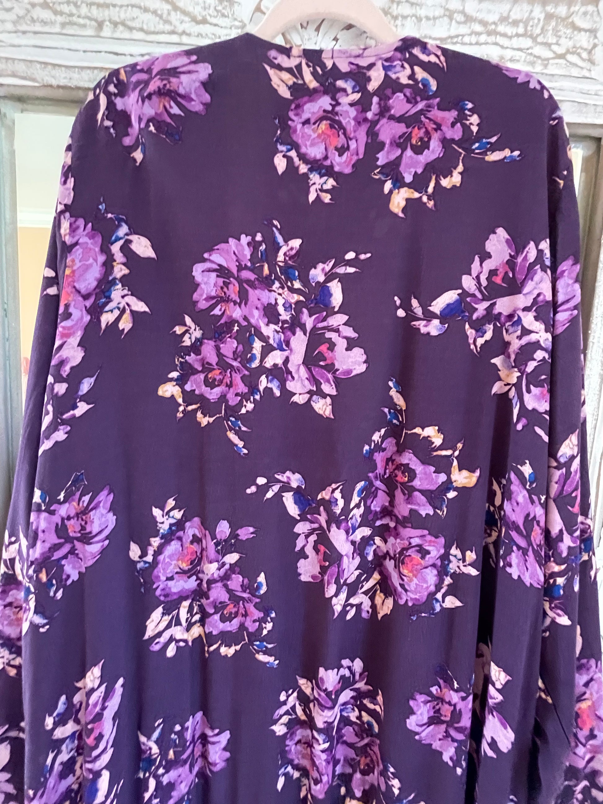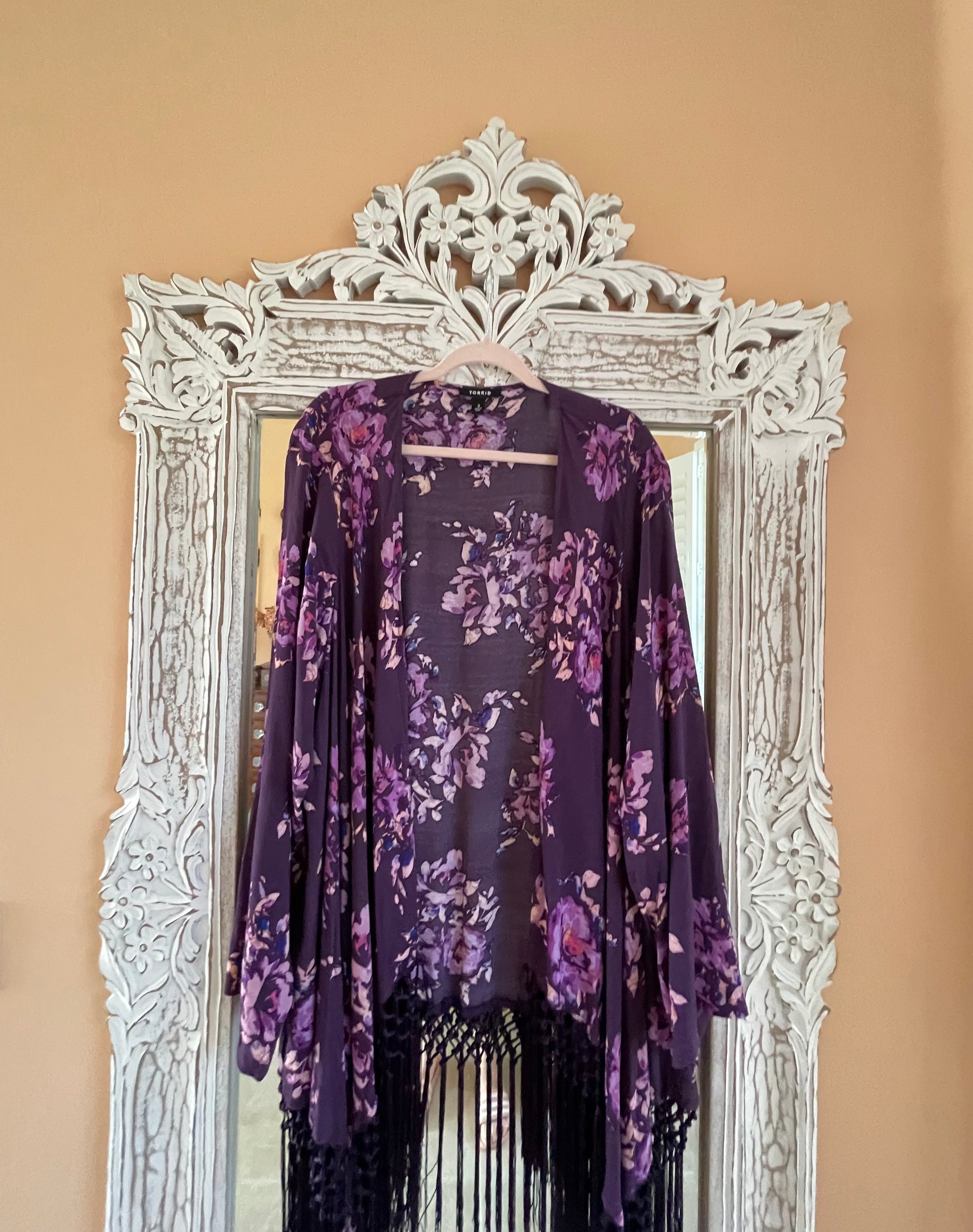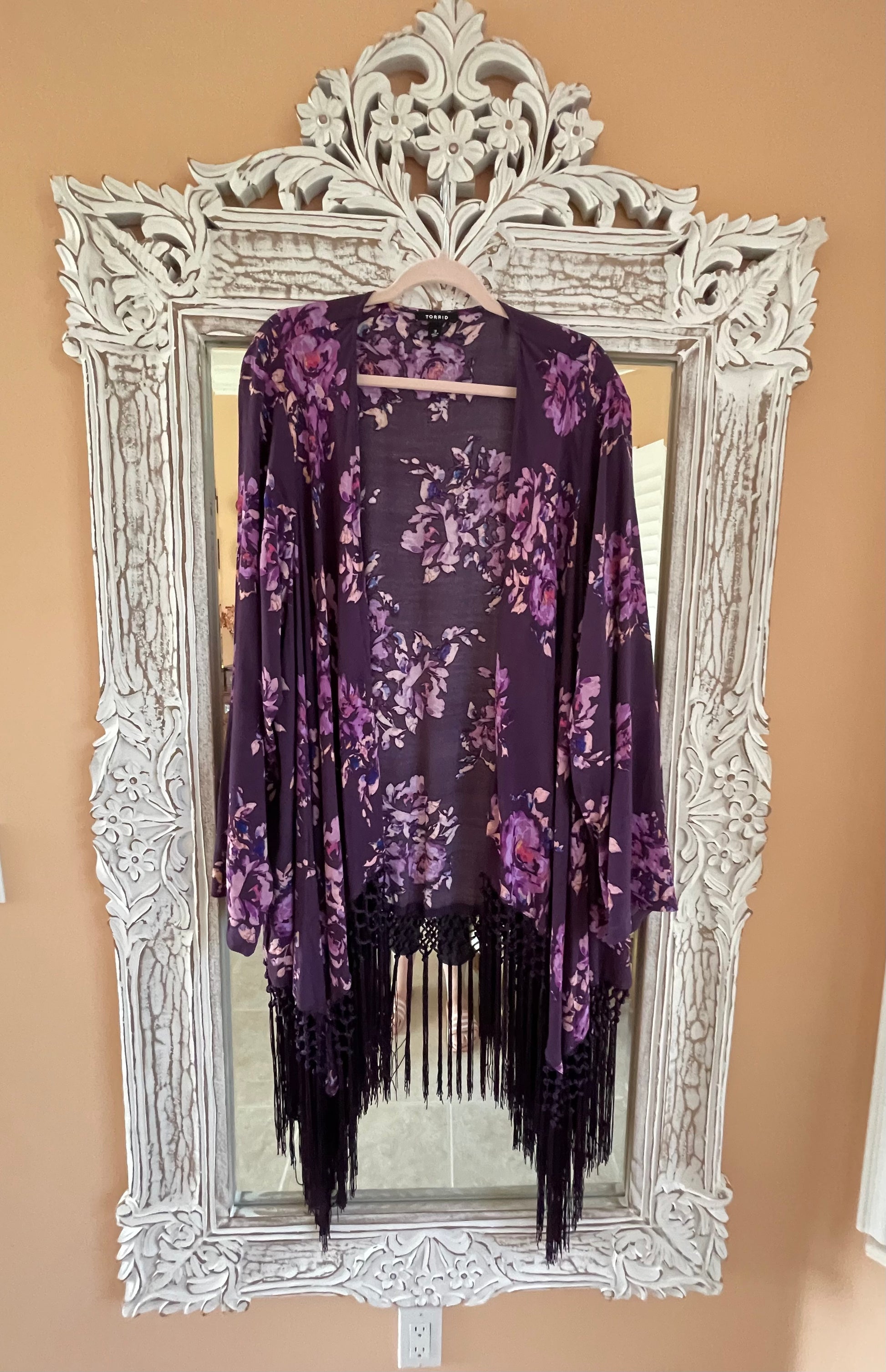 Fun bohemian style duster fairy jacket. Purple Floral print rayon fabric. Fabulous fringe. Long sleeve that can be rolled back with button closure. Open front Excellent condition Brand Torrid Plus size free size Tagged 3X