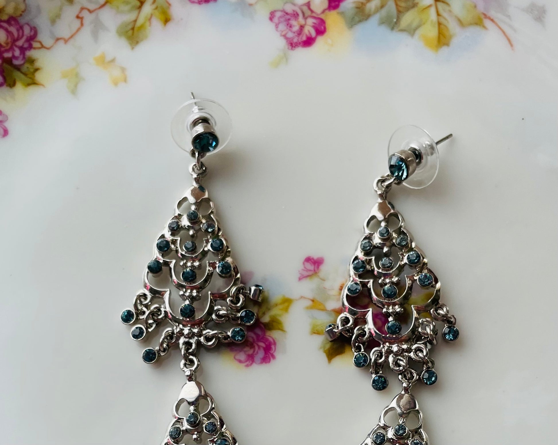 Features. Blue/green rhinestones. Silver tone. Pierced Glam Elegant Comes with gift pouch
