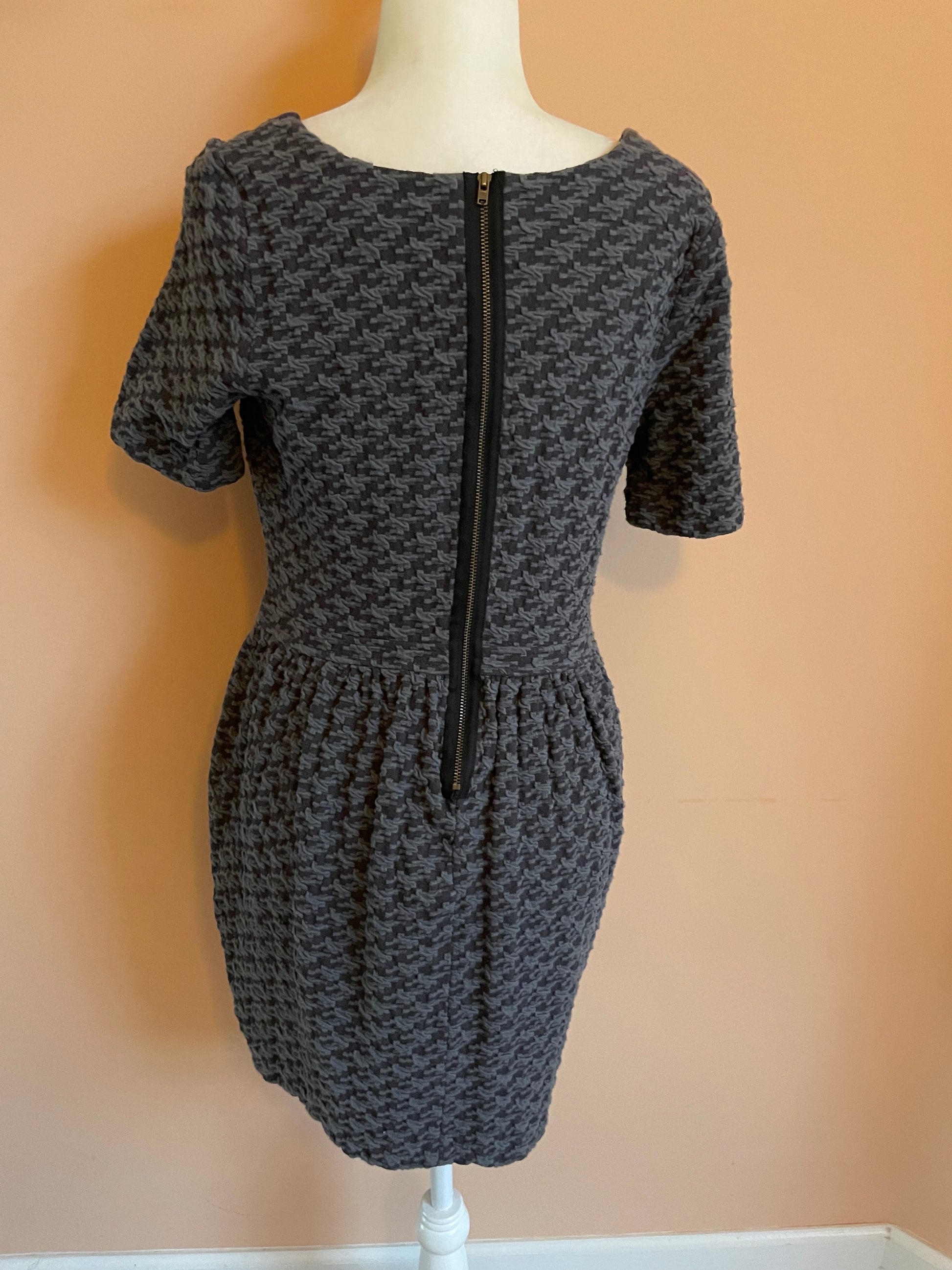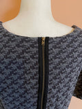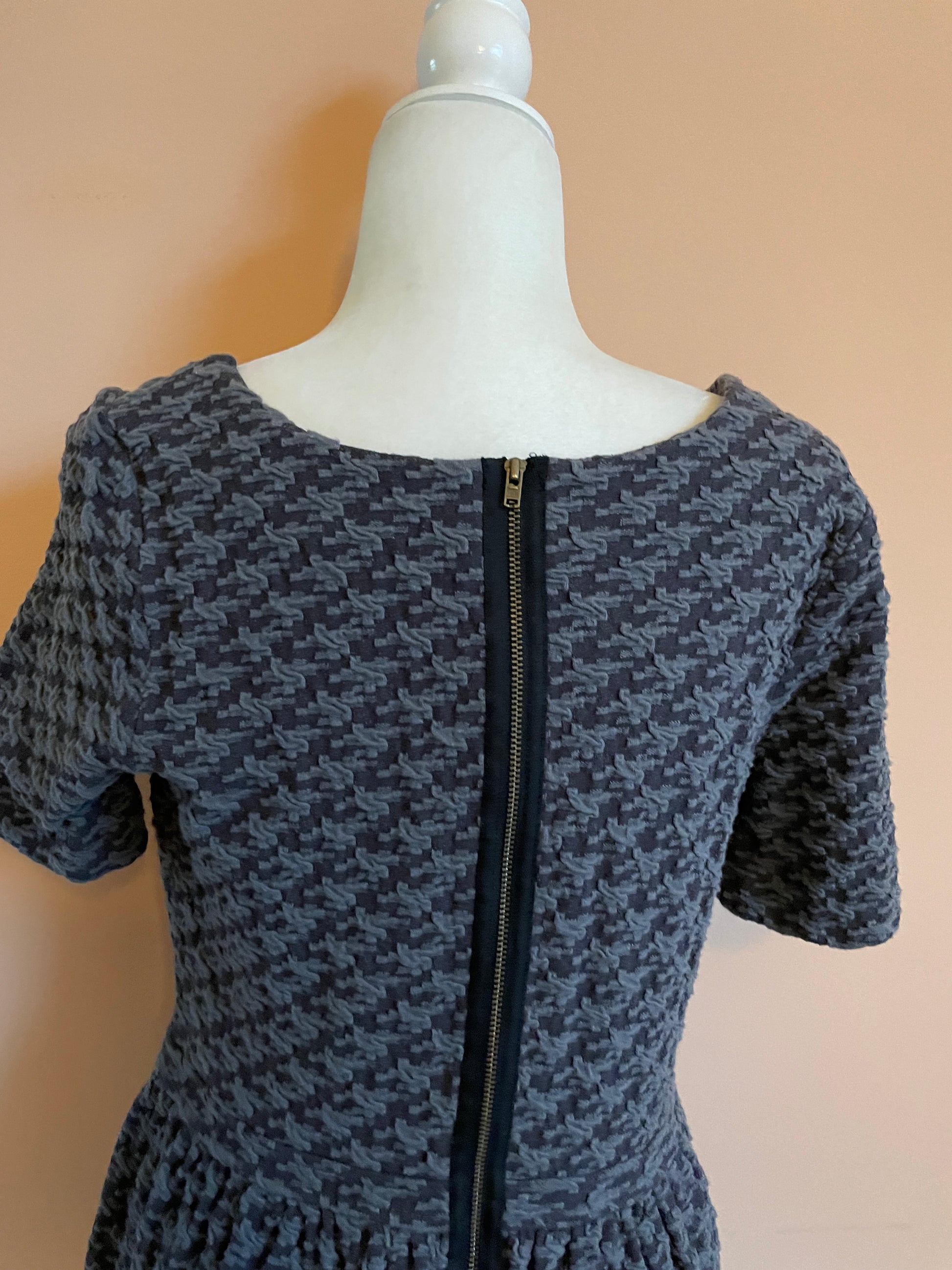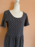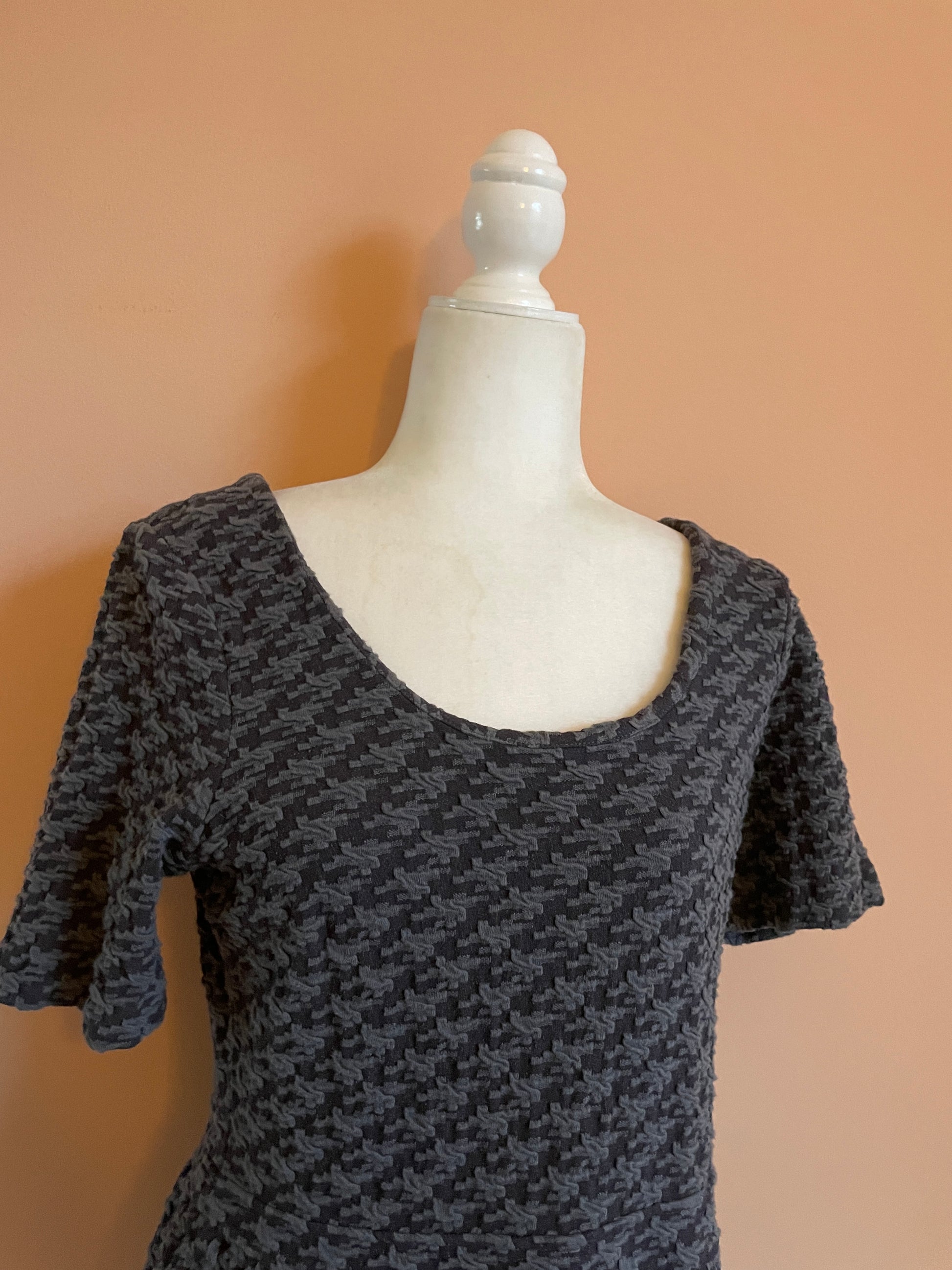 A 2000s short sleeve textured knit mini dress in gray that balances structure and softness.
