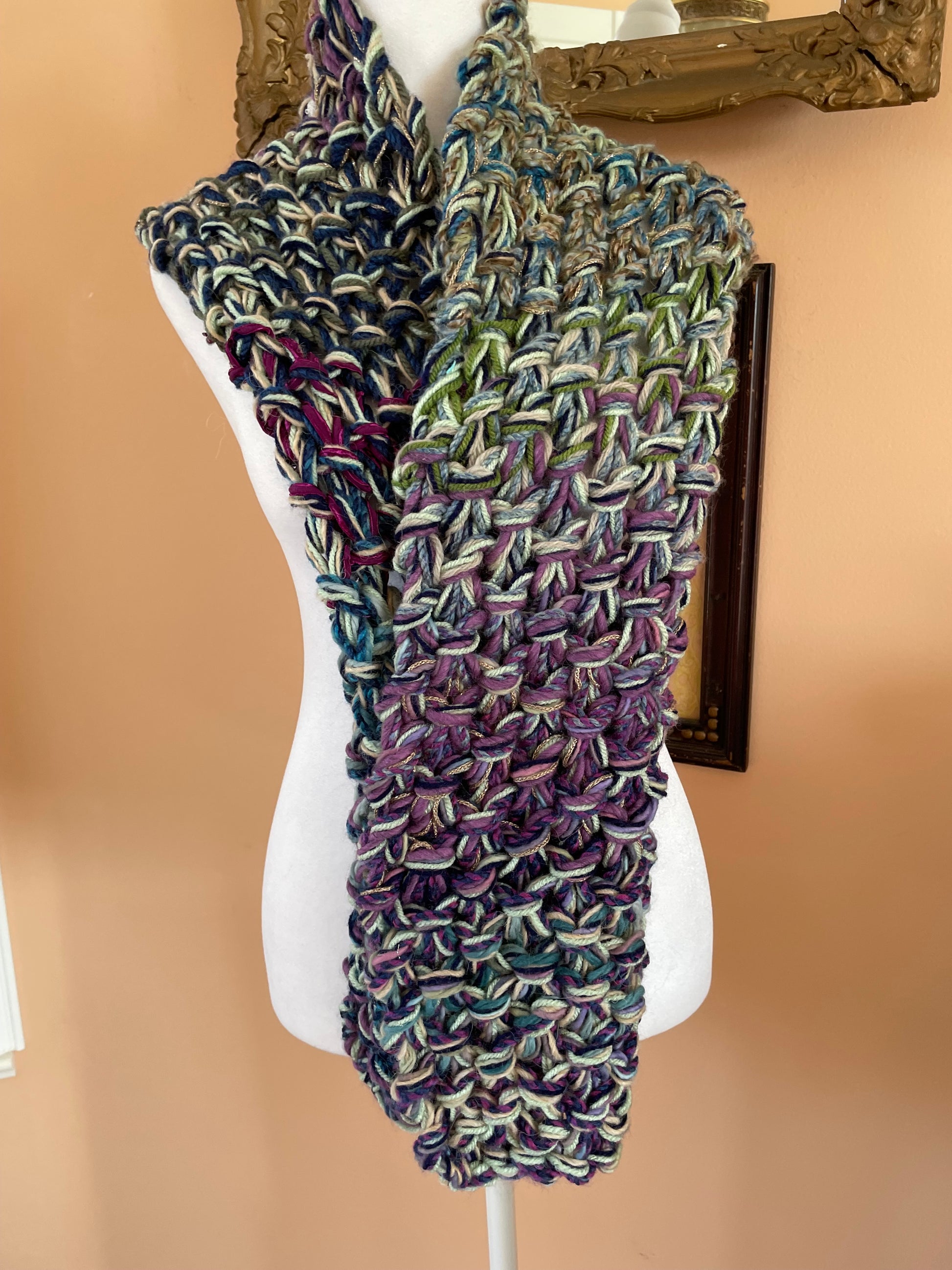 This hand knit winter scarf blends four richly toned yarns into a cozy, textured statement that feels as good as it looks. Crafted by hand with care, its chunky knit delivers serious warmth while subtle gold metallic threads catch the light for an understated glow. Designed to be worn and loved by anyone, this one-of-a-kind scarf brings individuality and comfort to cold-weather days.