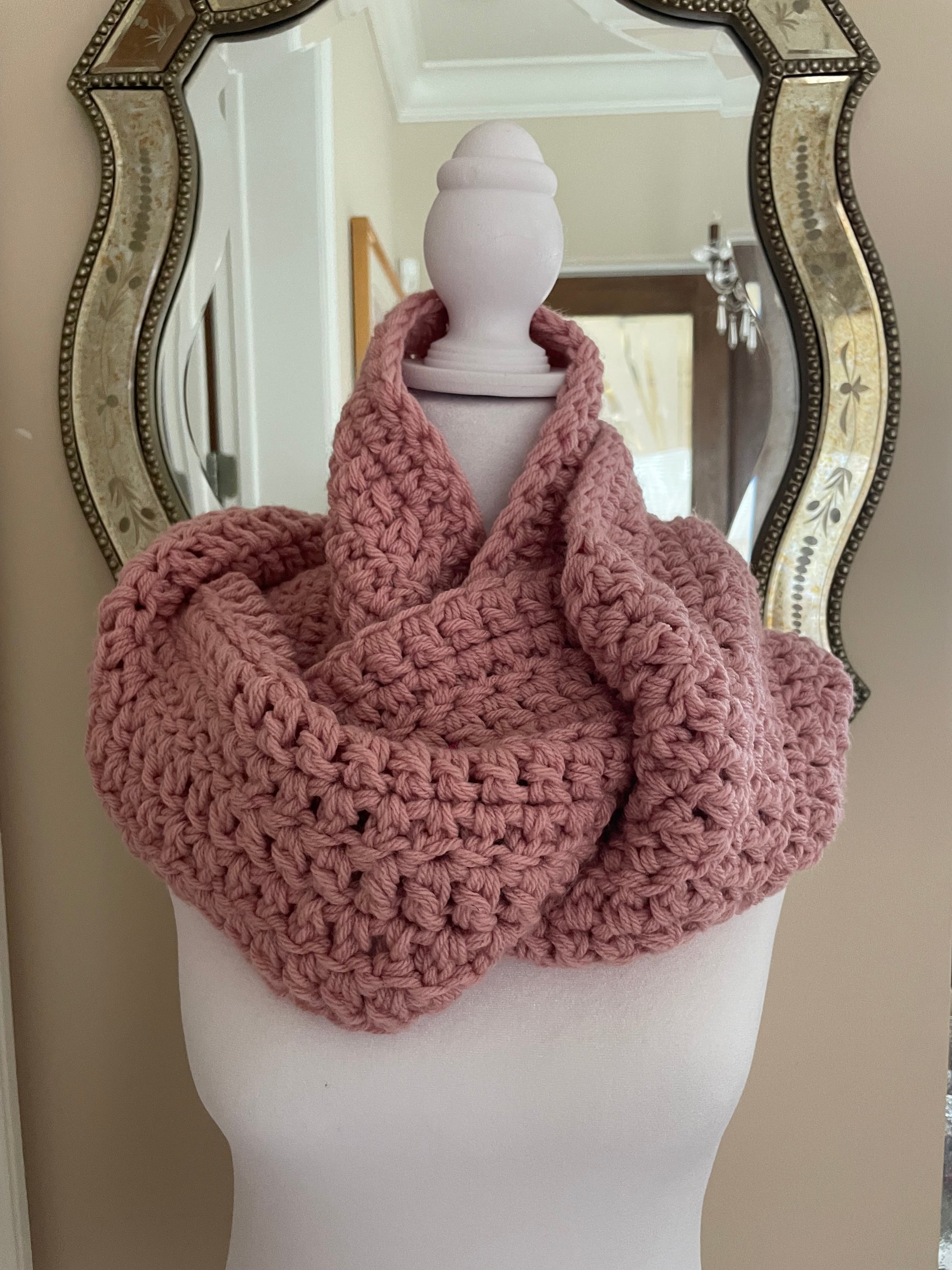 Features. Circle Wrap style. Acrylic yarn. Winter wear. Cozy. Mauve pink color