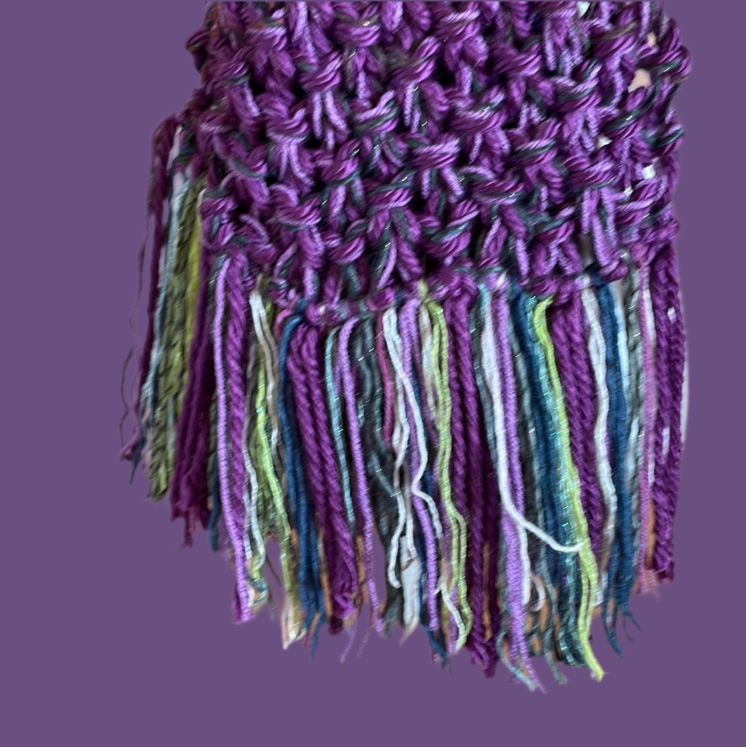 One of a kind handmade by Blondes in Heaven. Multiple yarn mix in striking purple shades you will keep warm in a mix of wool & acrylic yarns. Cascading fun mix of fringe. 8” x 65” Excellent condition NEW.