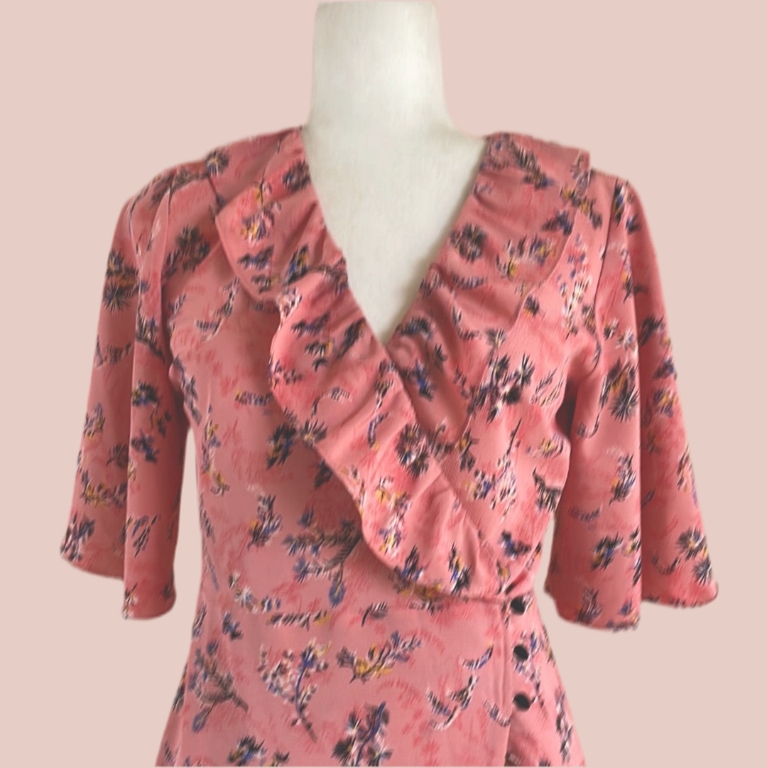 Features Ruffles Wrap Style Button loop closures Pinkish coral color Daywear Poly Micro Mini