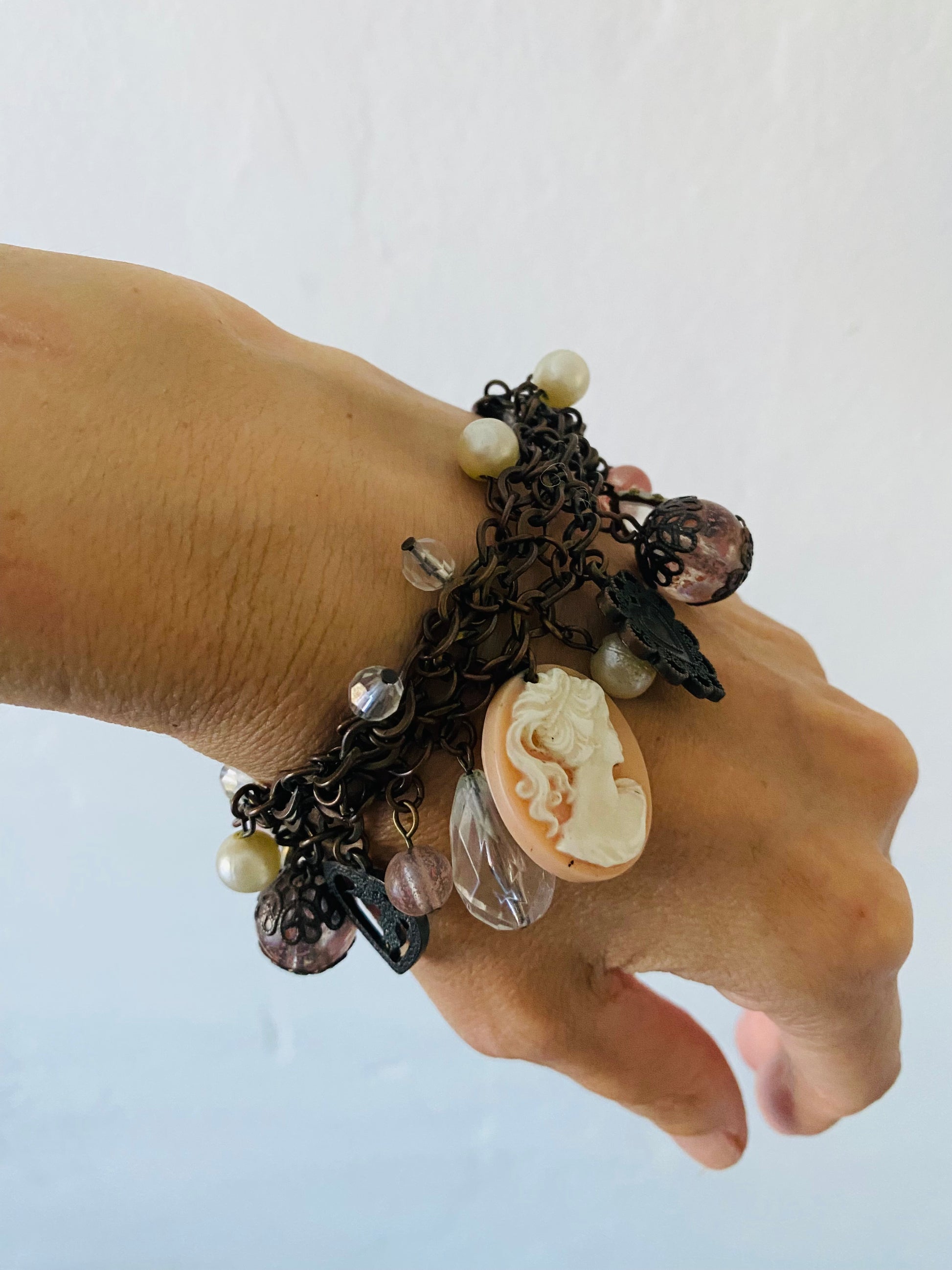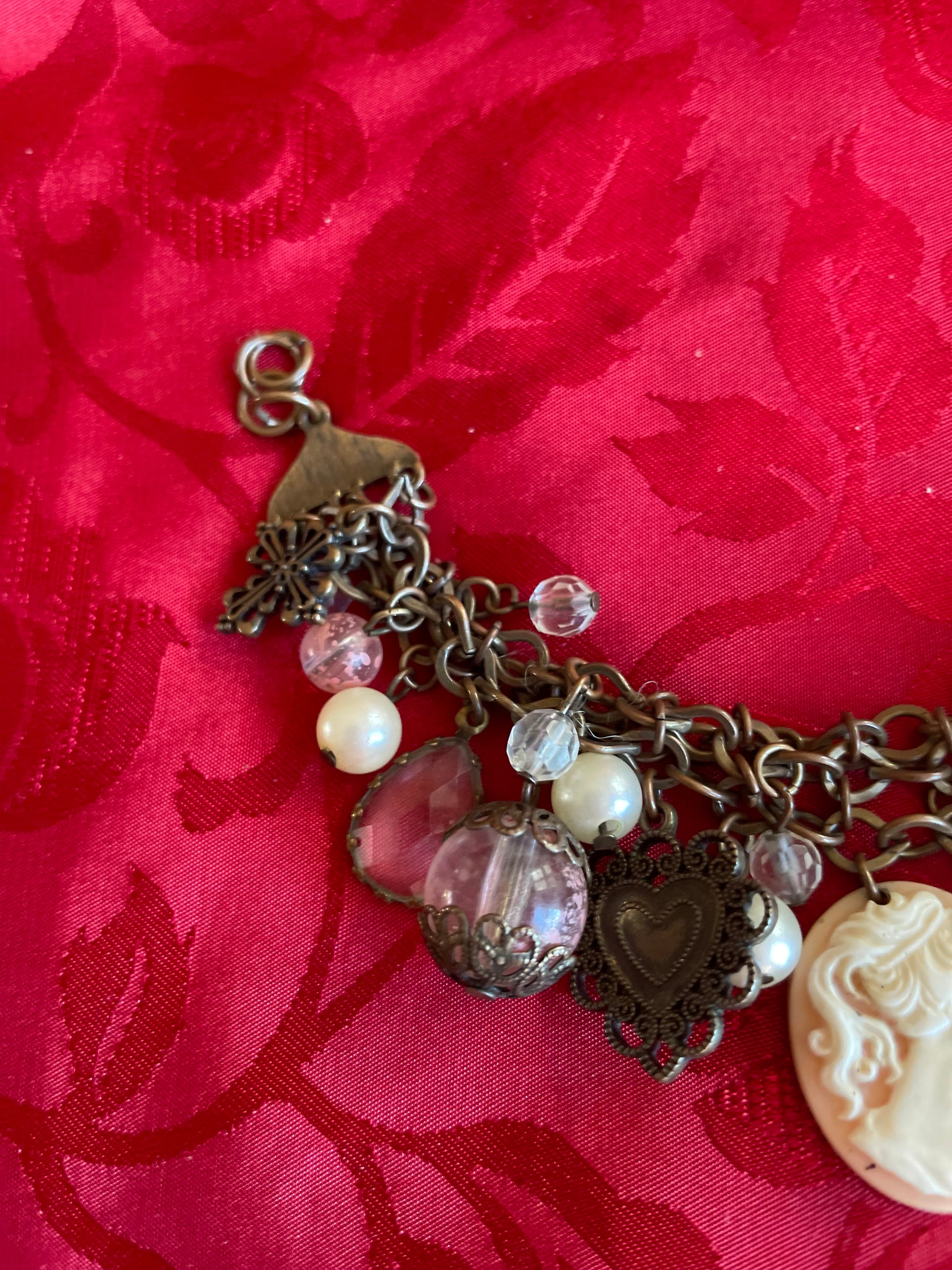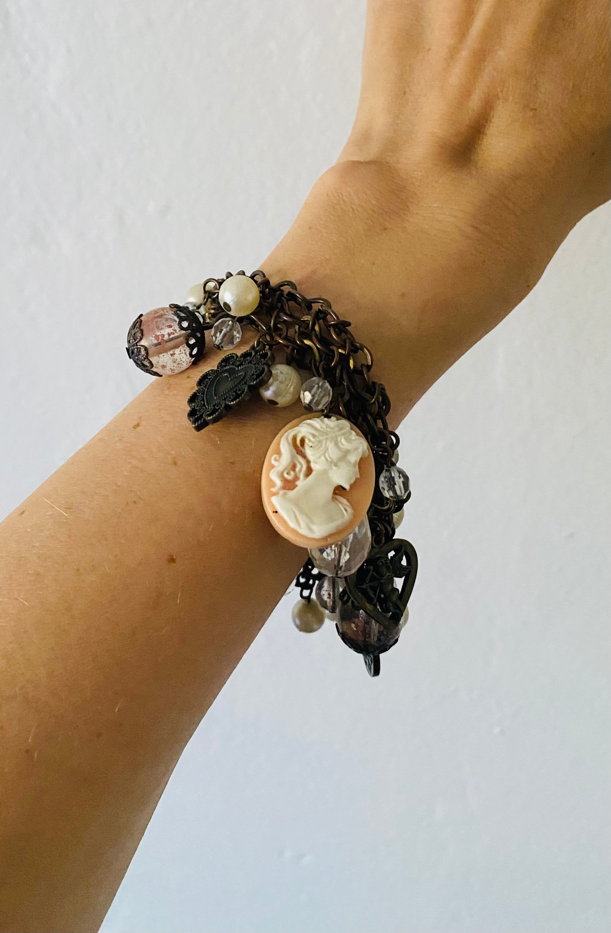 Vintage 80s charm bracelet. Beads Heart. Cherub. Cross Portrait Charms Lobster clasp closure