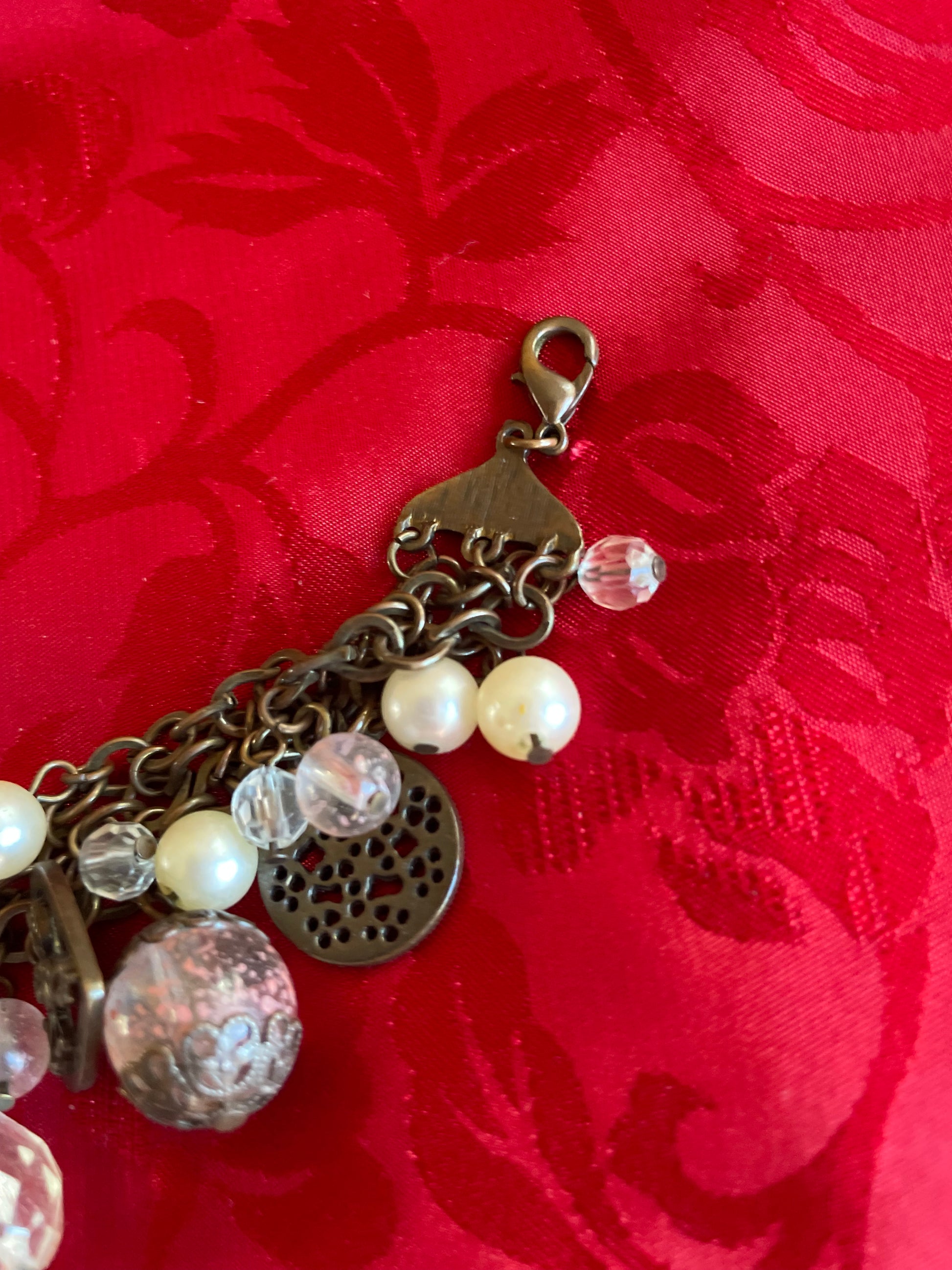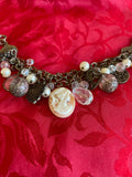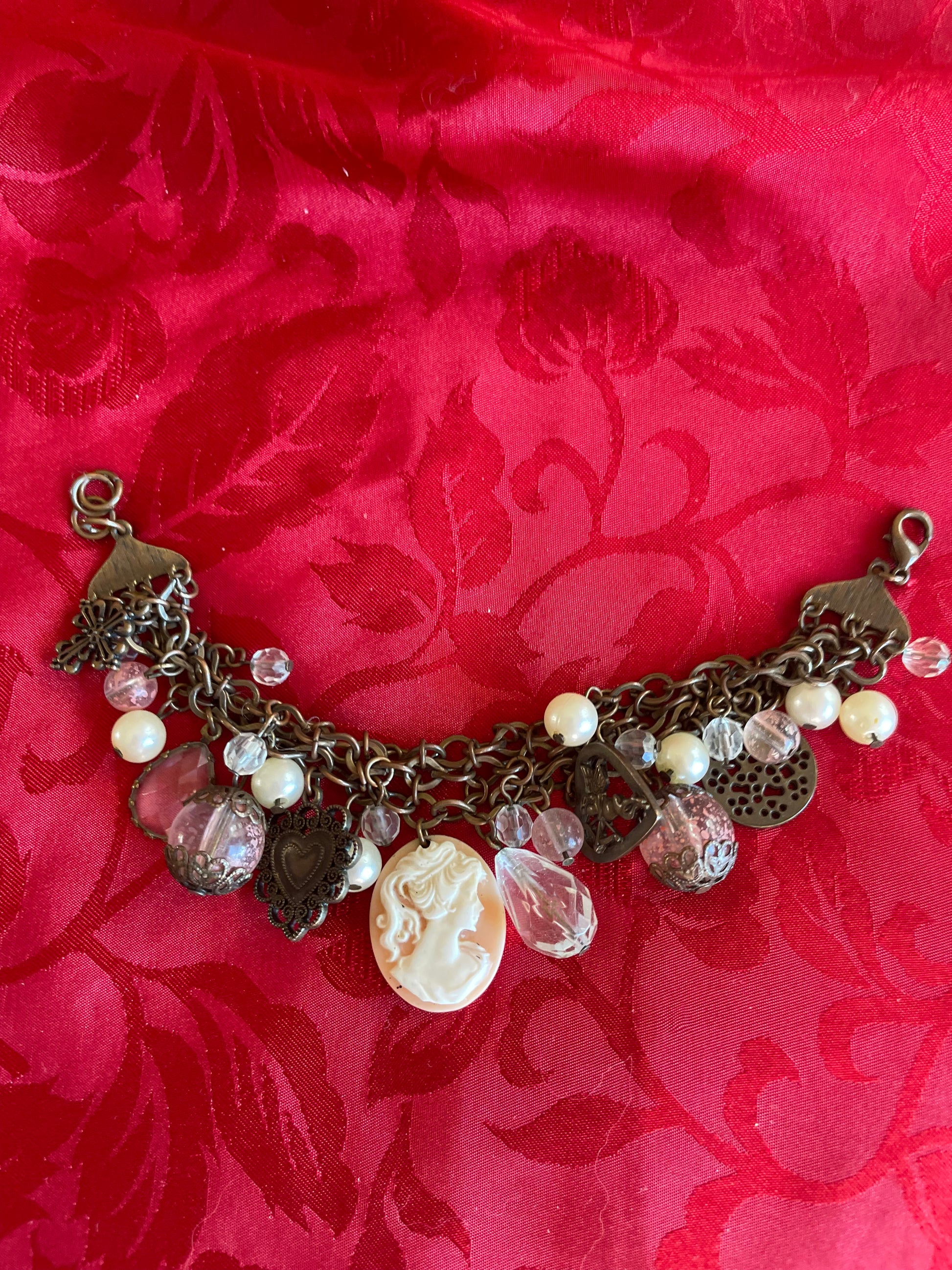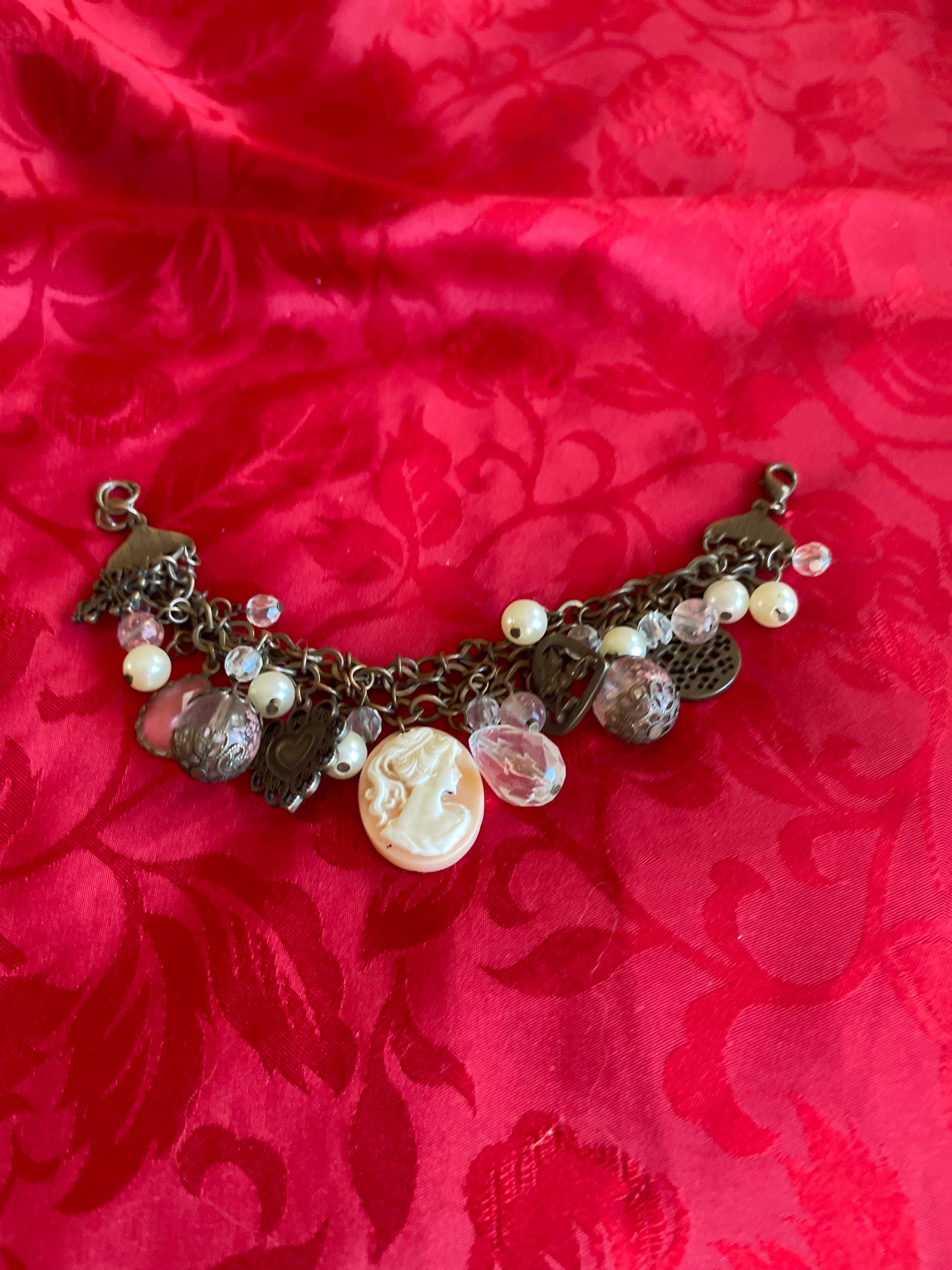 Vintage 80s charm bracelet. Beads Heart. Cherub. Cross Portrait Charms Lobster clasp closure