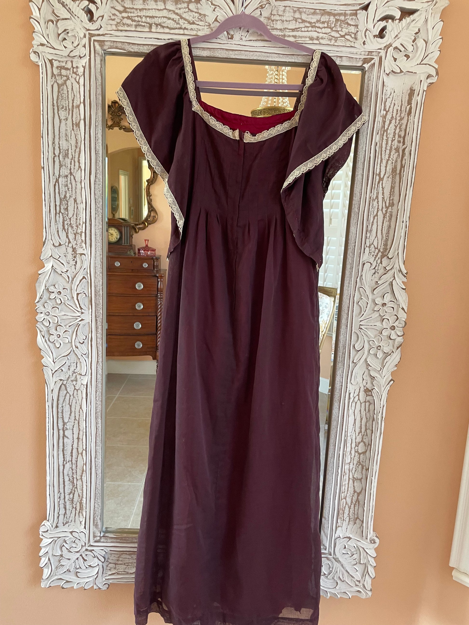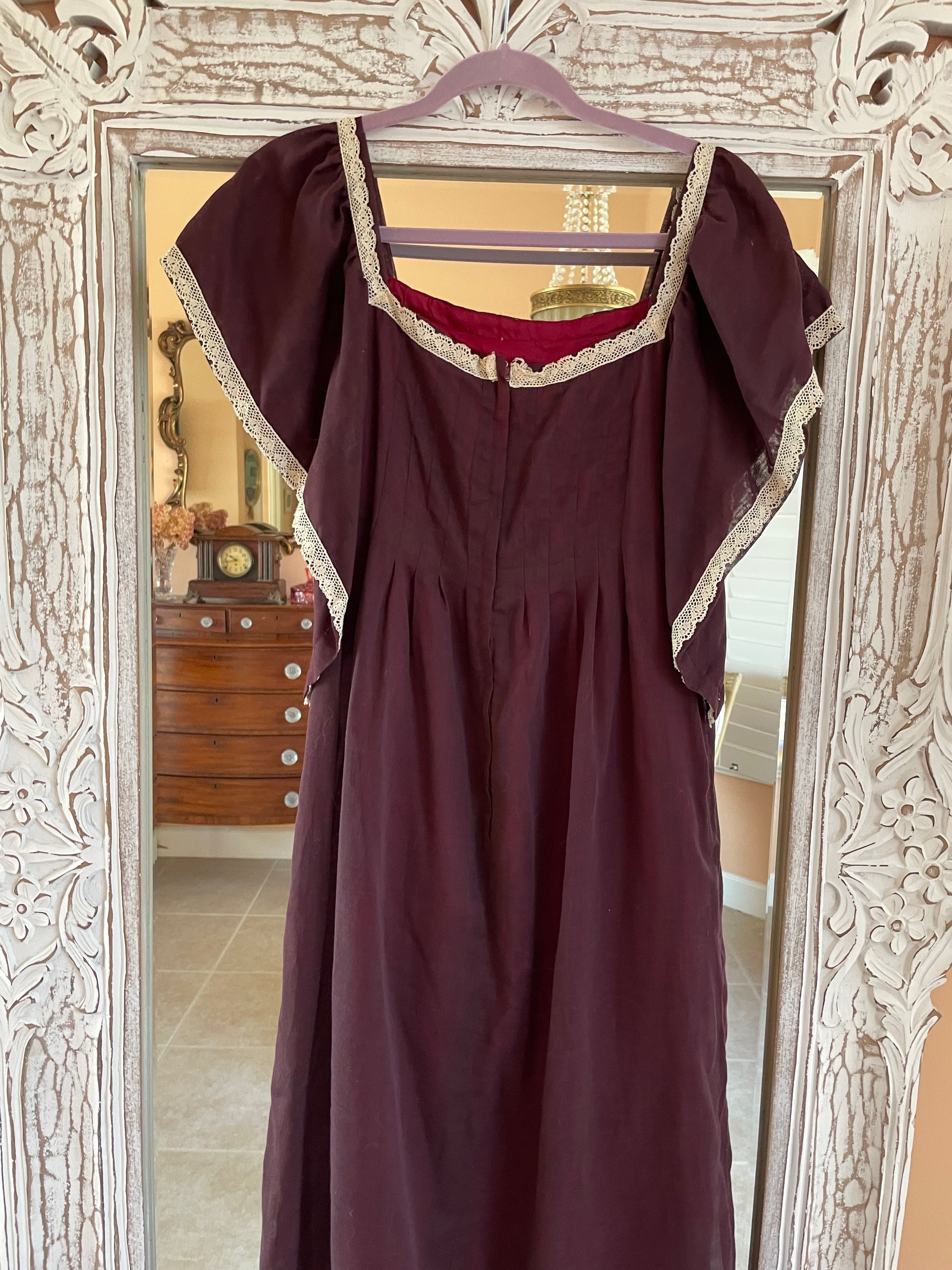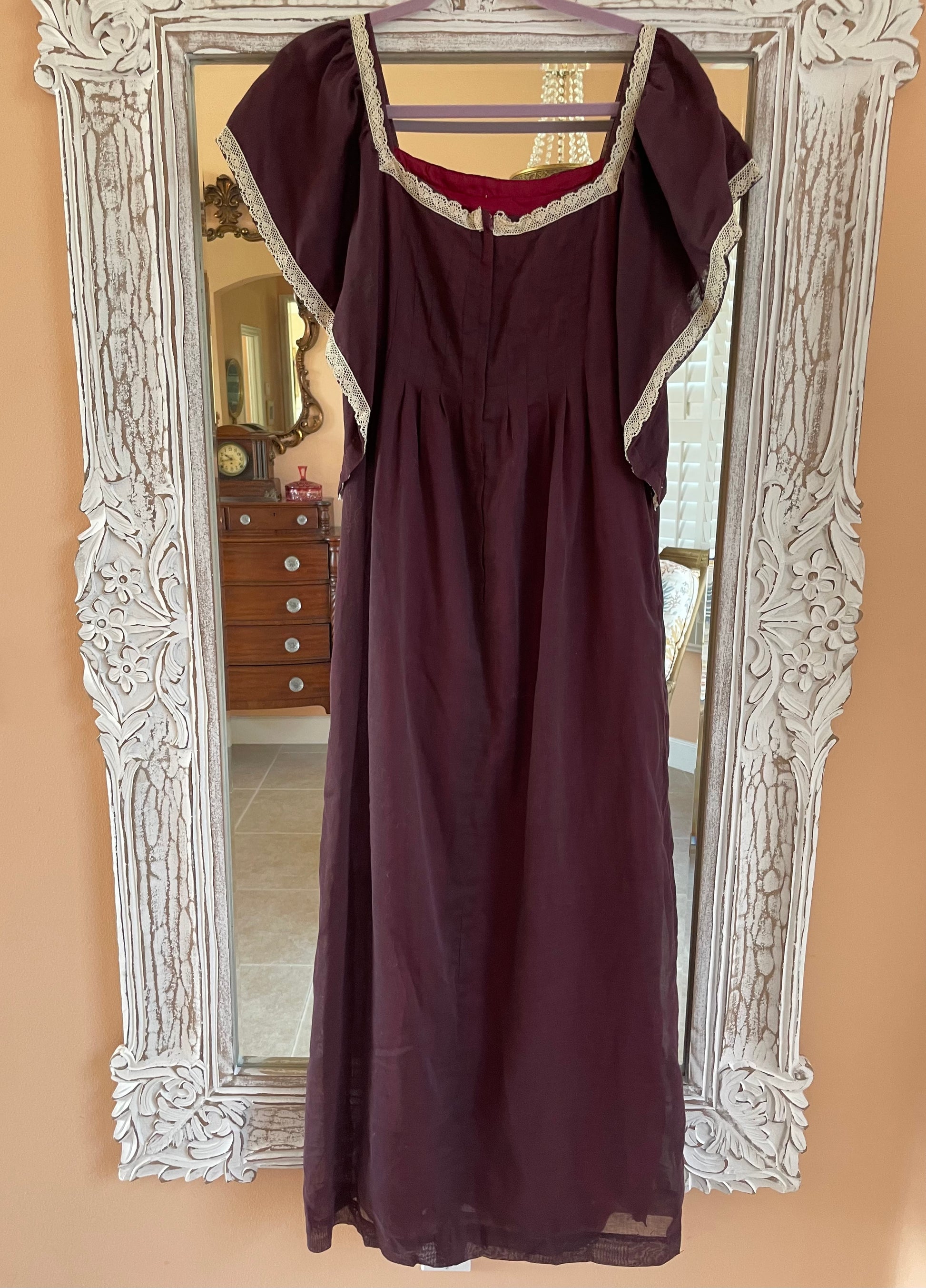 Rare unique handmade vintage dress. Brown color with hues of burgundy coming through because of the colorful lining underneath. Whisper of white lace on neckline. Pleated bodice with empire waist.