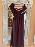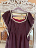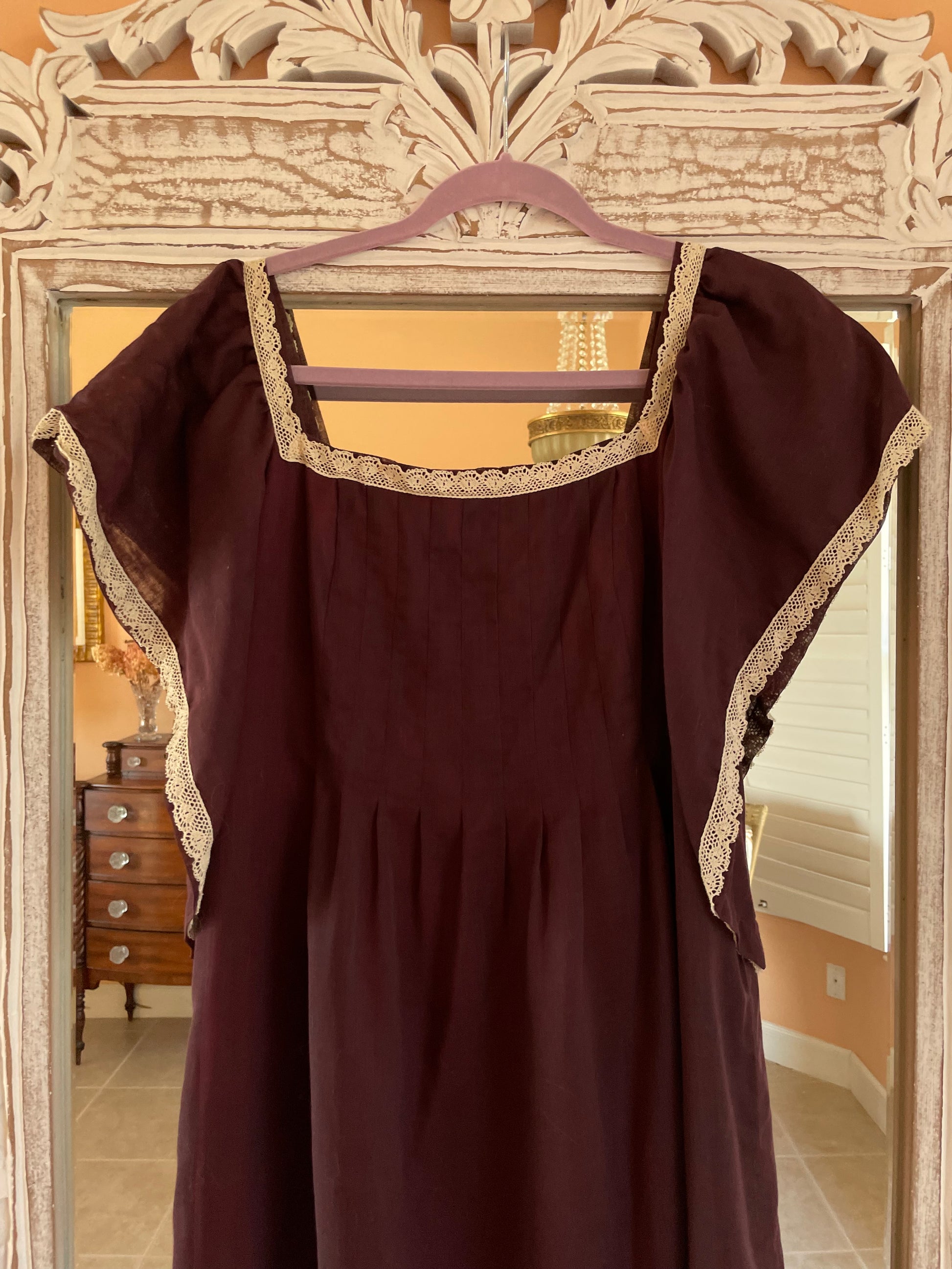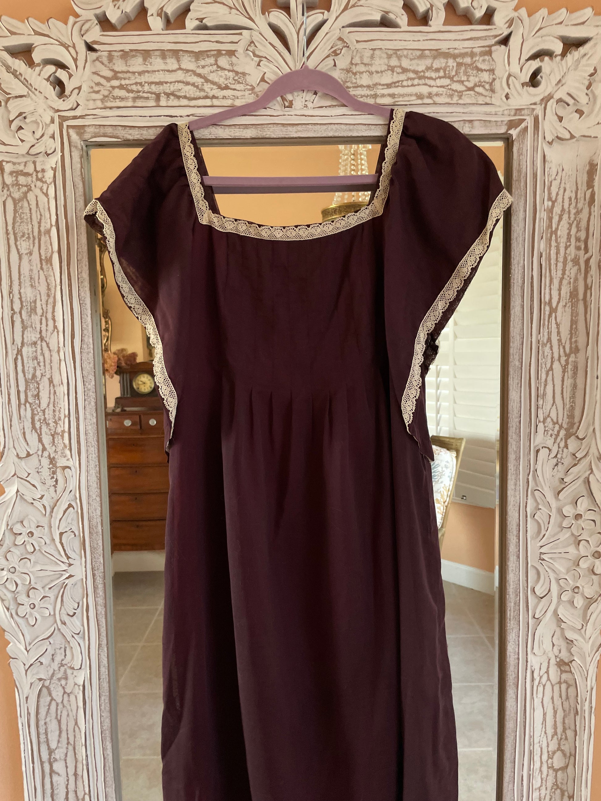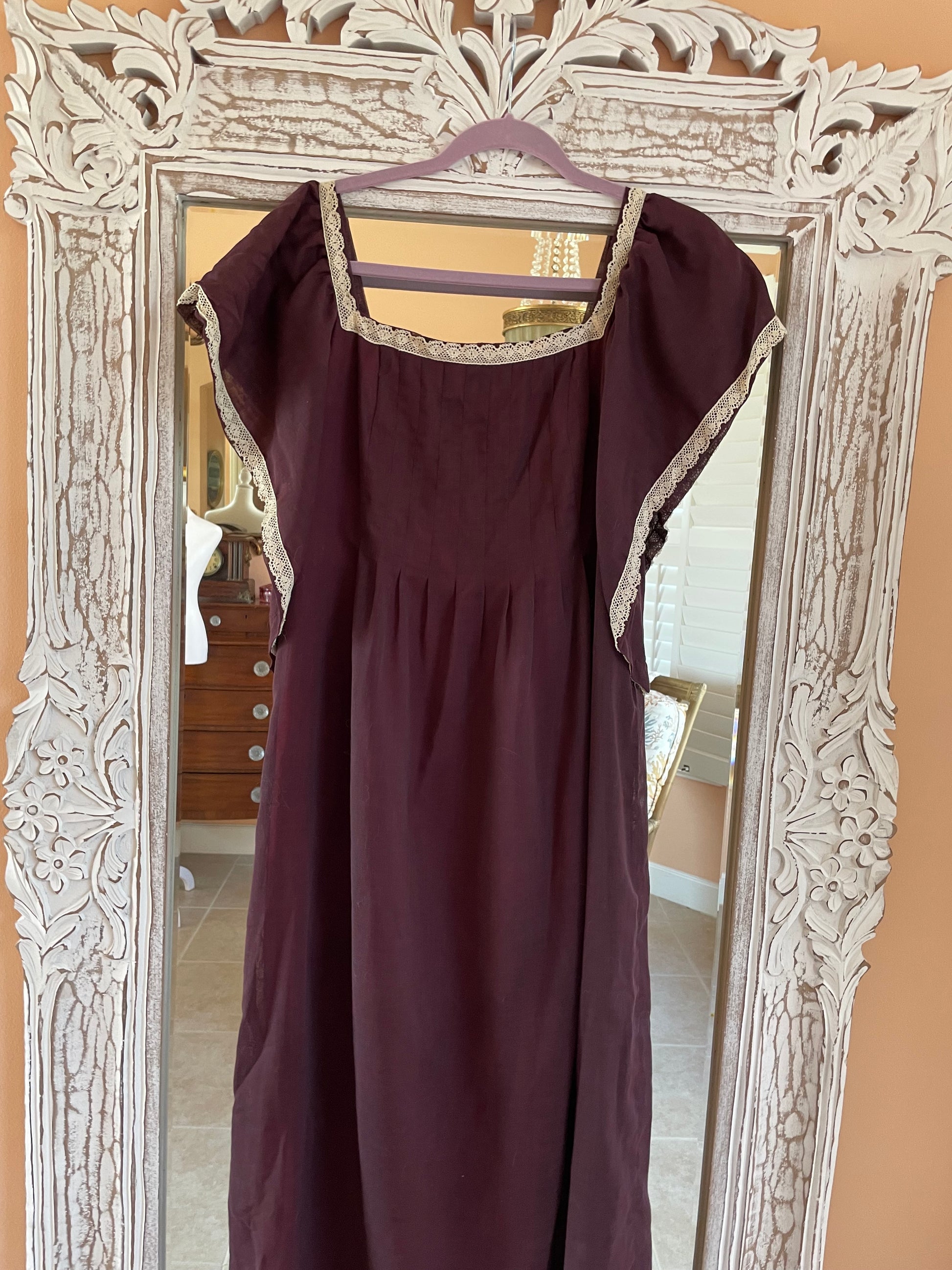 Rare unique handmade vintage dress. Brown color with hues of burgundy coming through because of the colorful lining underneath. Whisper of white lace on neckline. Pleated bodice with empire waist.