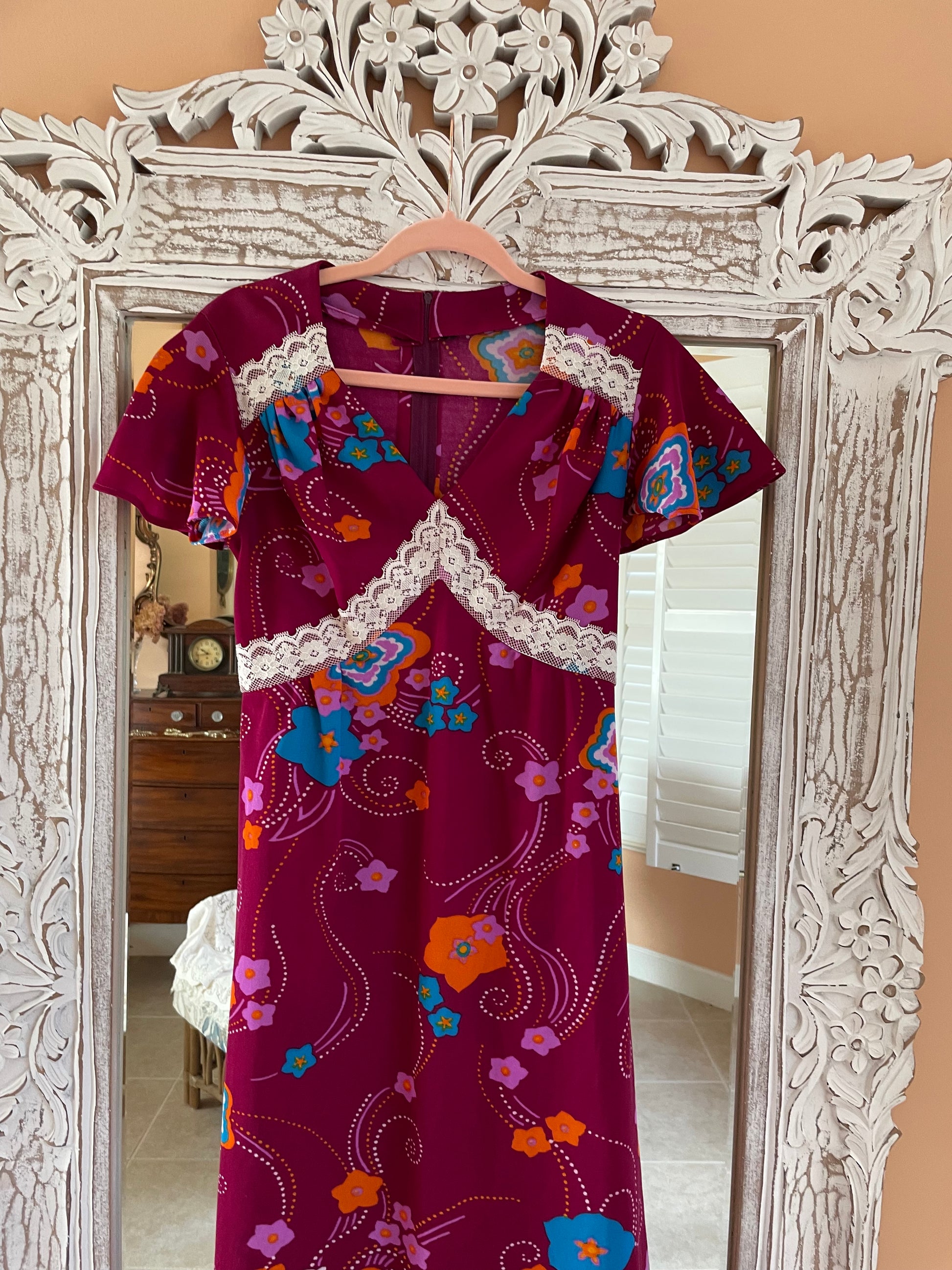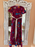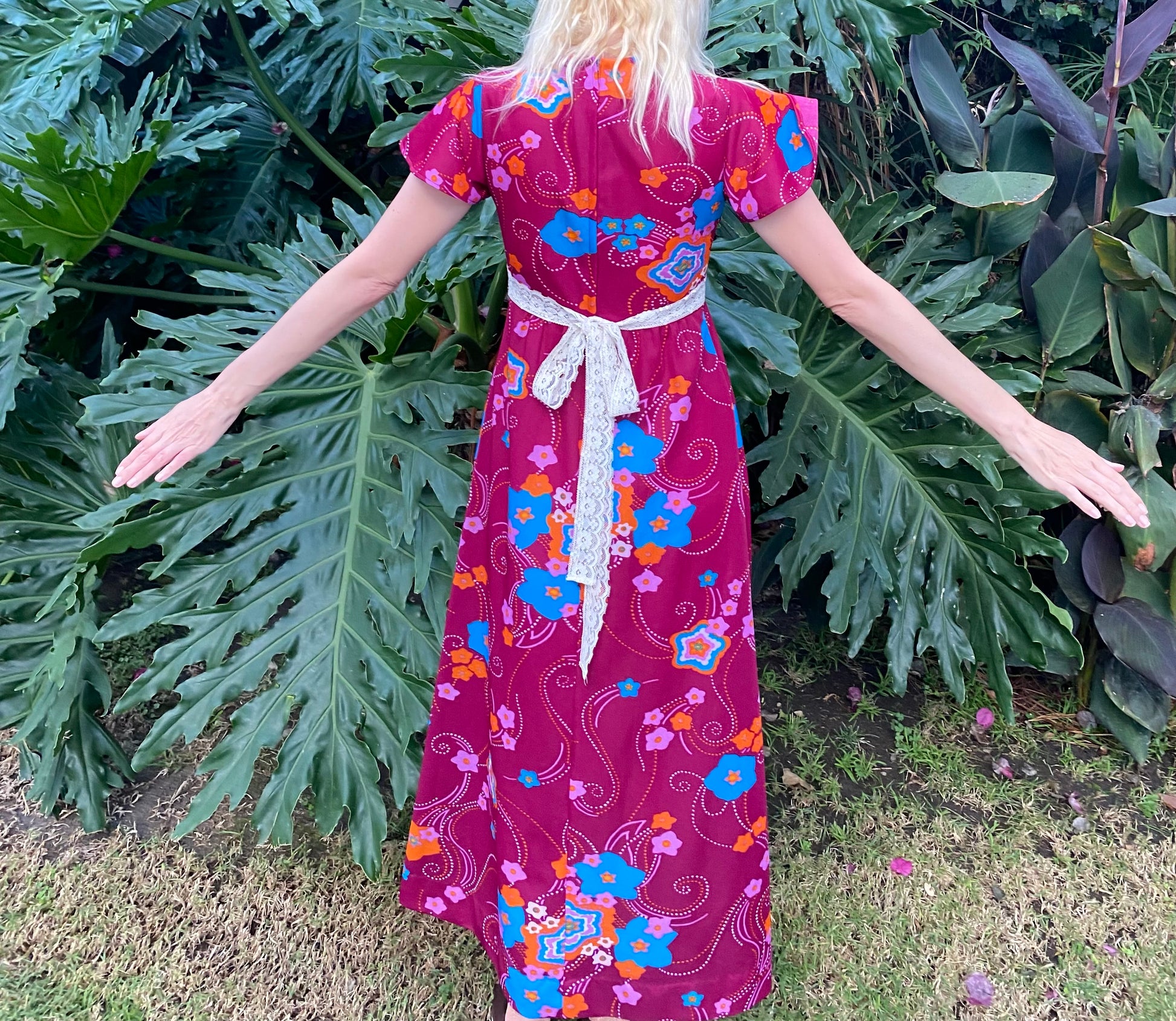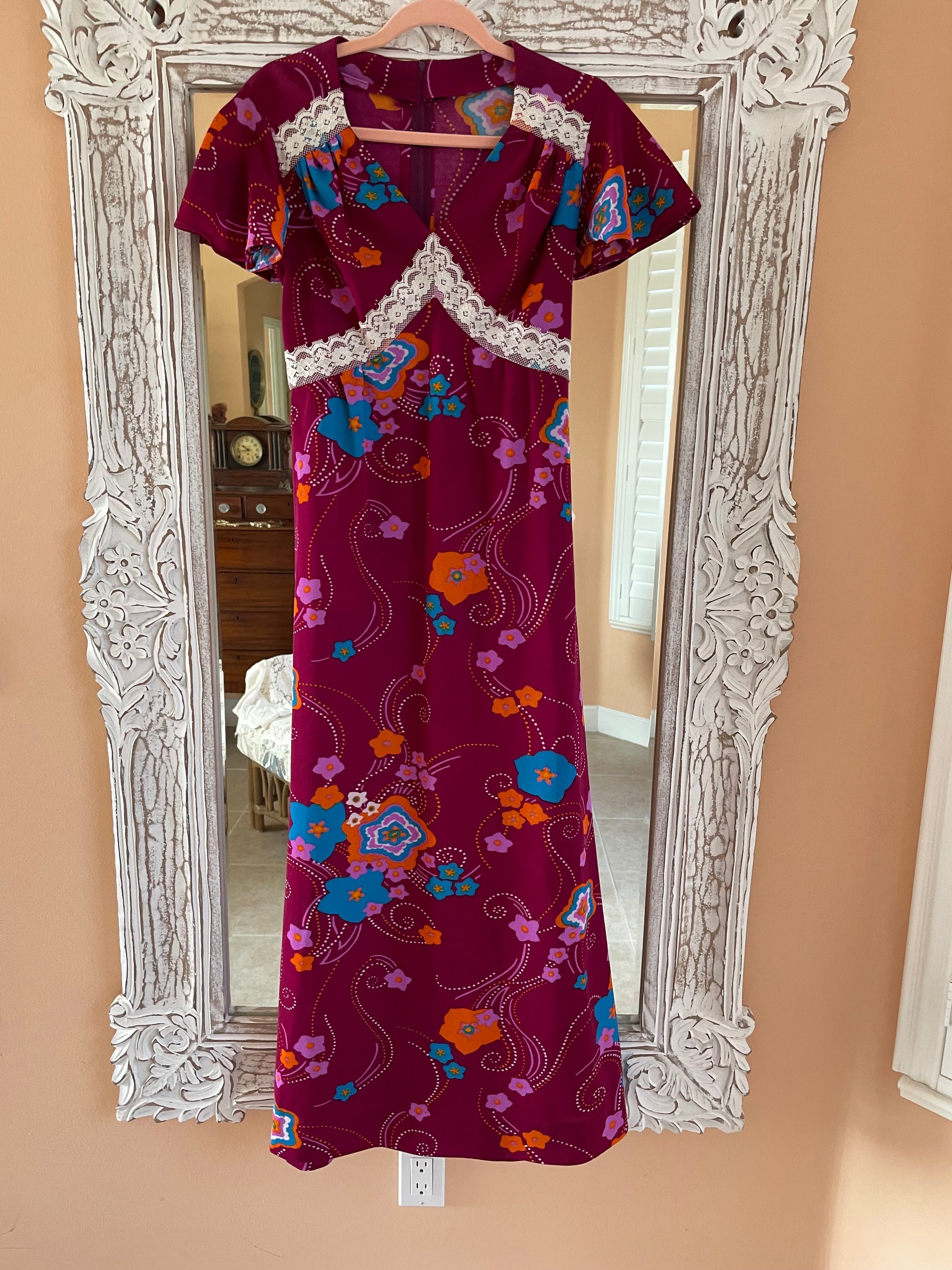 70s one of a kind maxi dress. Empire waist with lace bow tie back. Back zip closure. Short sleeve.