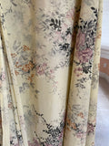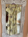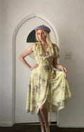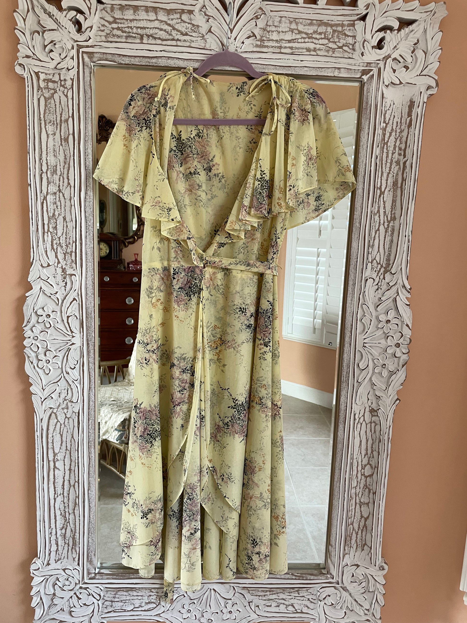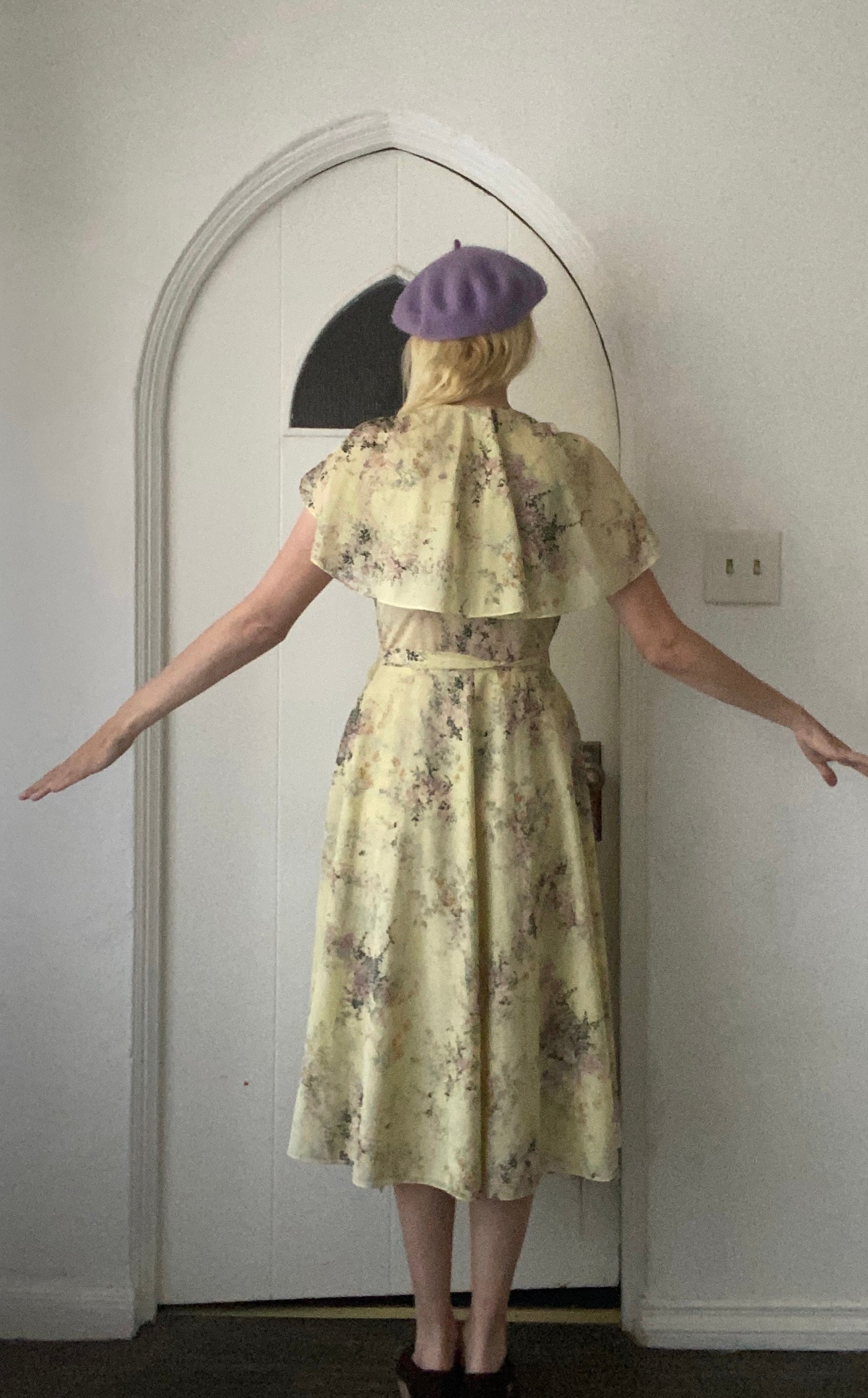Pale yellow with purple lilac floral print. Sleeveless with cape floating over. Attached wrap belt. Ties on side. Semi sheer poly fabric. Tie accent on shoulders.