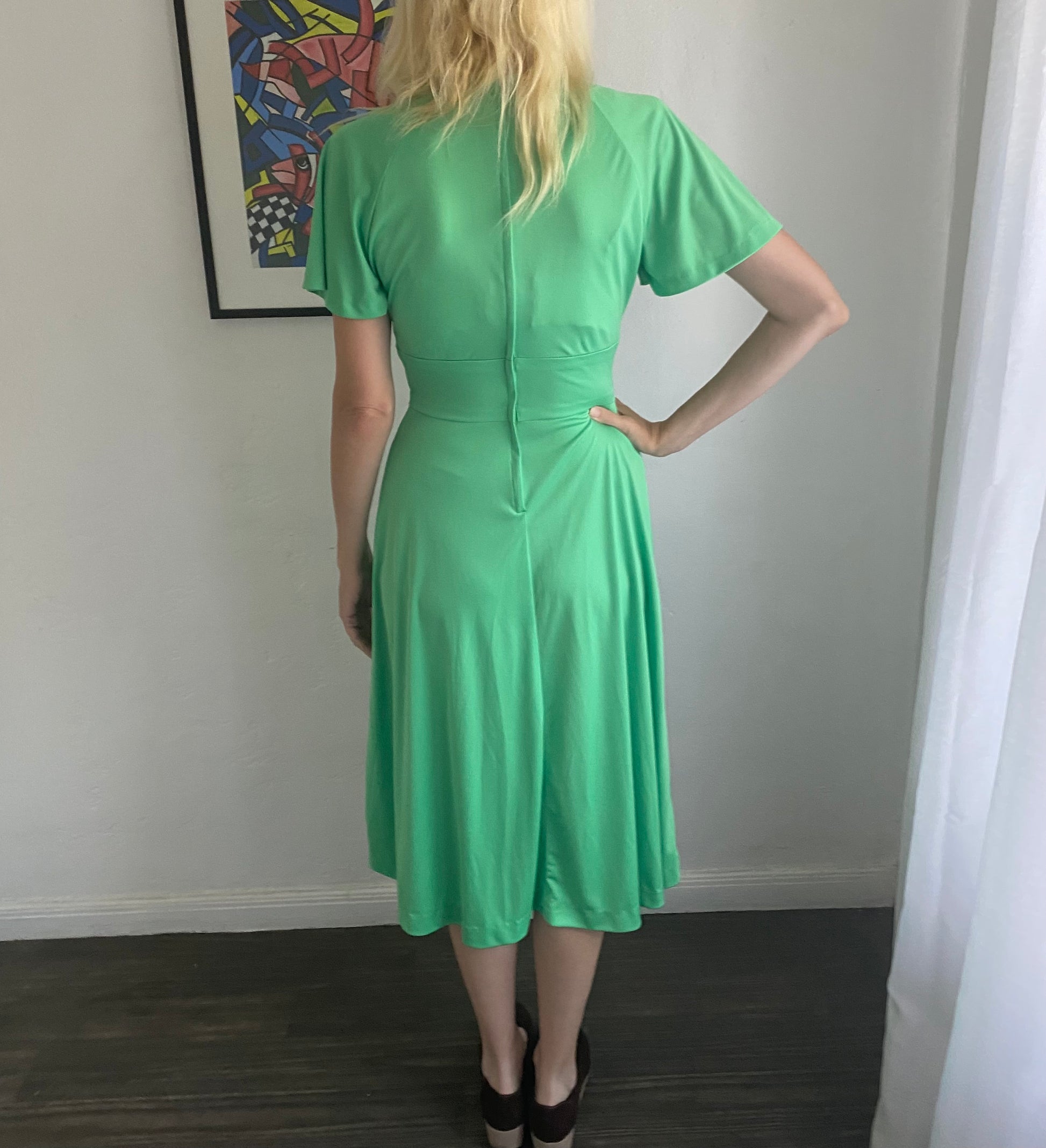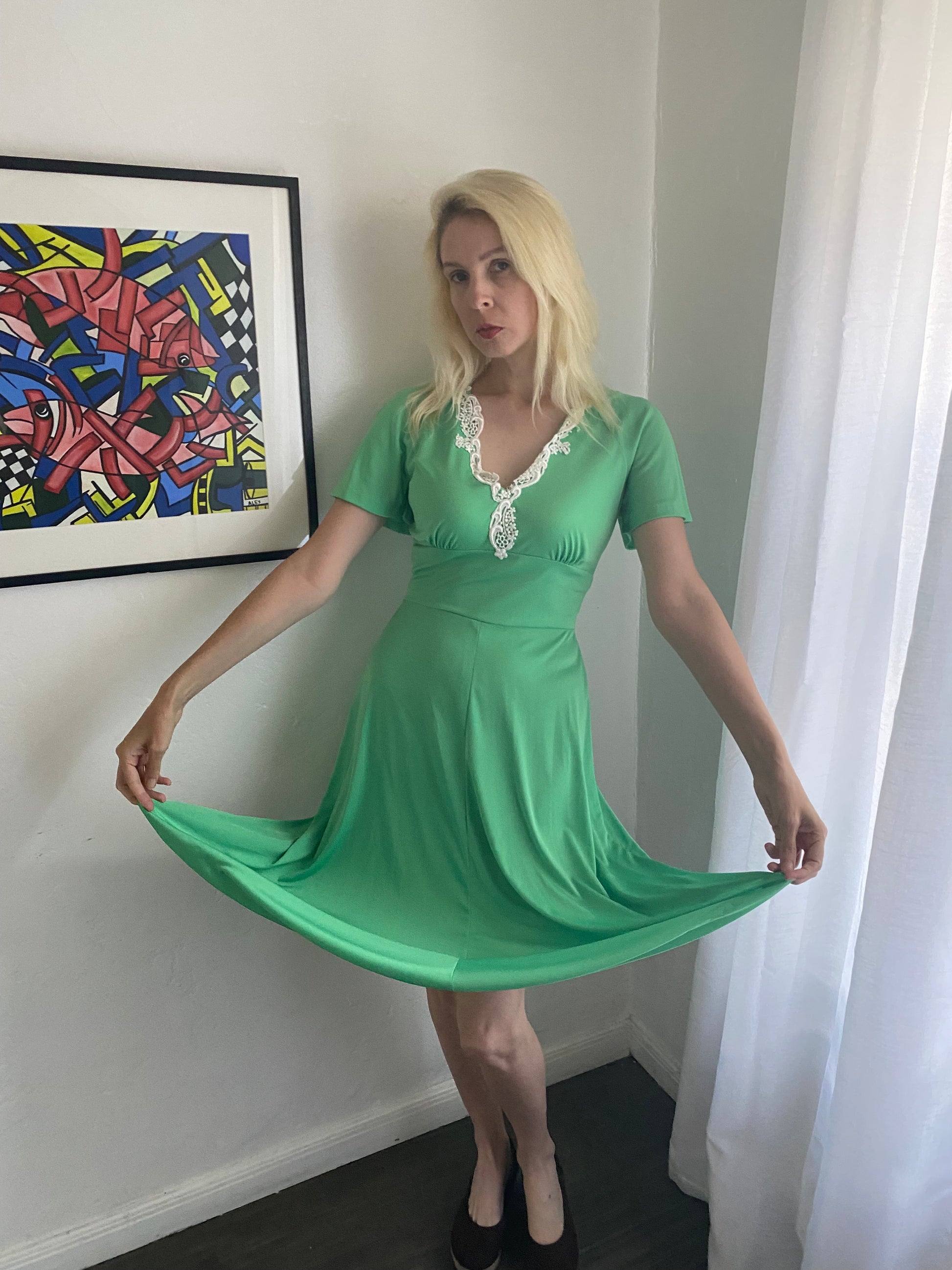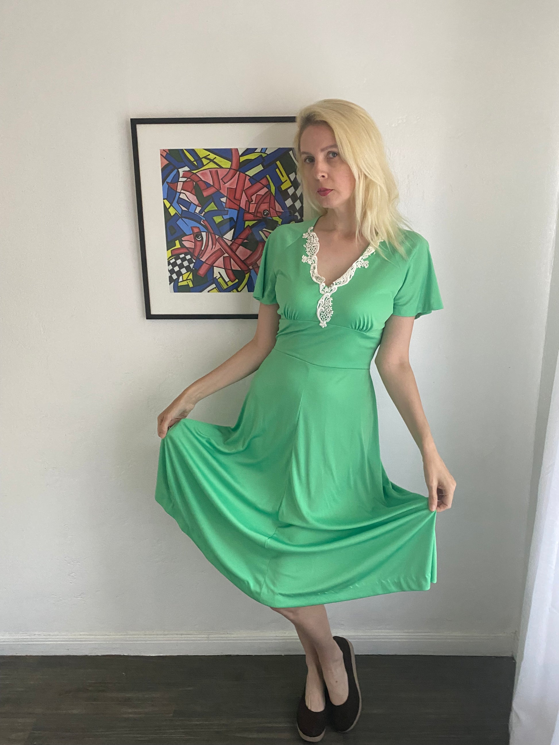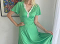 Vintage one of a kind handmade dress. Green poly fabric. Back zip closure. White lace neckline. V neck High waist. Short sleeve